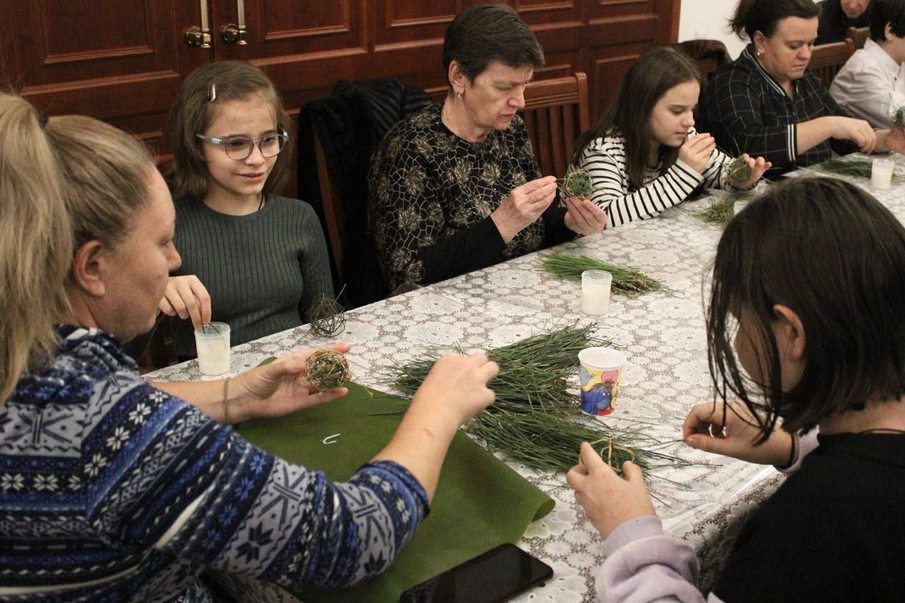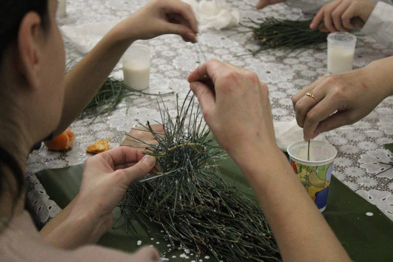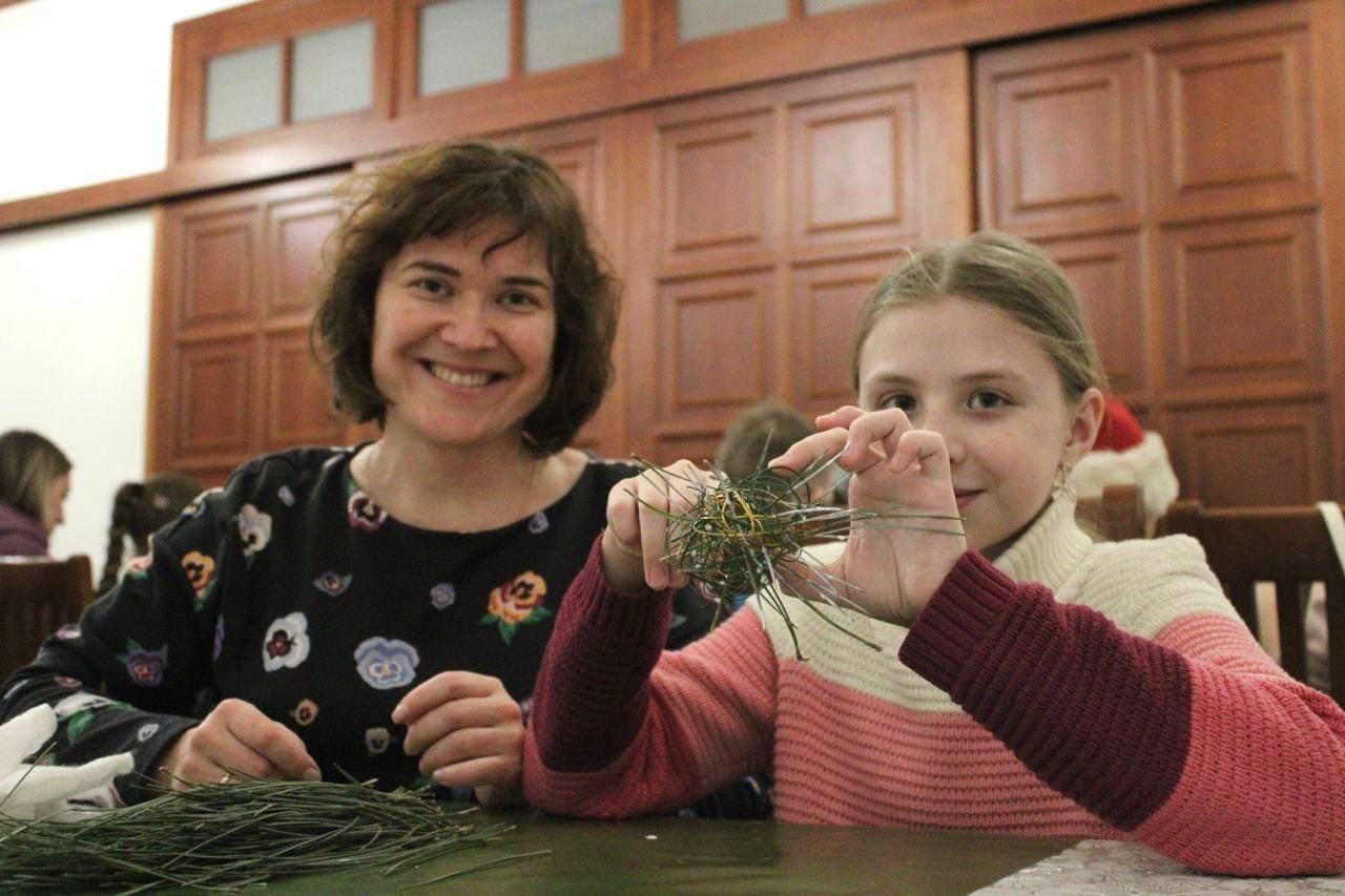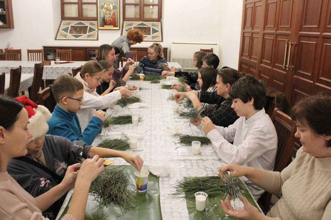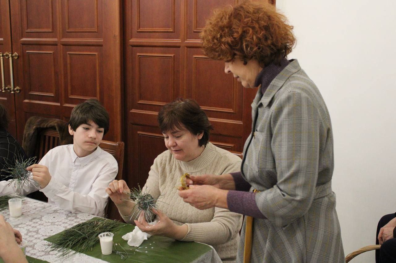 Воспитанники старших групп воскресной школы вместе с родителями присоединились к изготовлению праздничных украшений под руководством приходского флориста Валерии Букиной.