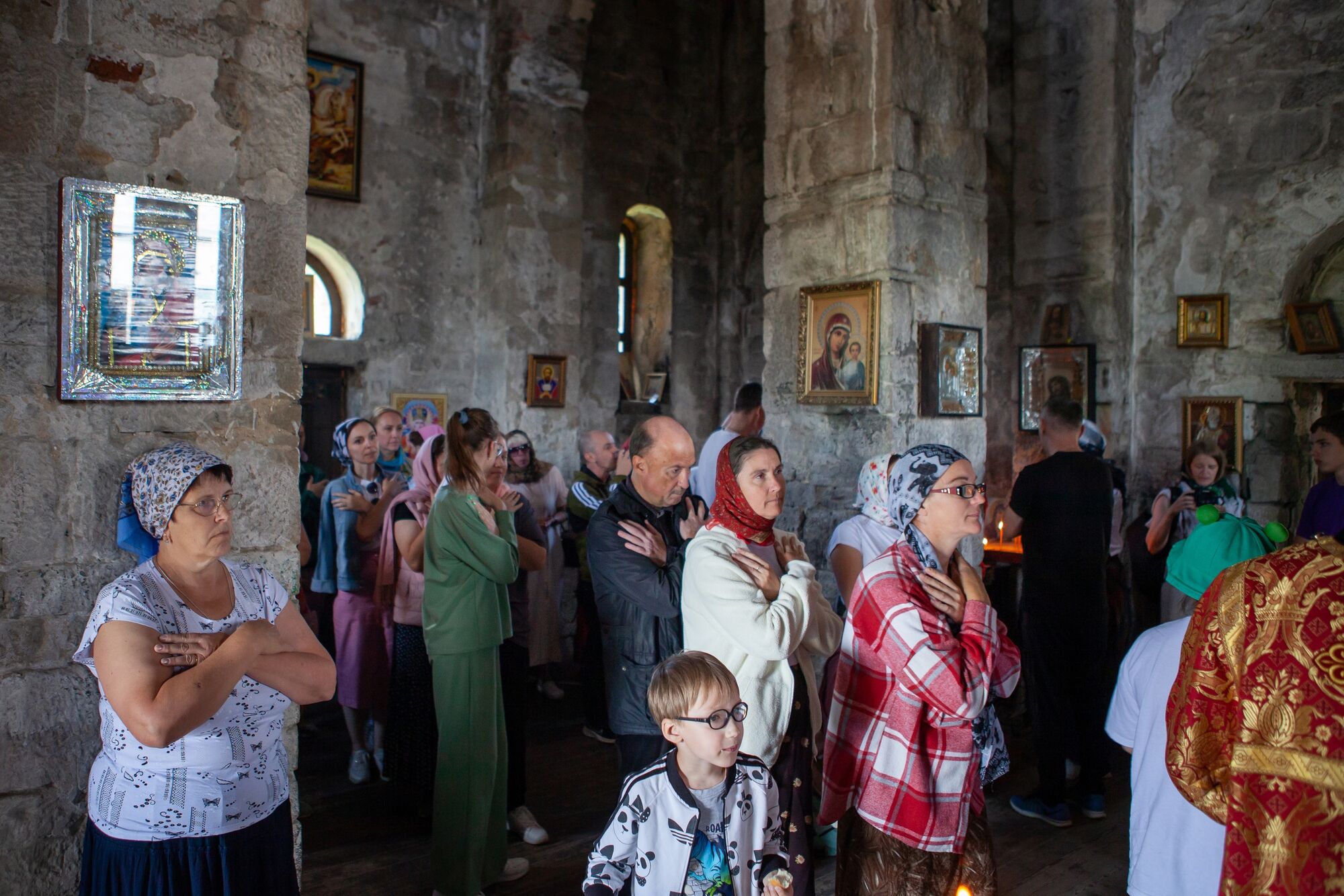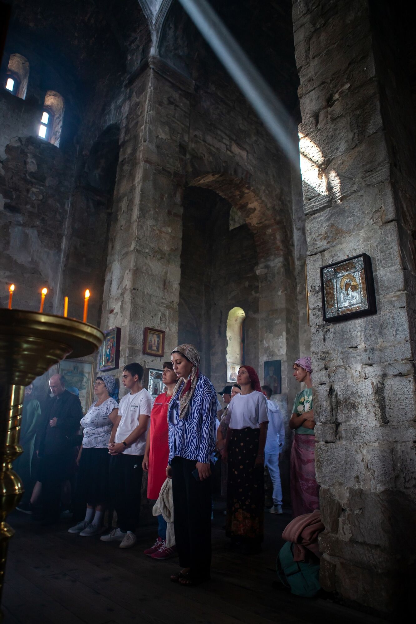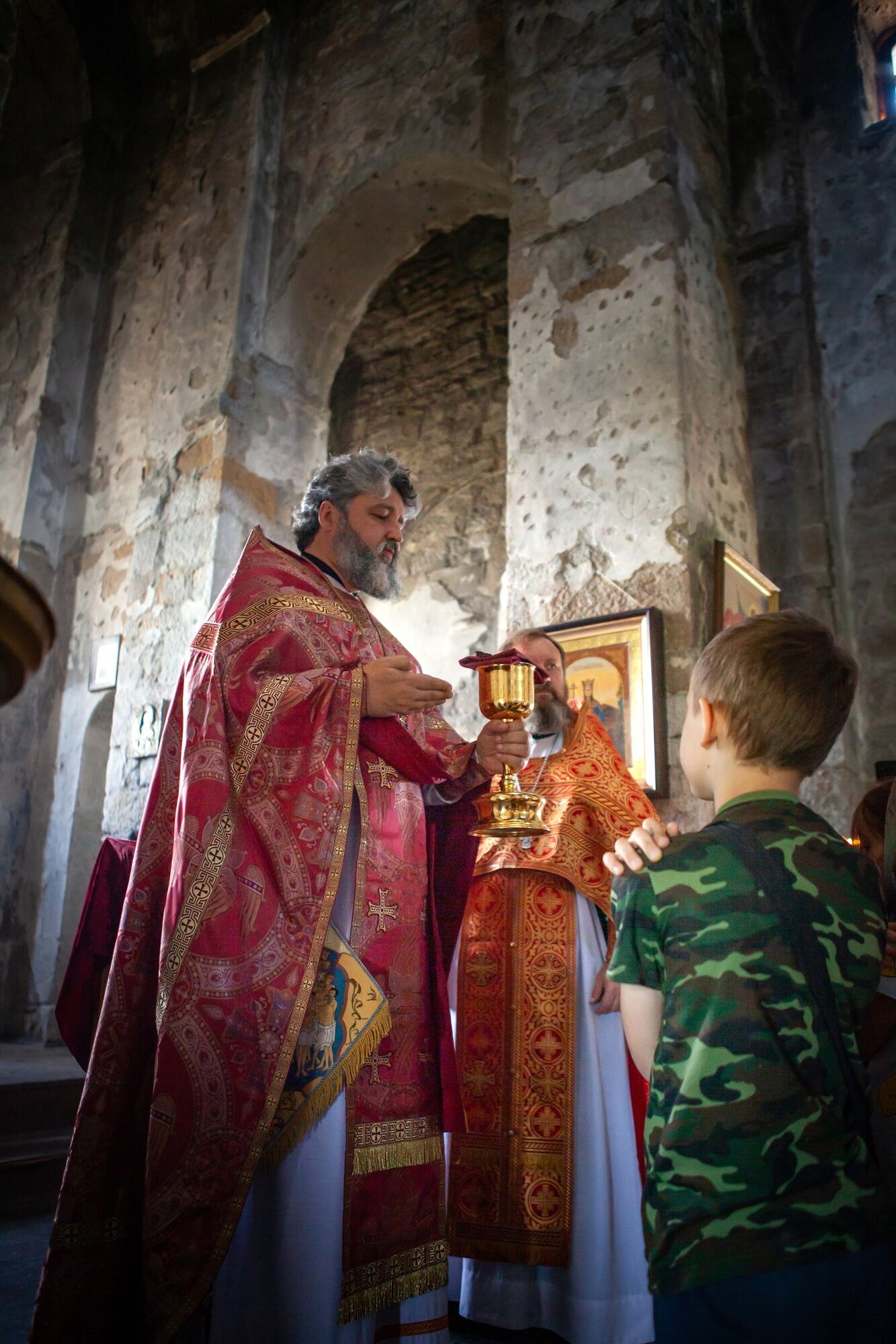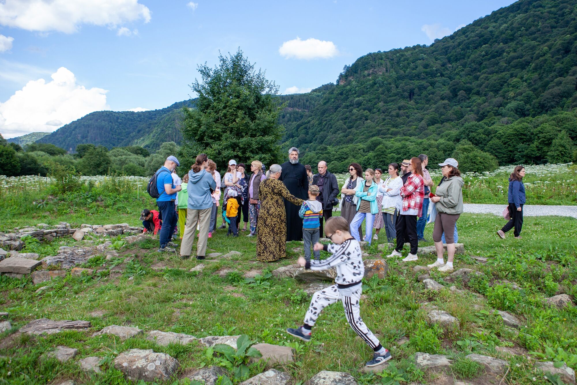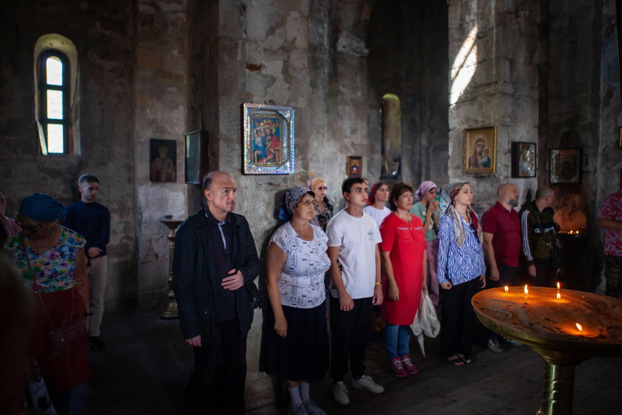 Центральным событием поездки стала Божественная литургия в Георгиевском (Шоанском) храме X века. Ранним утром в день памяти преподобного Сергия Радонежского и преподобномученицы великой княгини Елисаветы паломники отправились на гору Шоан у села Коста Хетагуров. Богослужение возглавил протоиерей Валерий Волощук в сослужении иерея Сергия Кропивницкого, песнопения литургии исполнил девичий хор «Русь» под управлением матушки Ксении Волощук. Счастье совместной молитвы в таком удивительном месте переполняло сердца всех паломников. Особое чувство единения вызывало то, что на момент начала богослужения мы были единственными молитвенниками в храме. Радовались мы вдохновленным лицам туристов, которые не ожидали оказаться на богослужении и слышать проникновенные слова молитв и песнопений.