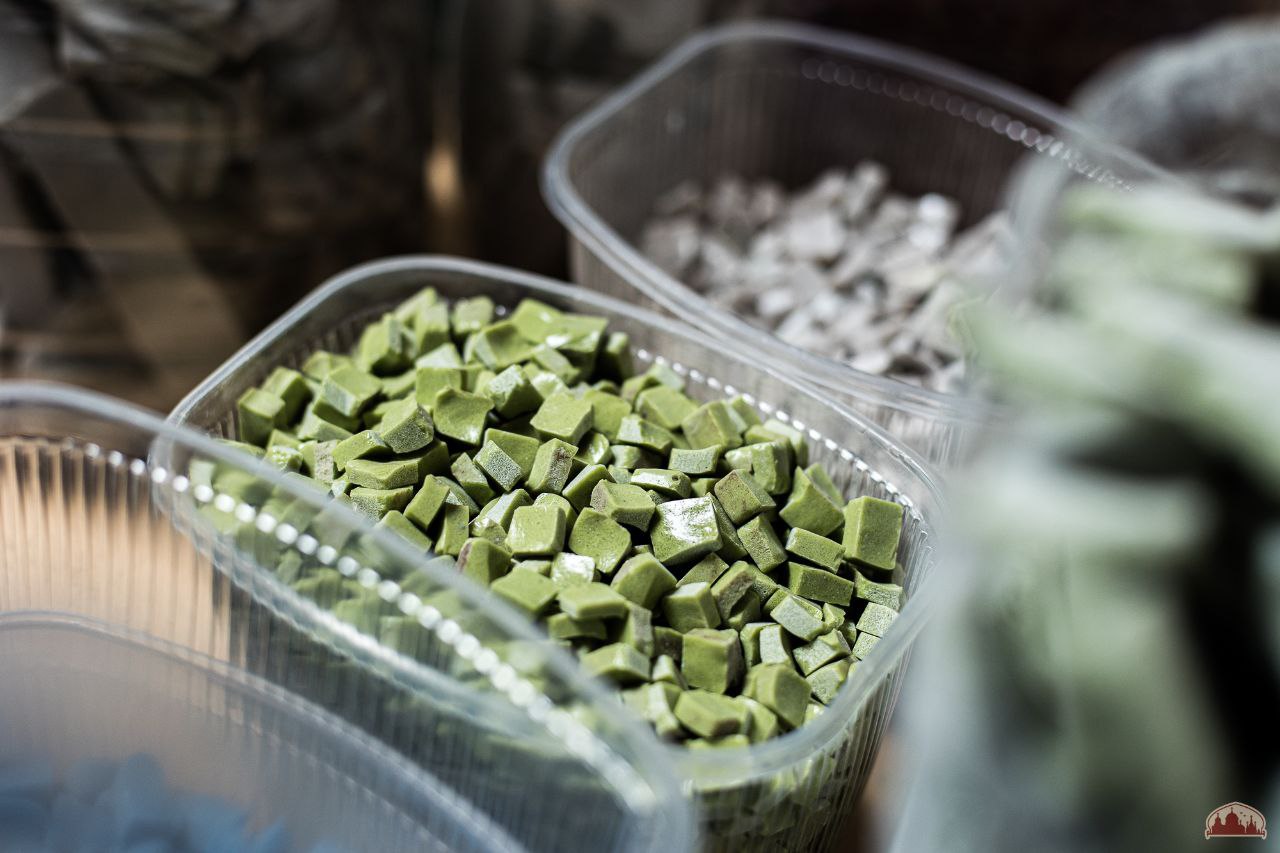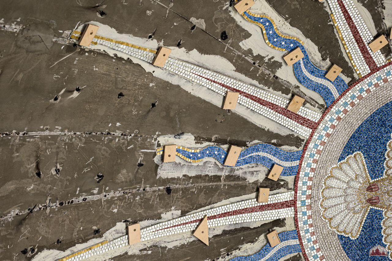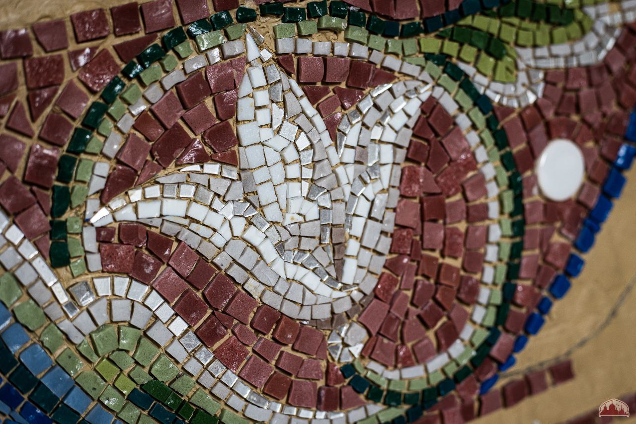 Над работой трудится мастер-мозаичист Ксения, которая не только умело создаёт мозаику, но собственноручно раскалывает большие куски смальты на множество мелких деталей.
