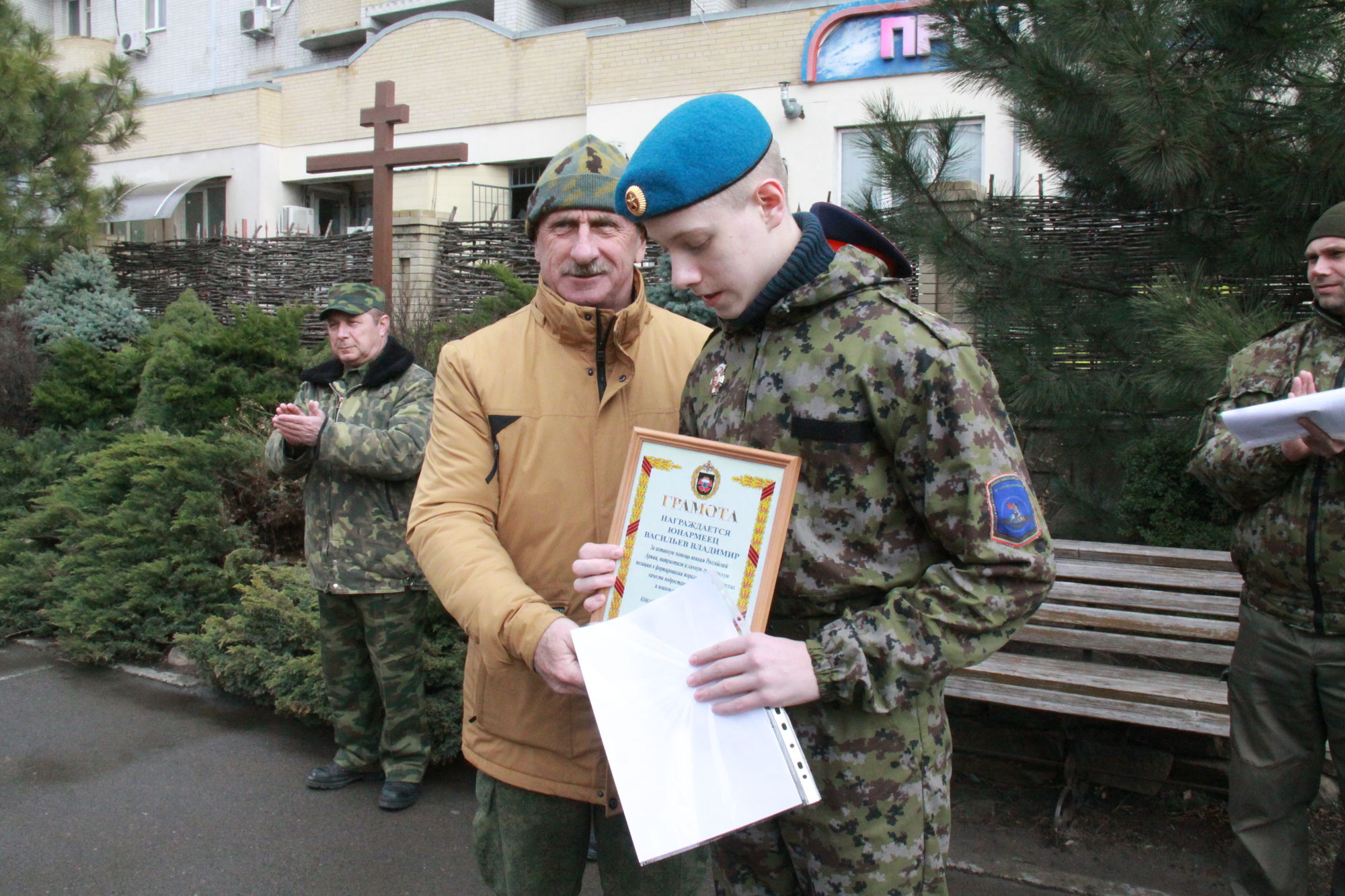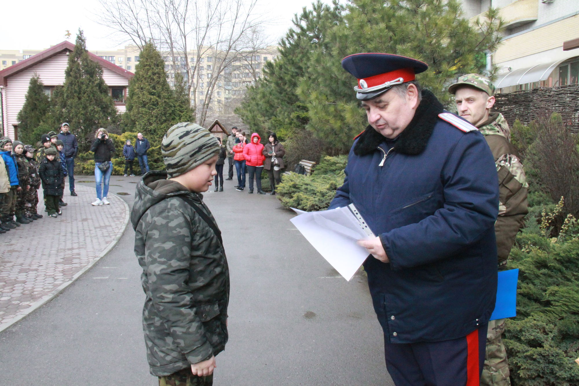 На торжественном построении пятерым юным защитникам Отечества, входящим в состав казачьей-юнармейской полусотни Его Императорского Высочества наследника цесаревича лейб-гвардии атаманского полка, приказом атамана Ростовского казачьего округа Всевеликого Войска Донского полковника Могильного Виктора Николаевича были присвоены казачьи чины младших командиров, приказных и младшего урядника. Приказ был зачитан первым заместителем (товарищем) атамана полковником Момот Геннадием Владимировичем.