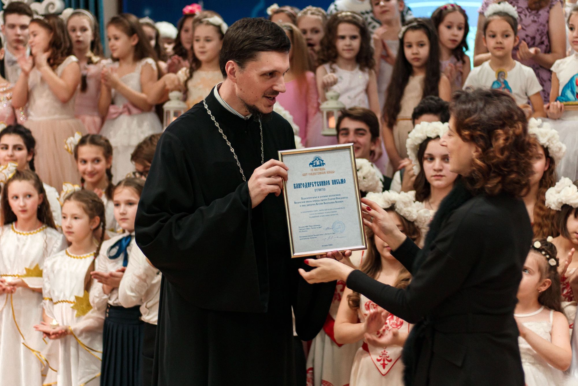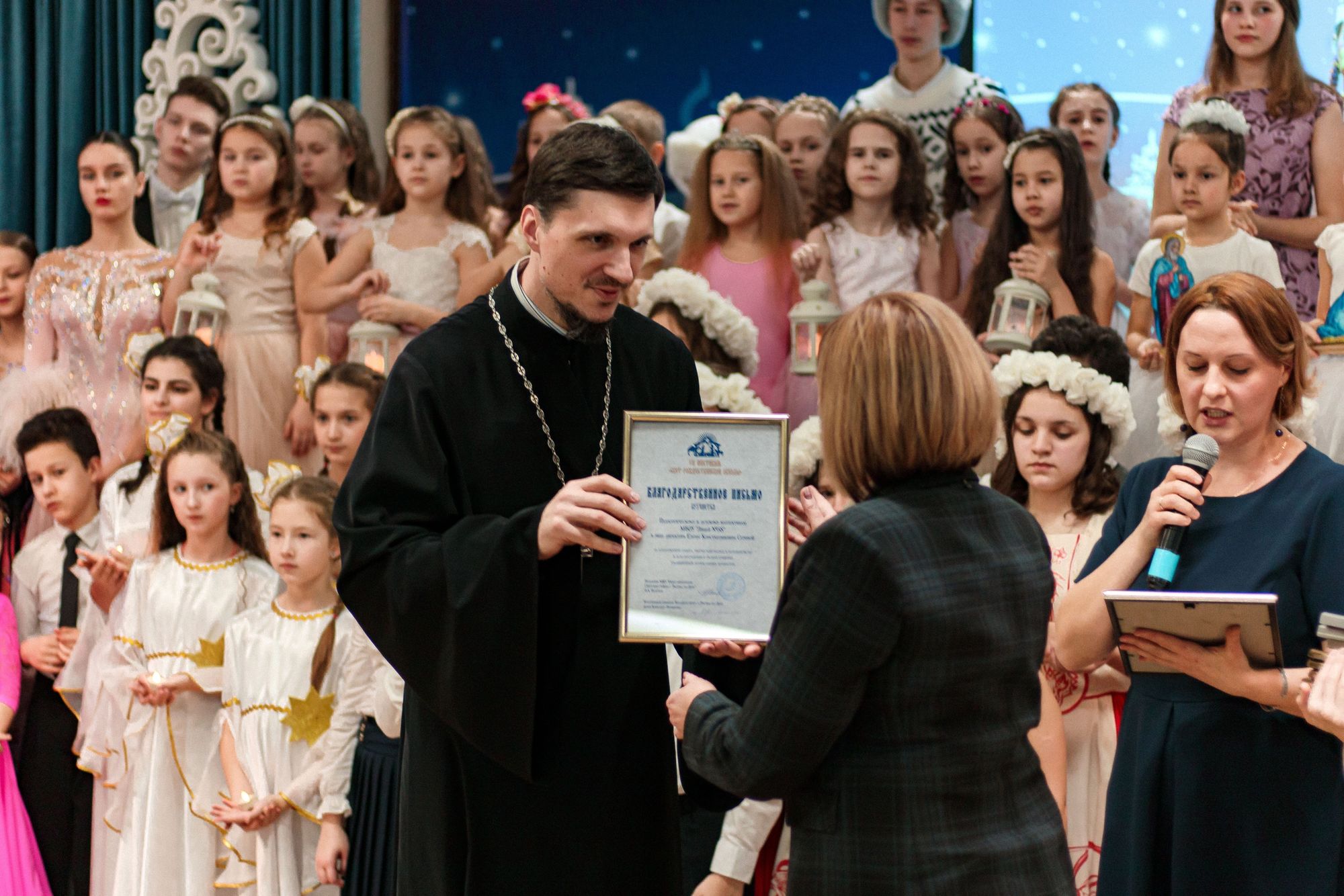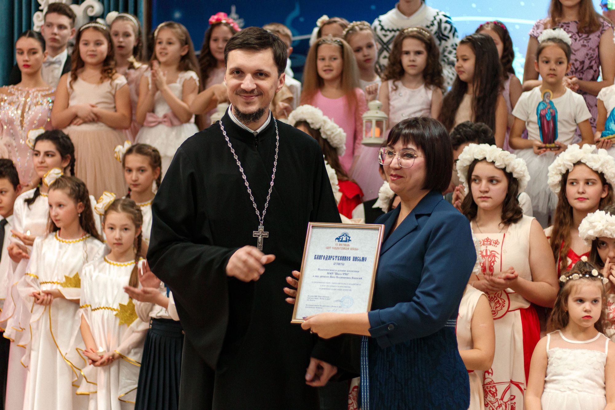 В финале праздника звучали слова благодарности и признательности в адрес организаторов и участников. Благочинный приходов Западного округа иерей Александр Литвиненко вручил благодарственные письма руководителям образовательных учреждений за плодотворную работу педагогических и детских коллективов, в том числе и руководителю нашей воскресной школы К.В.Волощук.