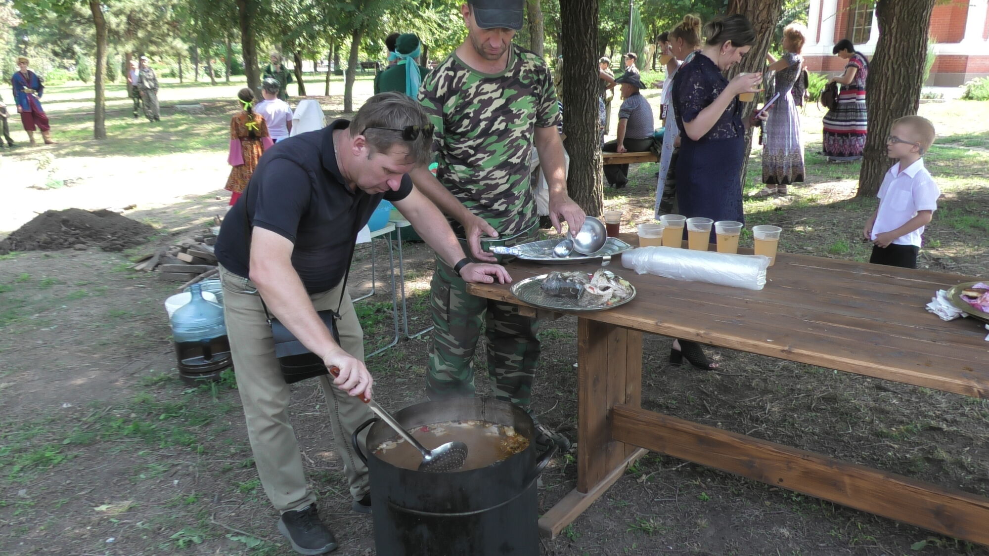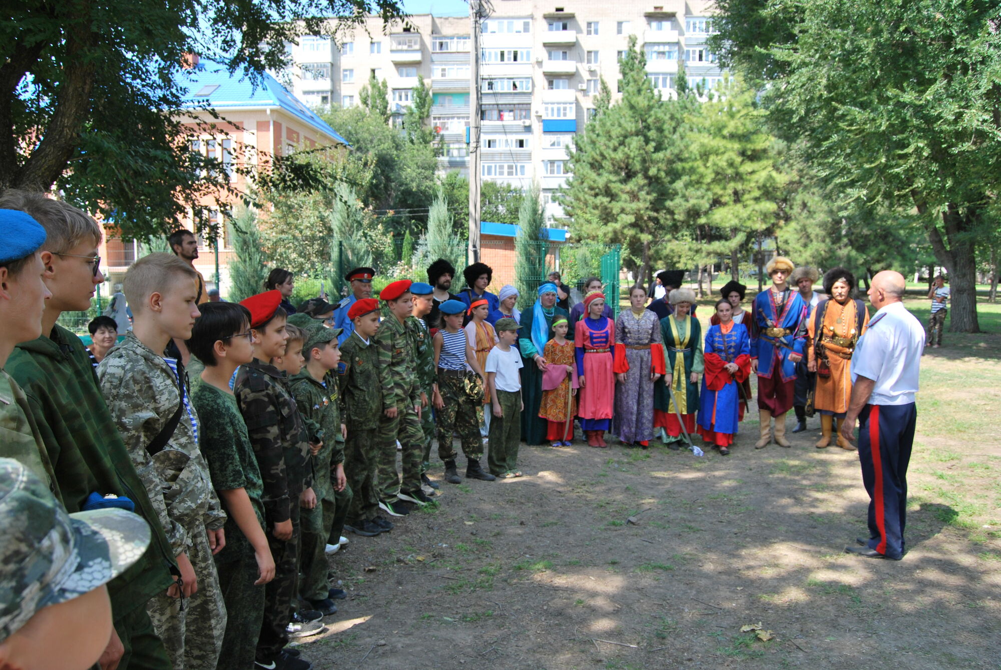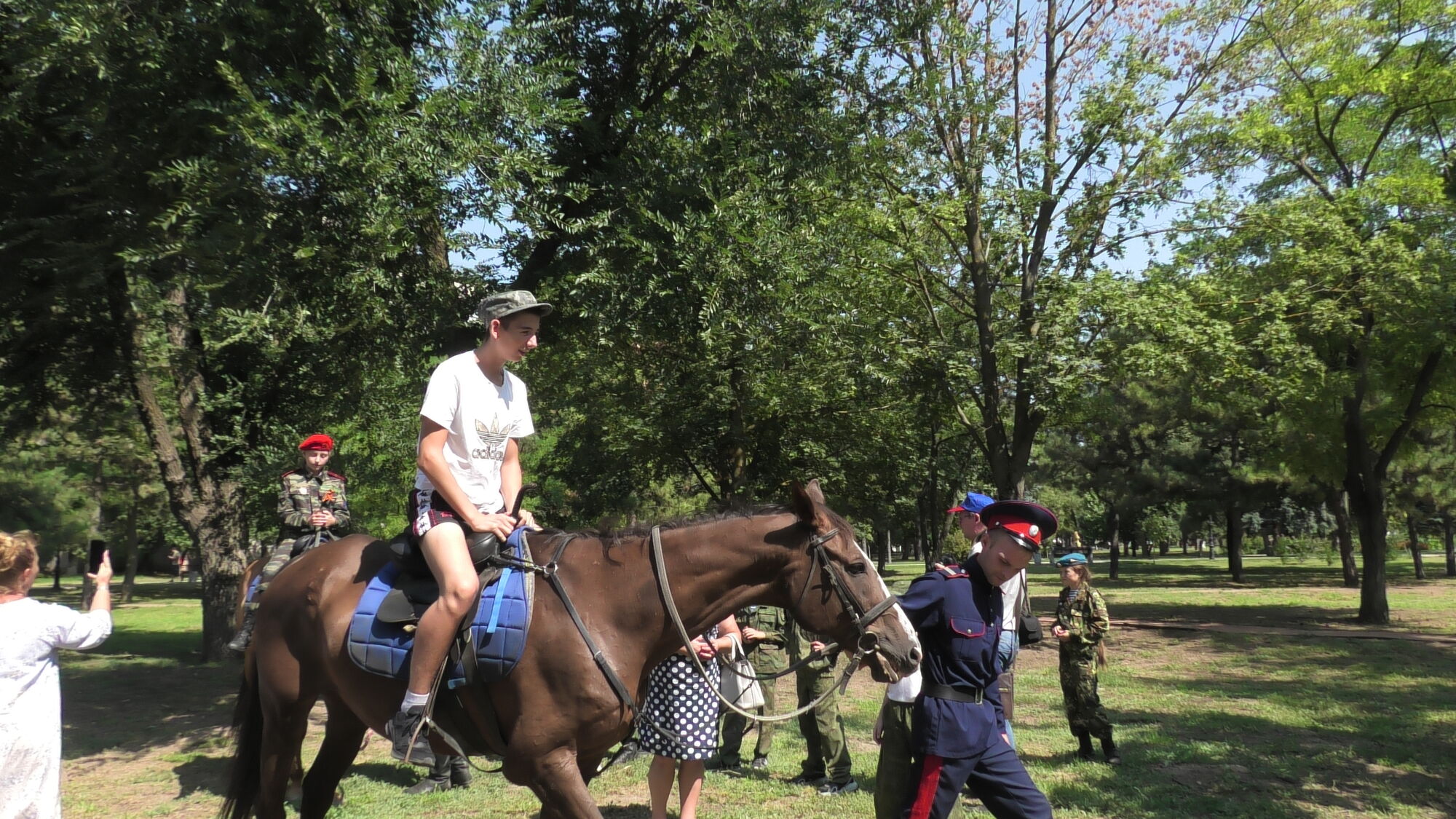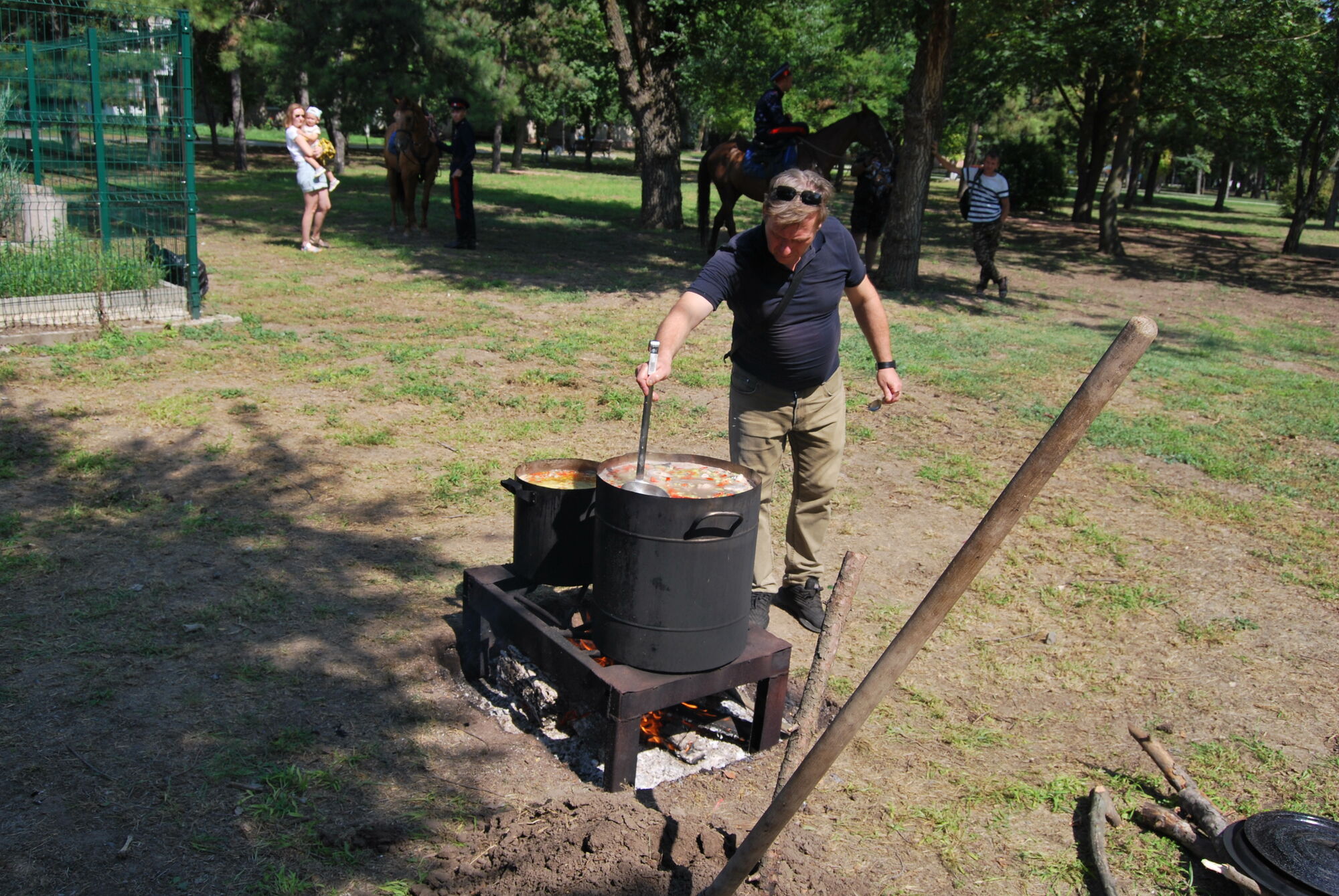 На подворье Храма нас встречал руководитель военно-исторического клуба «Казачья Слава» со своим коллективом подъесаул Саманев С.Г. Казаки и казачки клуба провели мастер-класс по приготовлению традиционных казачьих блюд в полевых условиях (донской ухи, шулюма, сладостей, прохладительных напитков), а также костюмированный мастер-класс по фланкировке казачьей шашкой, упражнения с кинжалом и кинжальный бой! Особенно понравилось нашим воспитанникам участие в подвижных казачьих играх «Третий лишний», «Платочек», «Веселые палочки». Конники конного взвода города преподали нашим воспитанникам азы верховой езды на лошадях.