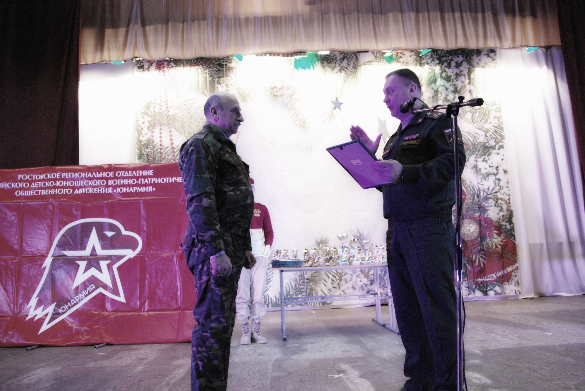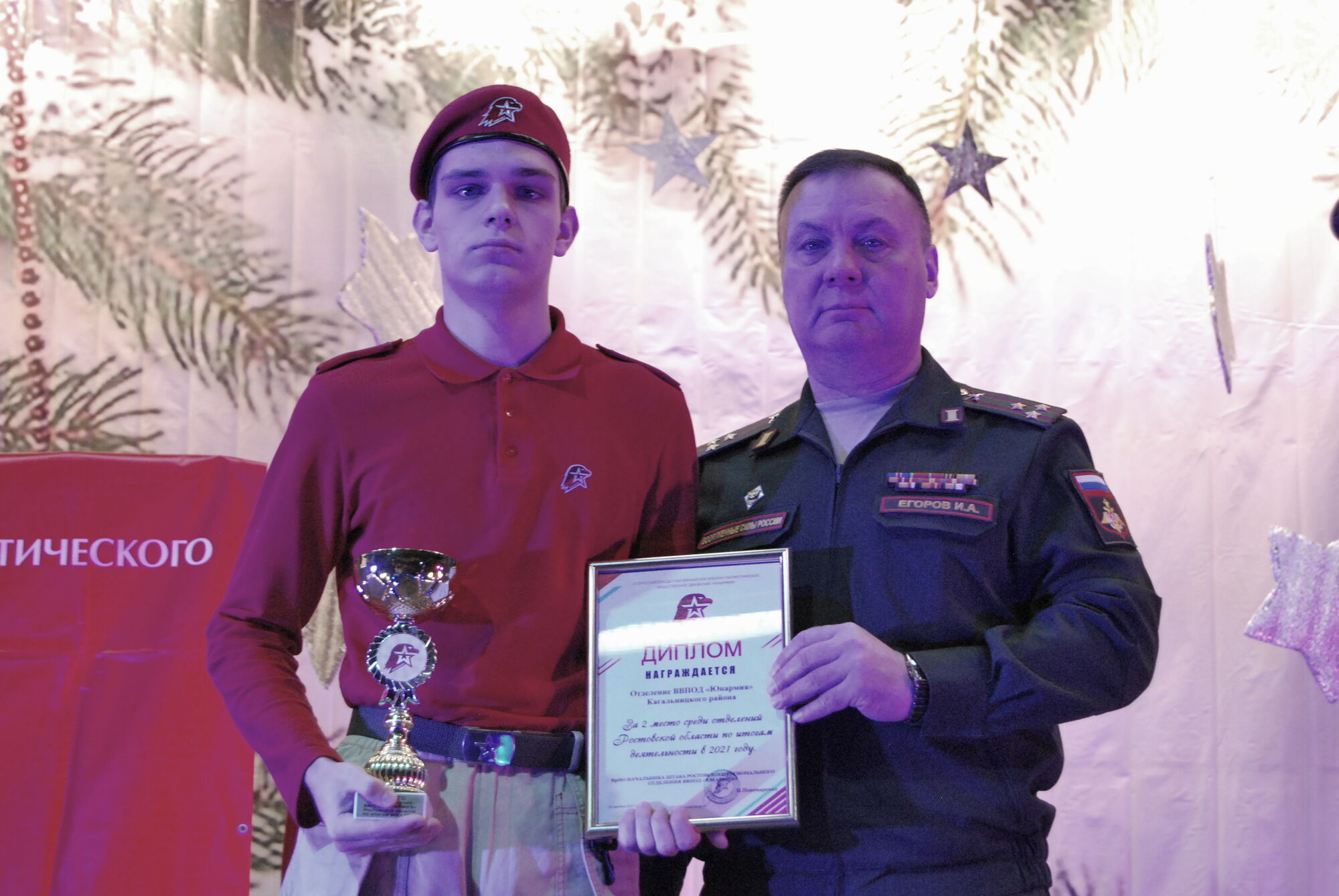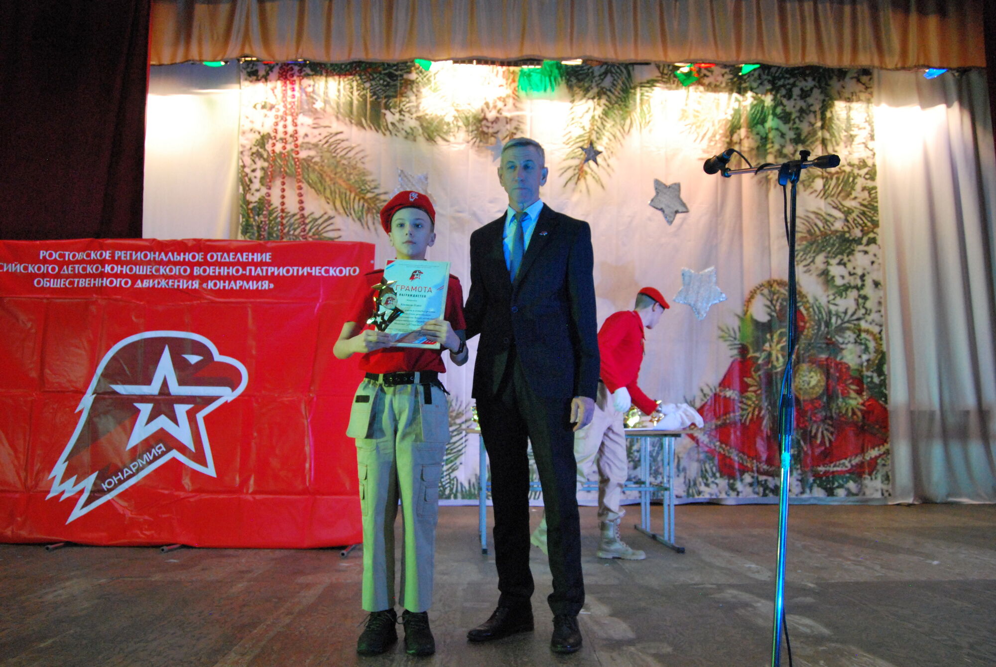 25 декабря 2021 года представители Ростовского духовно патриотического центра Святого Георгия Победоносца совместно с учащимися приходской воскресной школы храма Святого Георгия Победоносца (Главного храма Южного военного округа МО РФ) приняли участие в мероприятии, посвященном подведению итогов работы Ростовского регионального штаба Всероссийского детско-юношеского военно-патриотического общественного движения «Юнармия». В рамках проведения мероприятия прошла церемония награждения отличившихся отрядов и юнармейцев. Наш казачий-юнармейский развед-отряд «Георгиевцы» был награжден памятным знаком и благодарностью за активную военно-патриотическую работу и успехи в начальной военной подготовке к службе в Российской Армии.