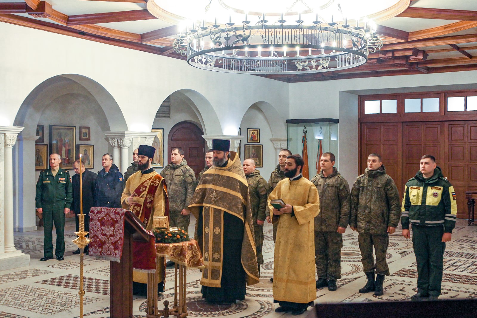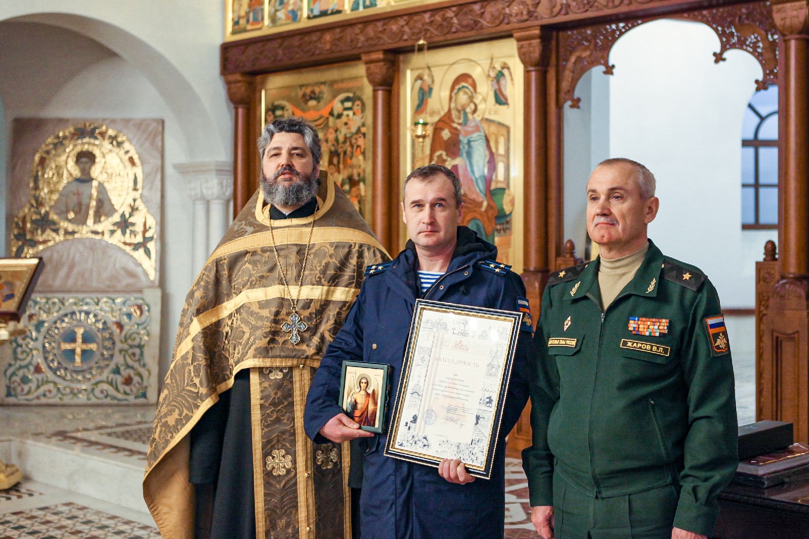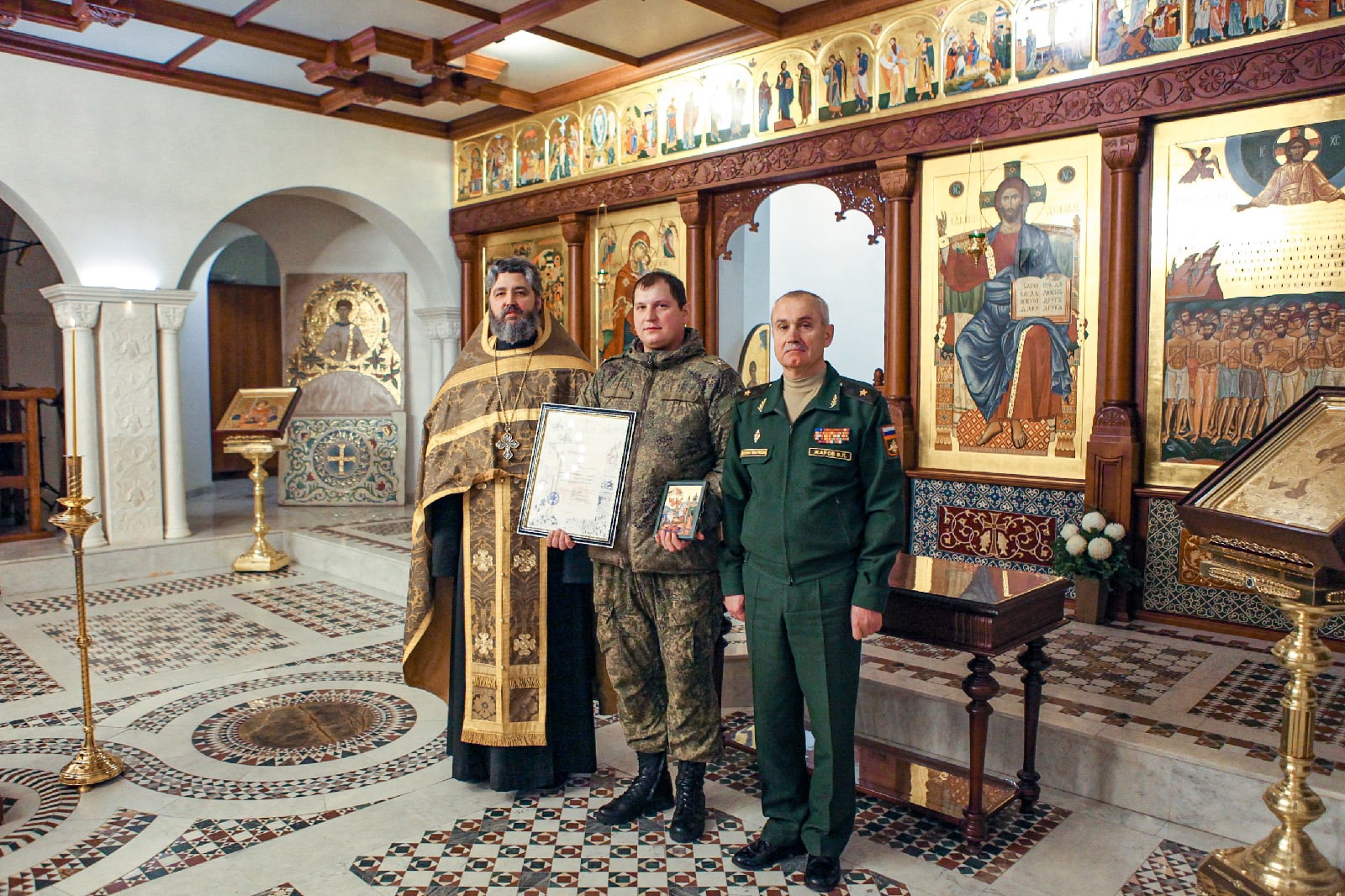 Вместе с командирами частей и офицерами, принимавшими активное участие в созидании храма святого Георгия Победоносца - главного храма Южного военного округа, помолились Господу Иисусу Христу и поблагодарили Его за радость совместных трудов, милость и помощь в благоустроении нашего общего храма и приходской территории. По окончании молебна настоятель прихода, руководитель отдела по взаимодействию с Вооруженными Силами и правоохранительными органами Ростовской-на-Дону епархии протоиерей Валерий Волощук вручил грамоты и святые образа в благодарность за труды. От лица командования Южного военного округа заместитель командующего по военно-политической работе генерал-майор Владимир Левонтьевич Жаров наградил военнослужащих памятными подарками.