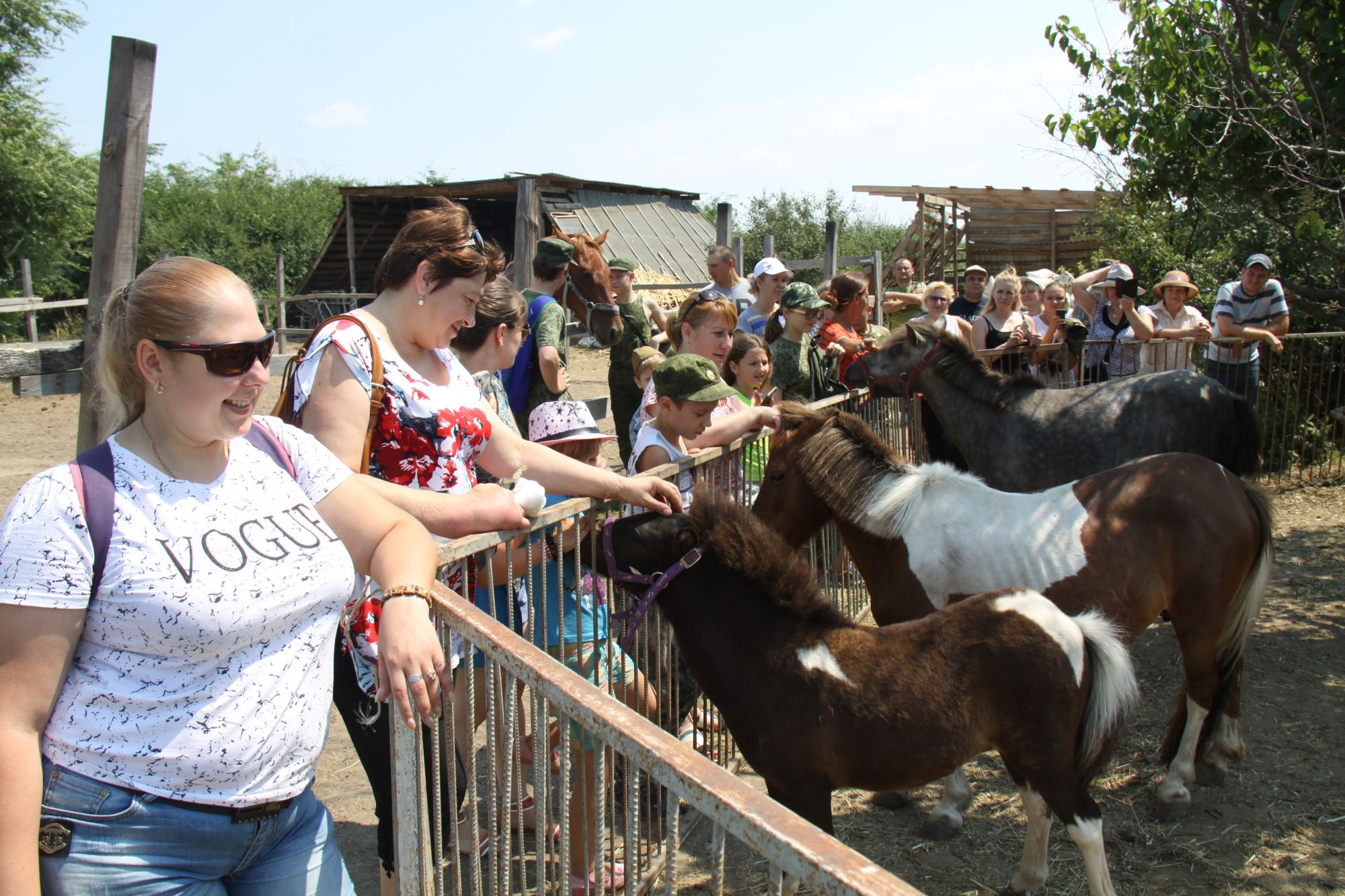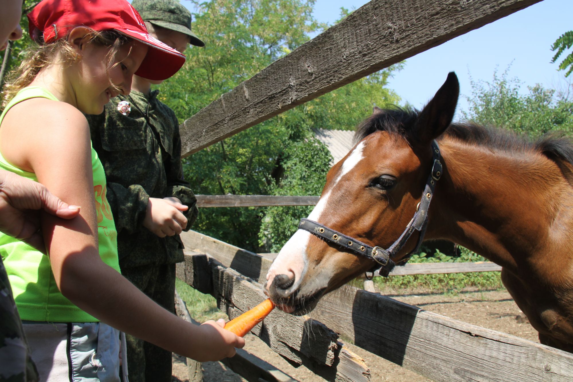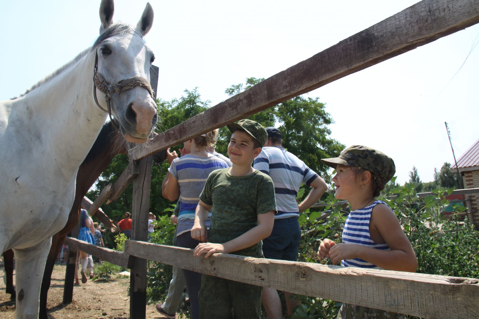В этом месте расположен конный военно-спортивный клуб «Сармат». Более тридцати лошадей содержатся в идеально подготовленных для них условиях. Дети и родители познакомились с различными породами лошадей, смогли их покормить, поучаствовать в заготовке сена, покататься верхом.