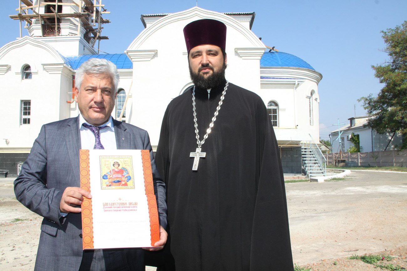 В ходе поездки состоялась запланированная встреча с главой администрации Матвеево-Курганского района Рудковским Александром Анатольевичем. Настоятель вручил Благодарственное письмо от Ростовского духовно-патриотического центра Свято-Георгиевского прихода со словами благодарности за содействие в проведении совместных мероприятий по увековечиванию памяти, погибших в Великую Отечественную войну на территории Ростовской области, воинов.