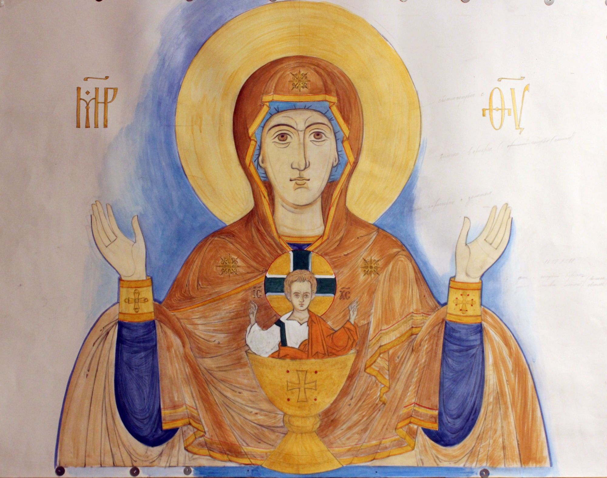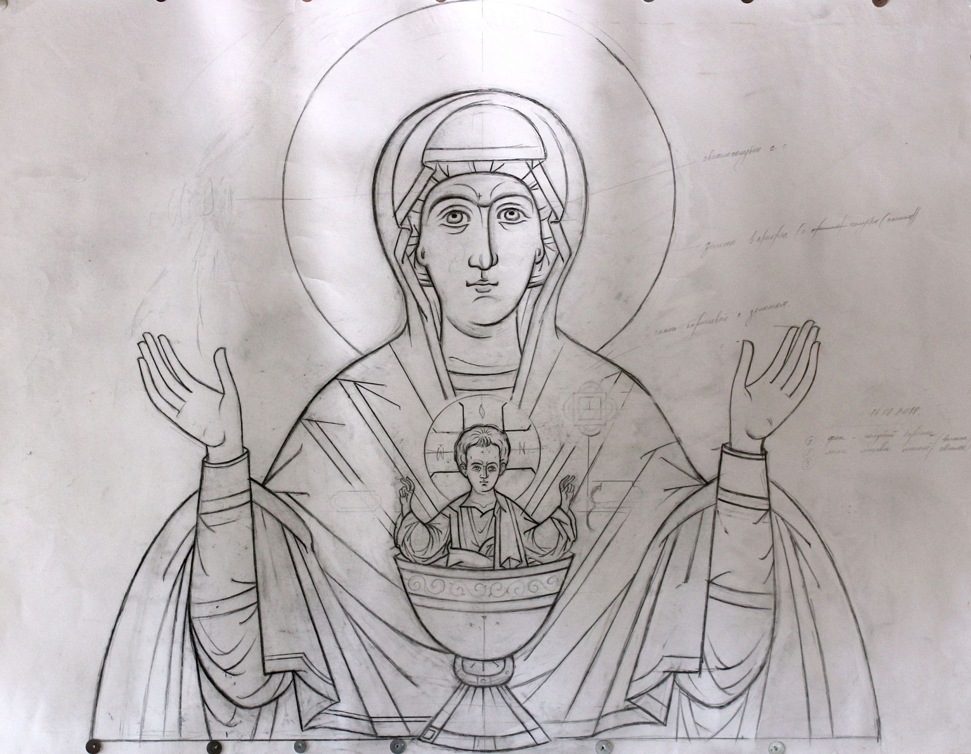 В нашей иконописной мастерской разработали эскиз вышивки Воздух с образом пресвятой Богородице Неупиваемая Чаша. Им покрывают Чашу на литургии. Владимир Мирошниченко сделал рисунок, Дмитрию Шестопалову настоятель поручил подобрать по цвету нитки, и в эскизе нарисовать, в цвете, направление нитей. Скоро начнётся вышивка для нашего прихода!