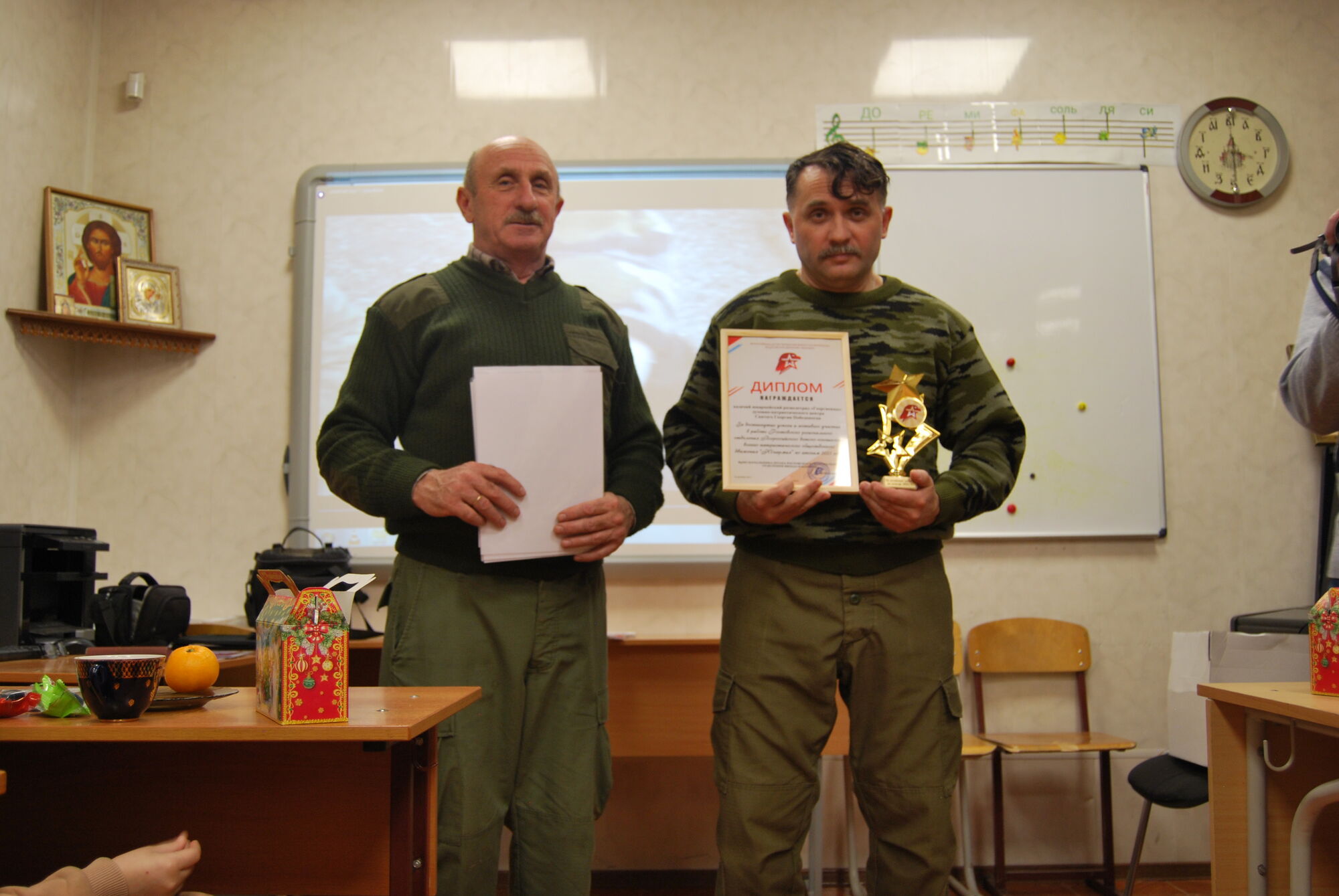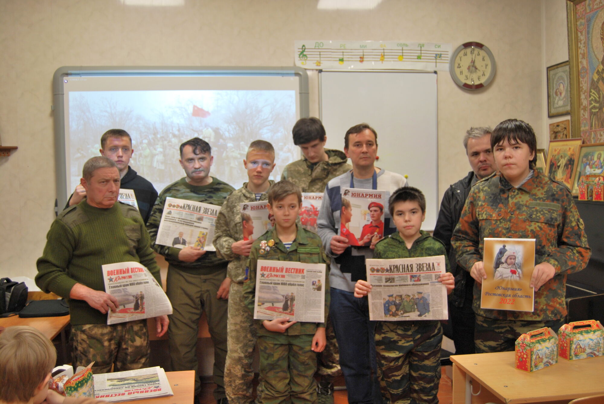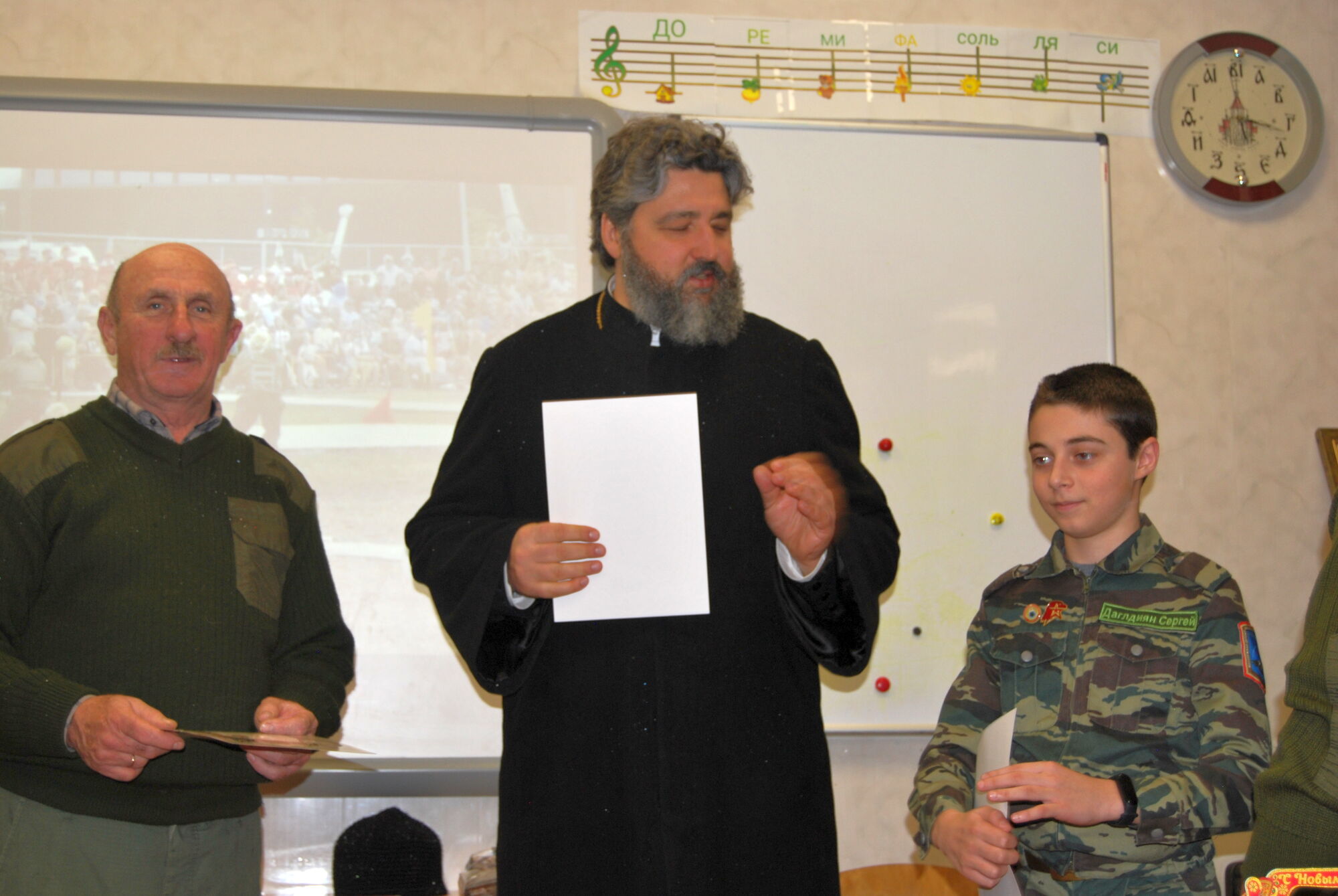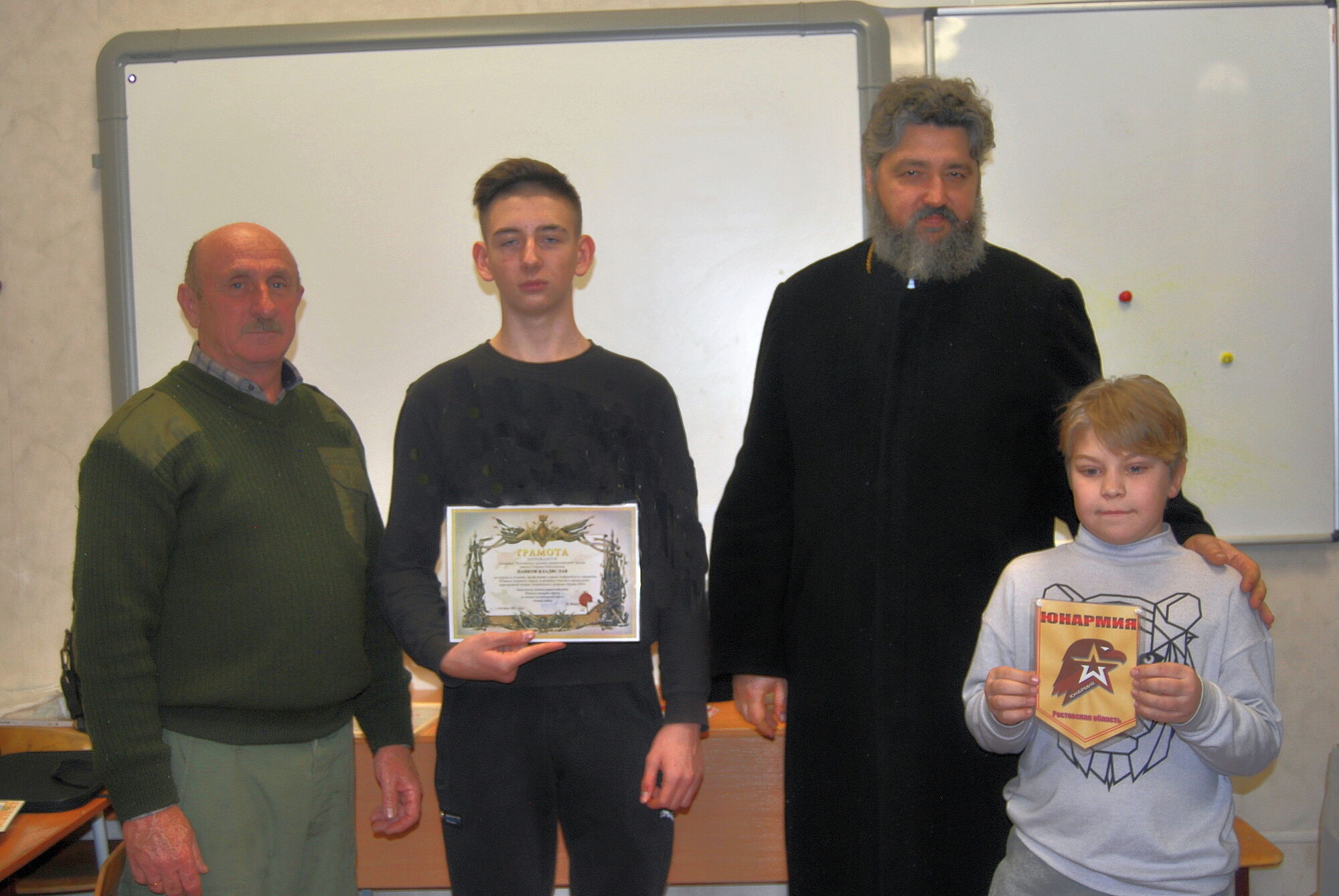 На итоговом занятии присутствовал настоятель прихода Святого Георгия Победоносца протоиерей Валерий Волощук. Отец Валерий поздравил учащихся с приближающимся Рождеством и Новым годом, пожелал духовного и телесного здоровья детям и их родителям. В ходе проведения занятий отличившимся учащимся и членам их семьи были вручены письменные благодарности от нашего настоятеля, командования подшефной воинской части, Военно-политического управления Южного военного округа Министерства обороны Российской Федерации, Регионального отделения ДОСААФ России Ростовской области, Ростовского духовно патриотического центра Святого Георгия Победоносца.