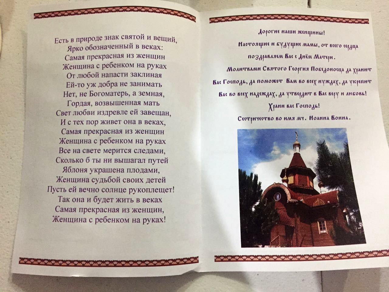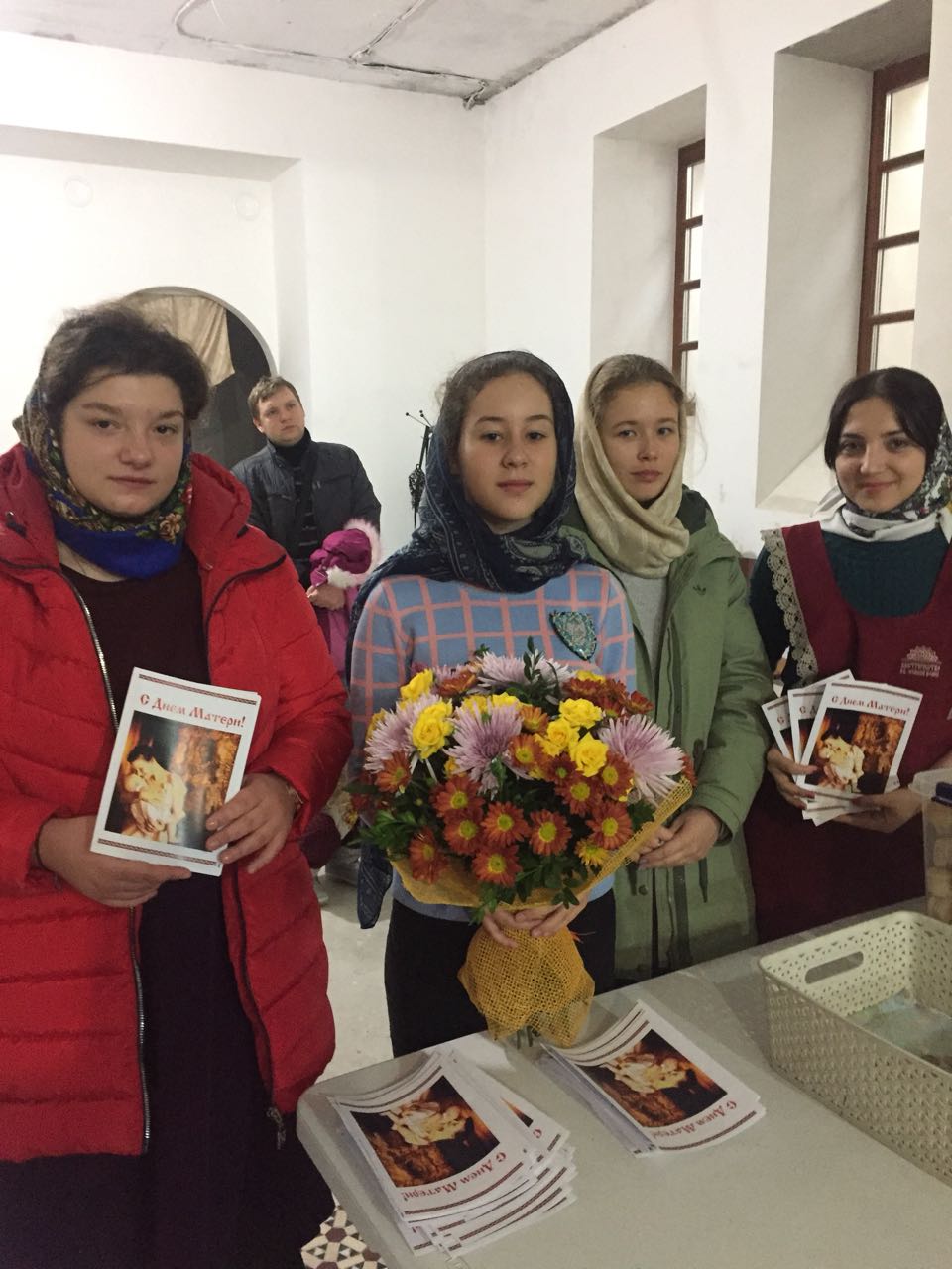 26 ноября 2017 года после Божественной литургии настоятель прихода Святого Георгия Победоносца протоиерей Валерий Волощук поздравил всех женщин с днем Матери! День матери в России отмечается в последнее воскресенье ноября. Сестры милосердия храма Иоанна Воина подготовили праздничную открытку, а ребята молодежного движения раздали всем прихожанам.