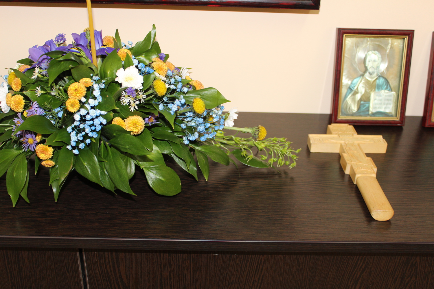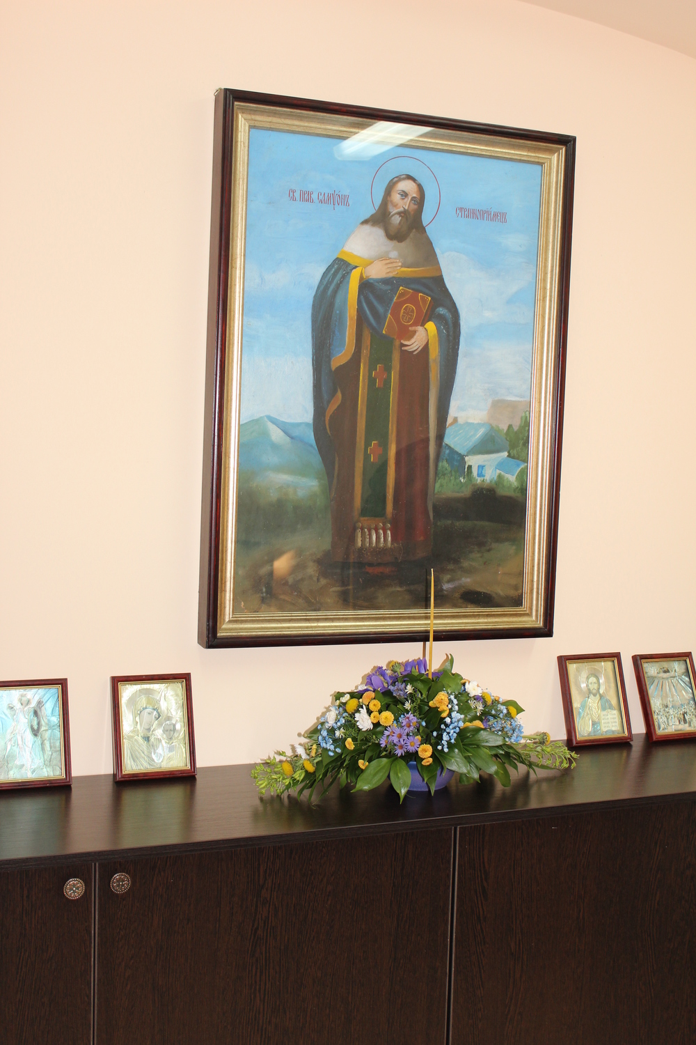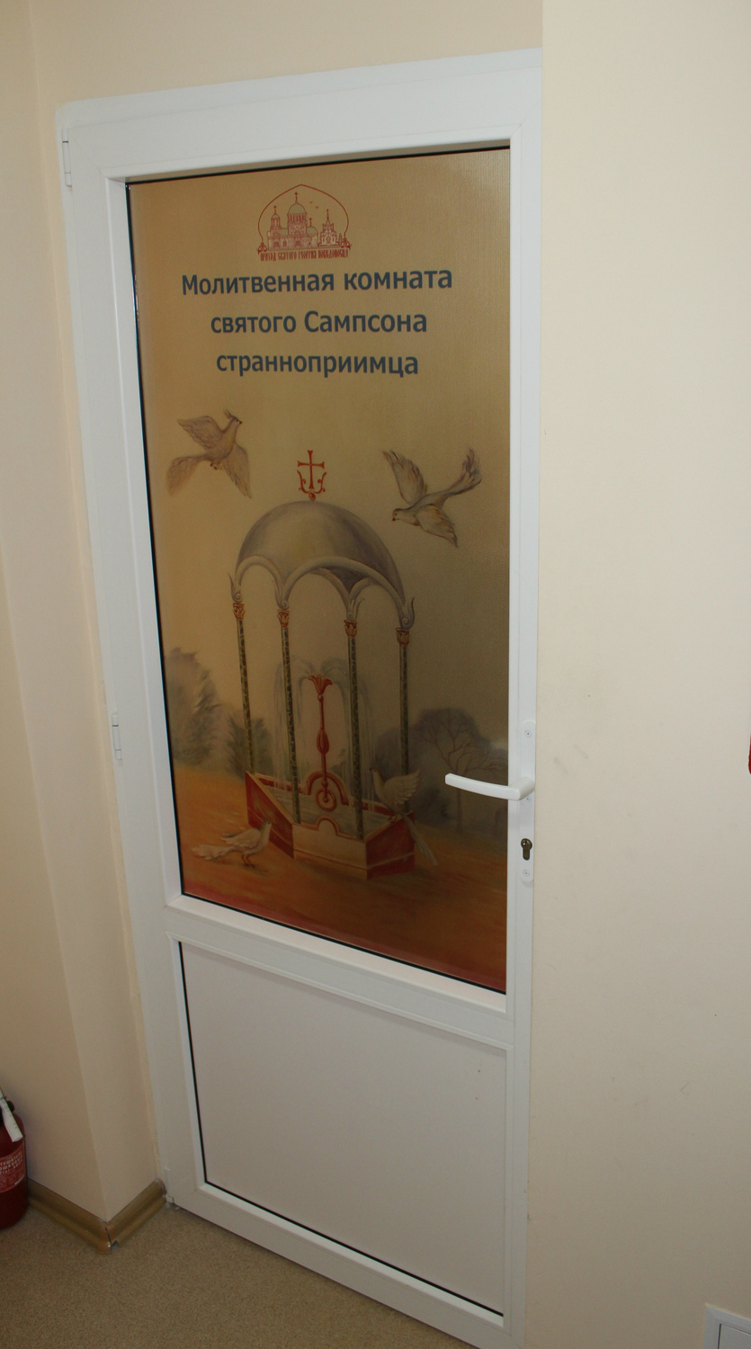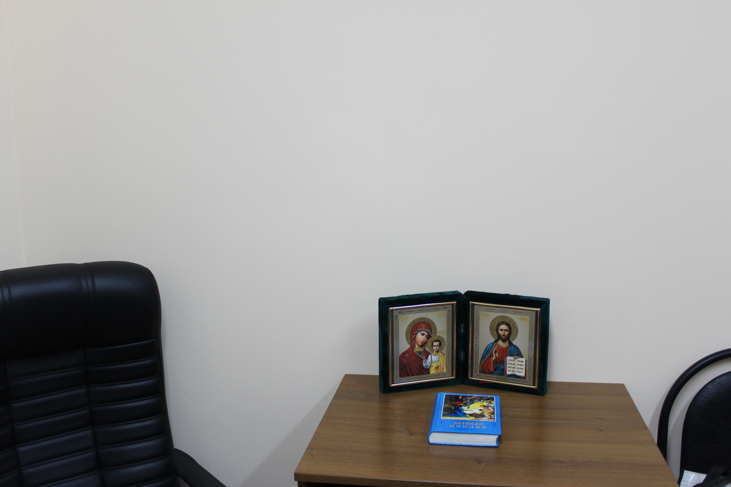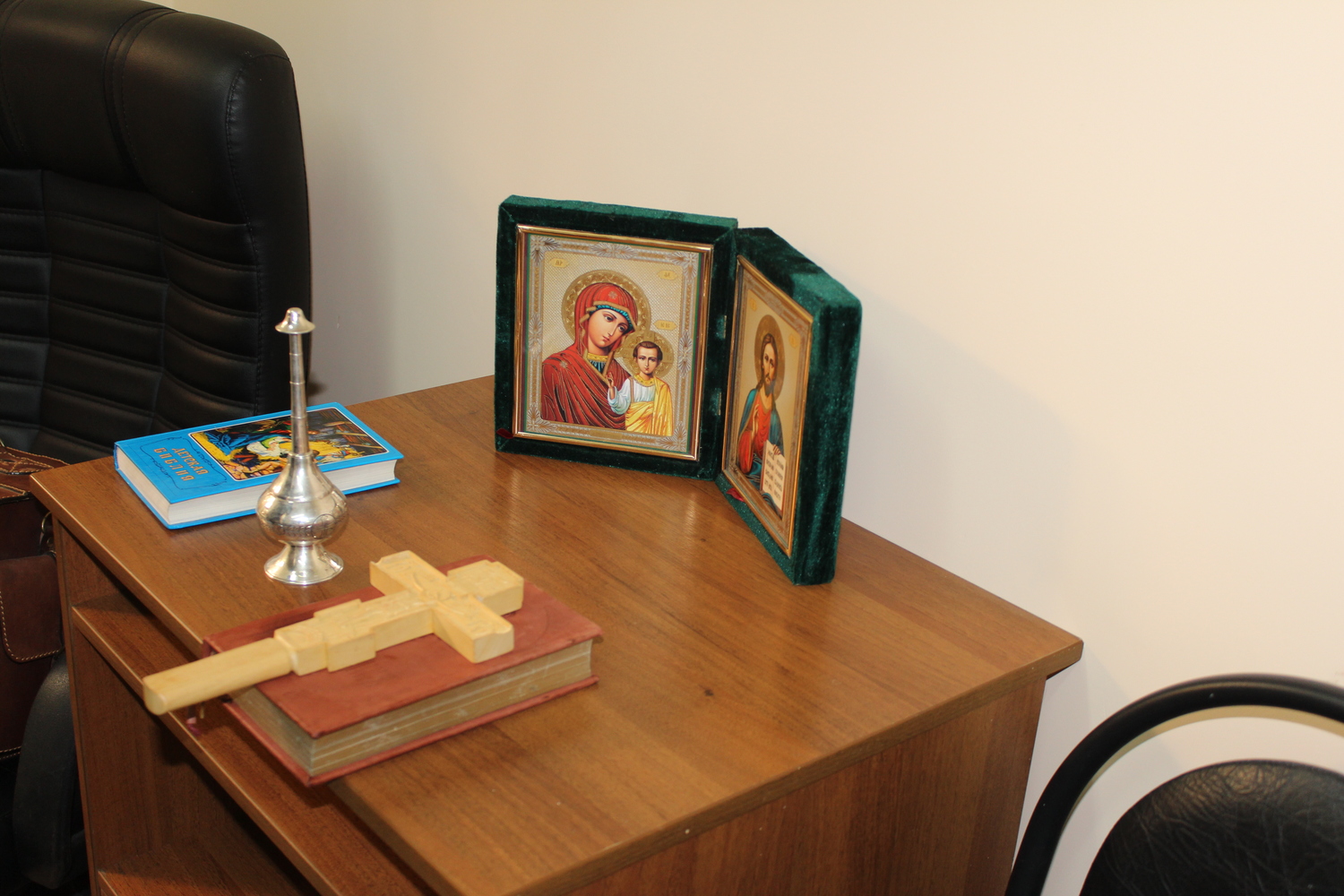 Администрация Центра обратилась с просьбой о создании молитвенной комнаты. Молебну предшествовала большая работа, проведенная нашим приходом: в иконописной мастерской был сделан проект комнаты, заказаны витражи на дверь и окно, изготовлена необходимая мебель: стеллажи для памяток и церковной литературы.