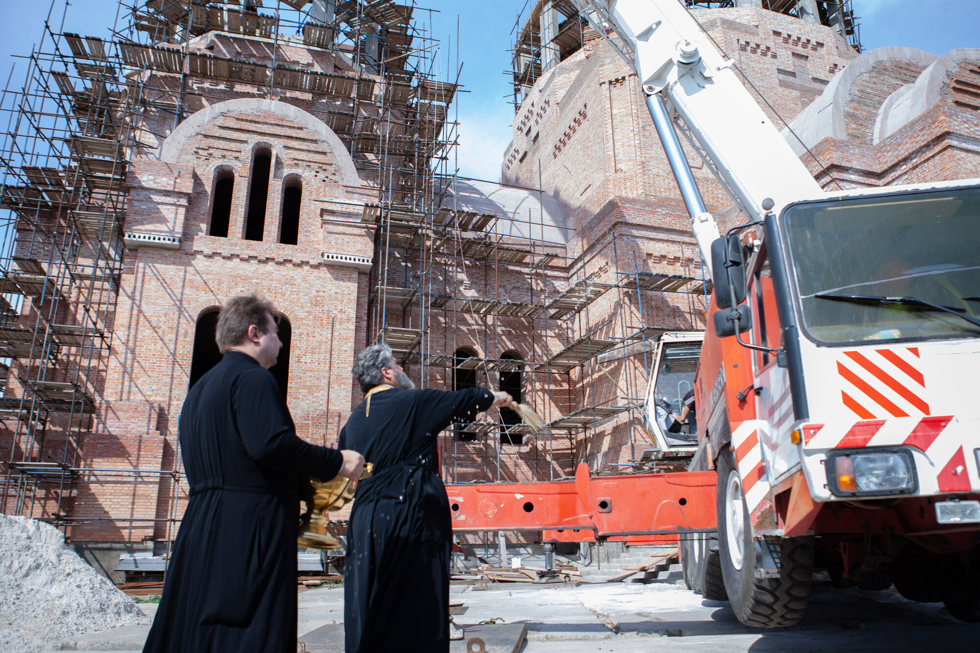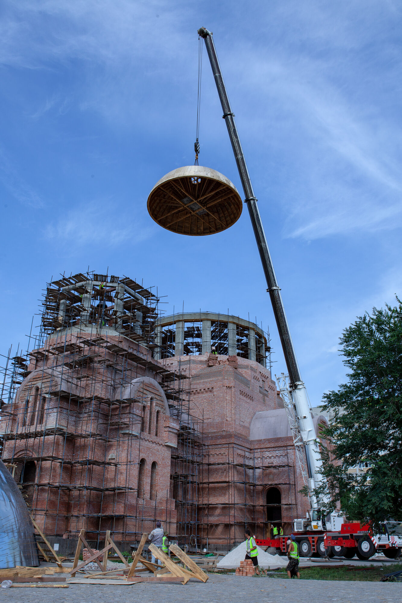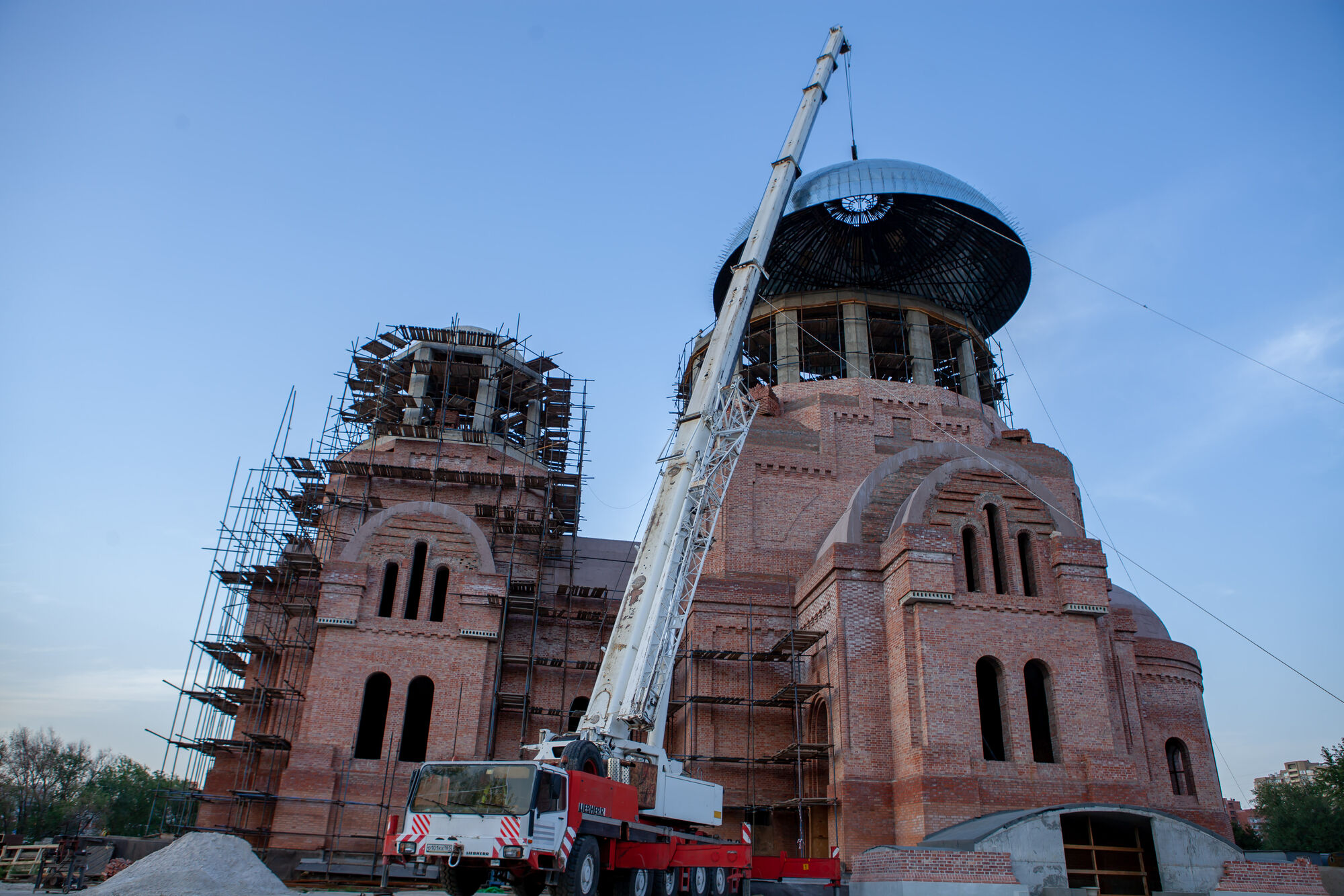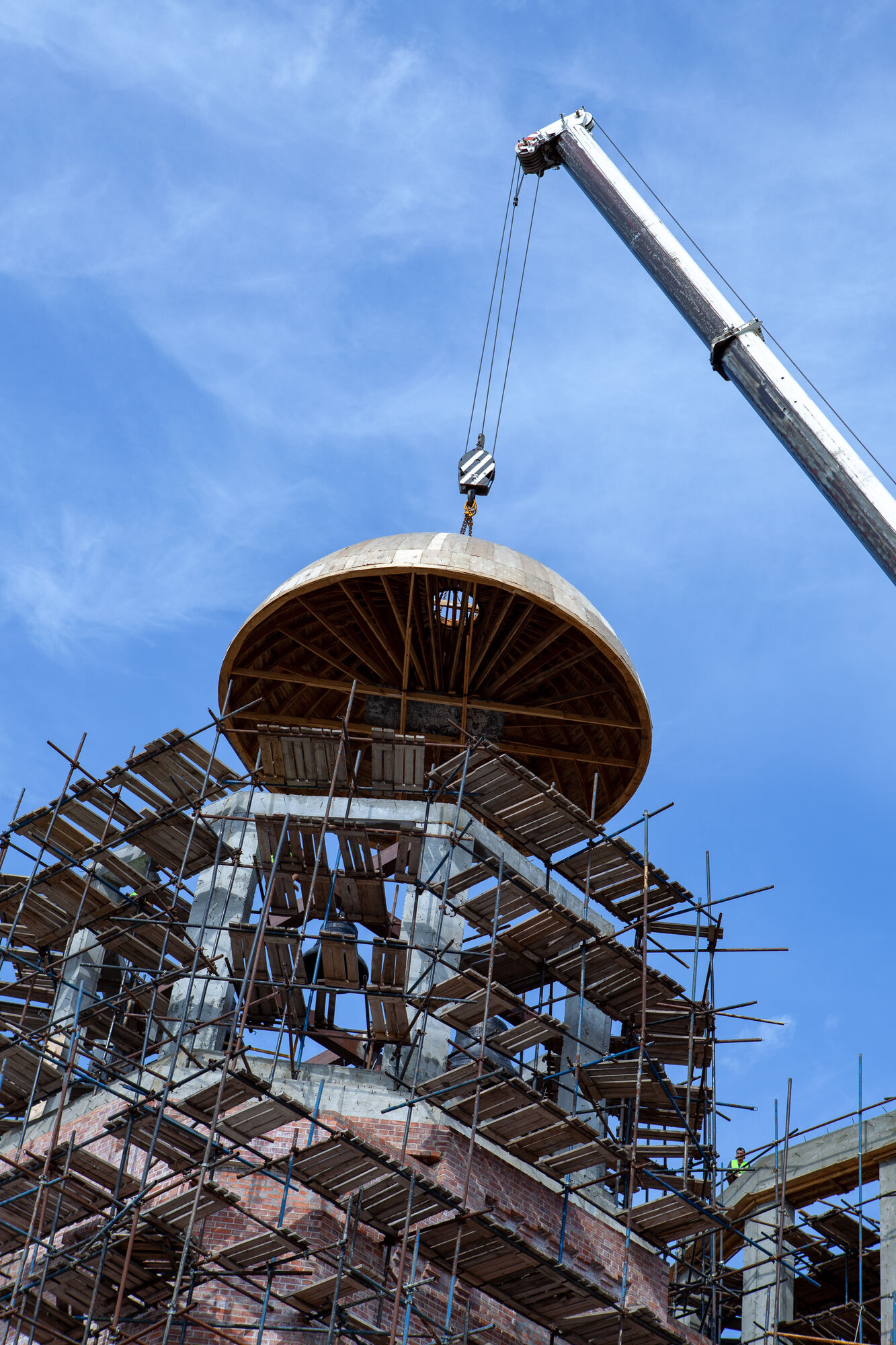 Ранним утром на колокольне строящегося храма заняли свое место 4 колокола, после чего начался подъём 3-тонной опалубки. Следующим сложным и кропотливым этапом работы стал подъём опалубки для основного купола храма весом почти в 15 тонн. Многочисленные прихожане, пришедшие на всенощное бдение праздника Успения Божией Матери, стали непосредственным участниками этого события. Все вместе мы пели молитвы и просили Господа и Пречистую Богородицу помощи в устроительстве нашего храма. Спустя почти 4 часа работа была благополучно завершена.