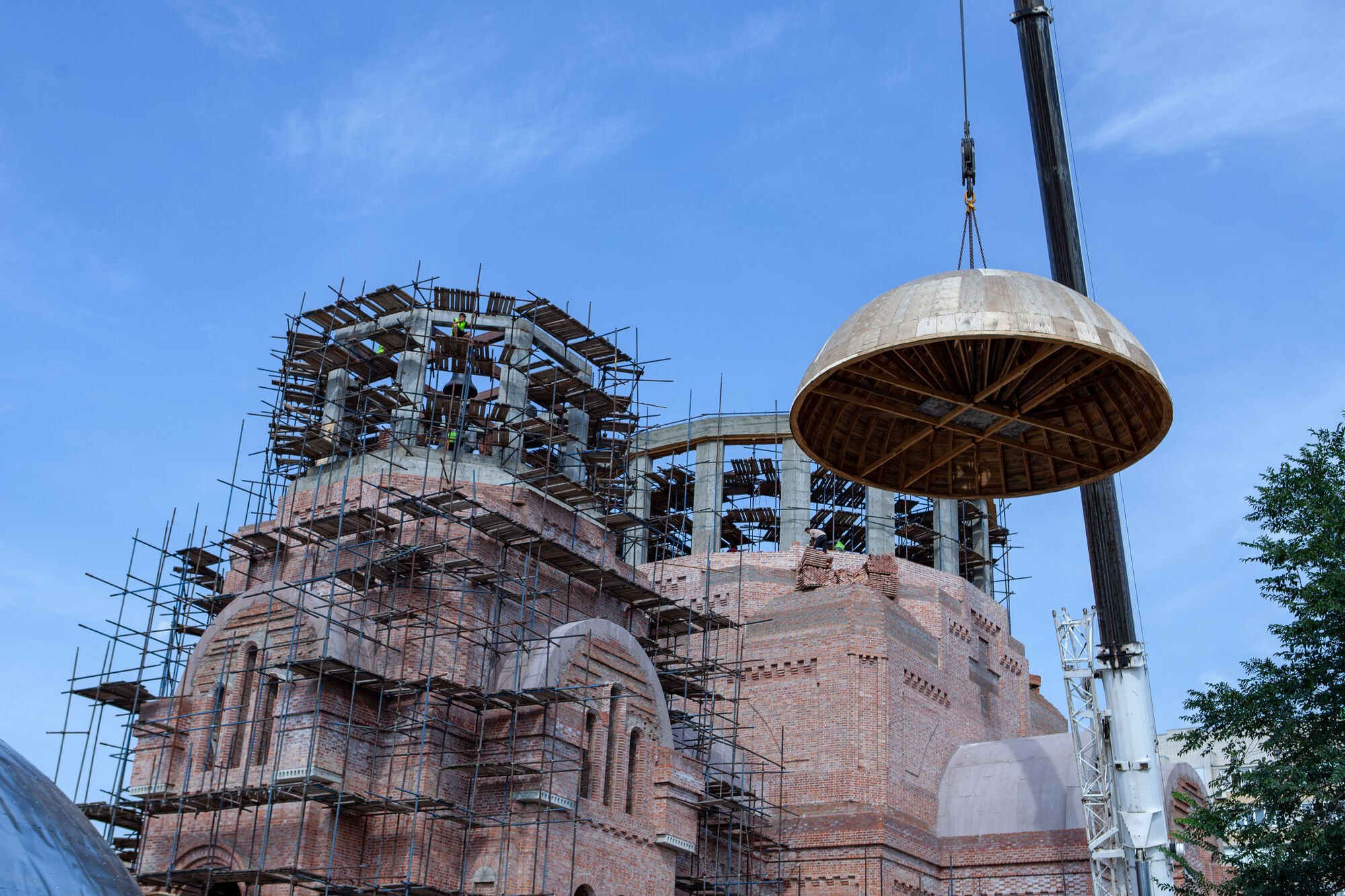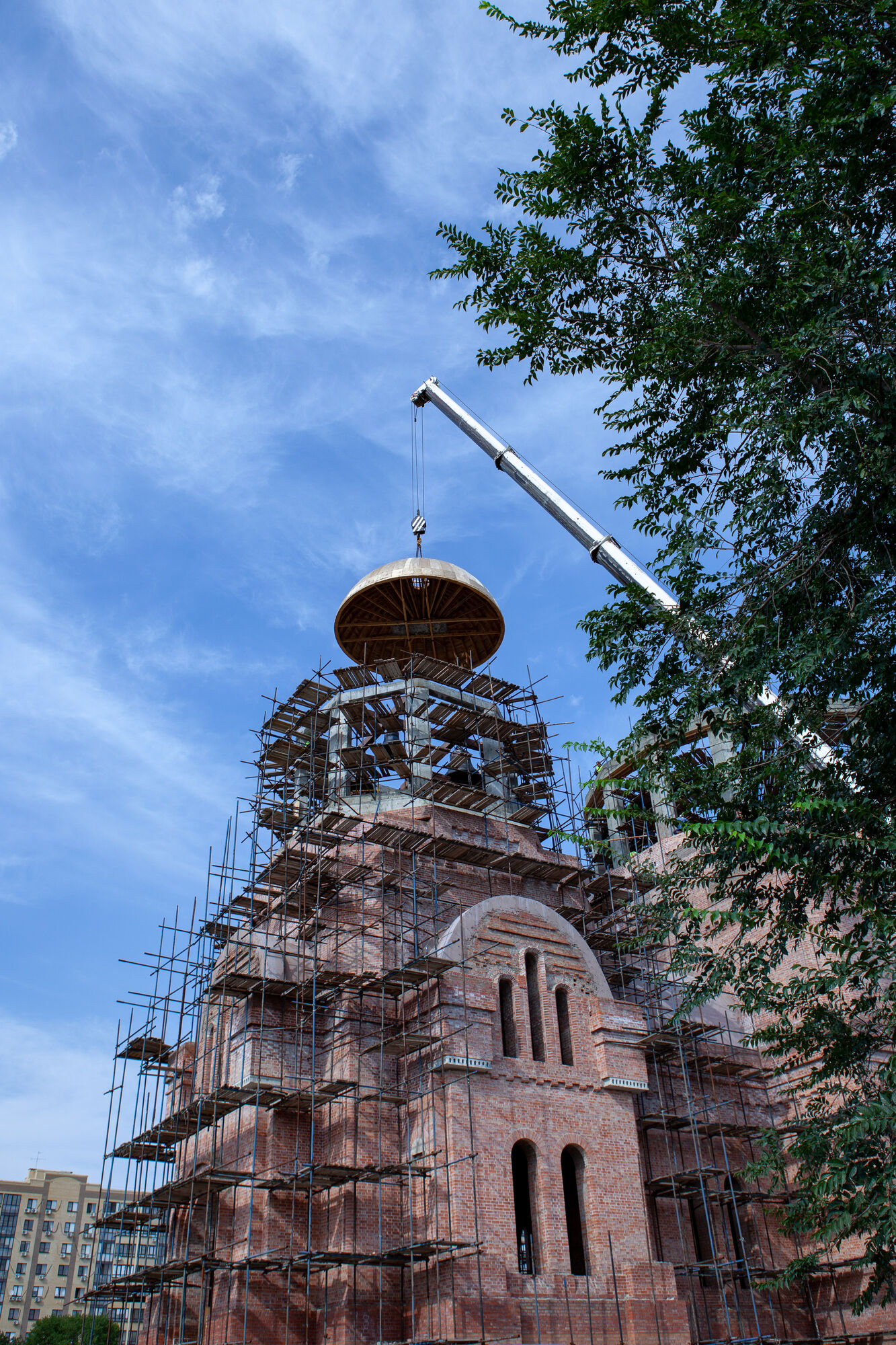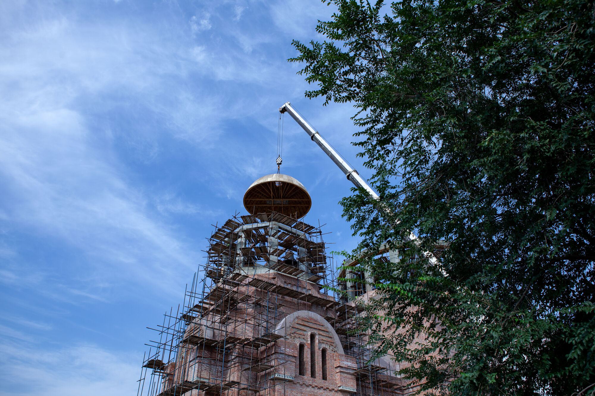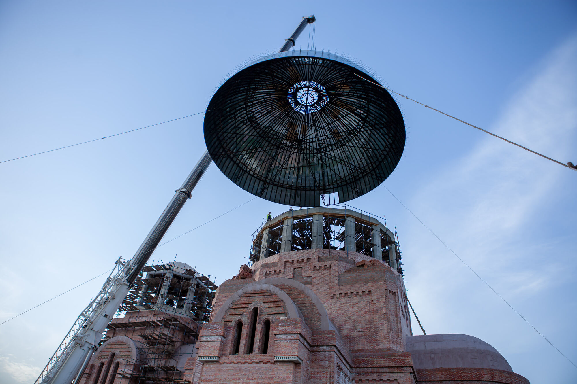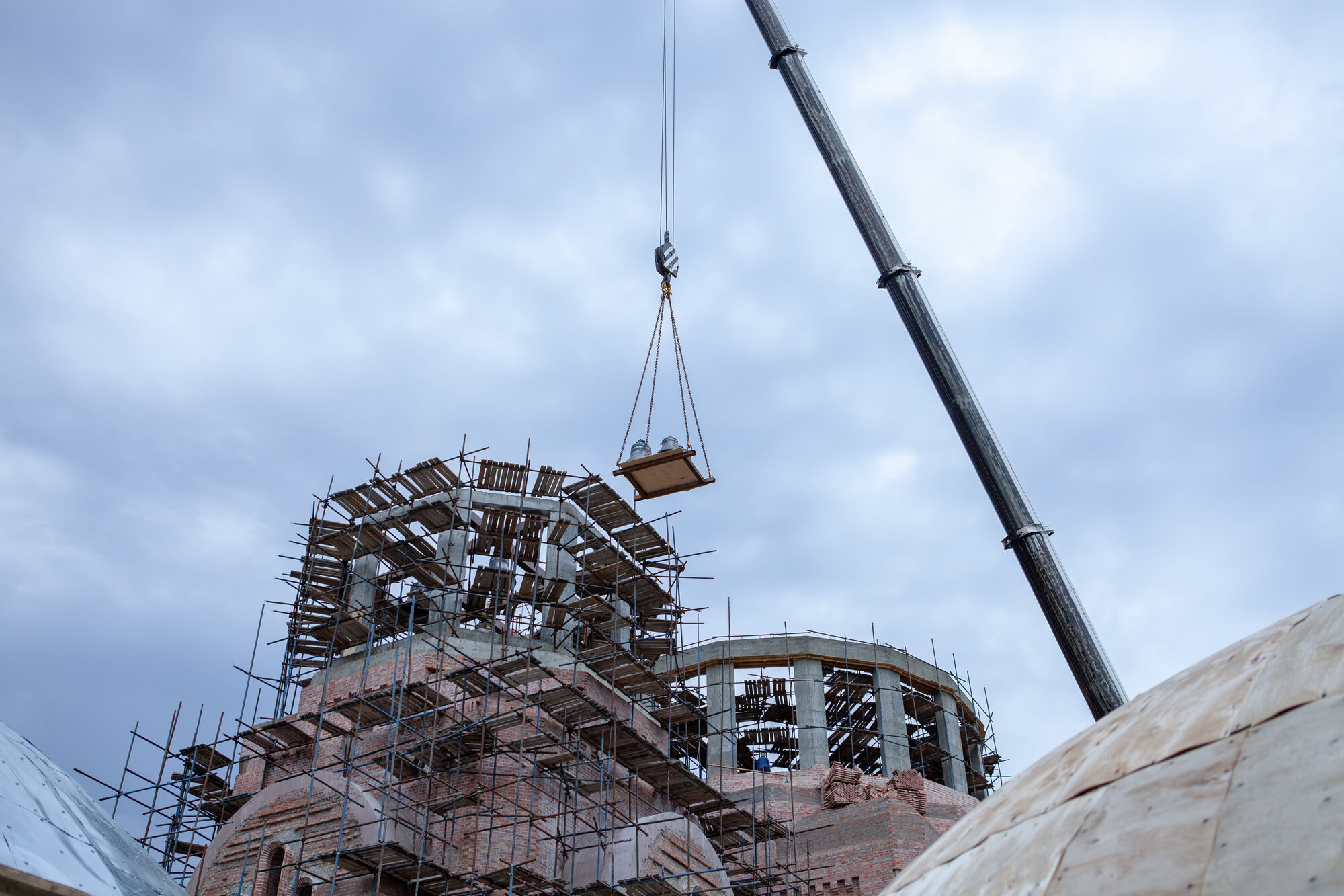 Ранним утром на колокольне строящегося храма заняли свое место 4 колокола, после чего начался подъём 3-тонной опалубки. Следующим сложным и кропотливым этапом работы стал подъём опалубки для основного купола храма весом почти в 15 тонн. Многочисленные прихожане, пришедшие на всенощное бдение праздника Успения Божией Матери, стали непосредственным участниками этого события. Все вместе мы пели молитвы и просили Господа и Пречистую Богородицу помощи в устроительстве нашего храма. Спустя почти 4 часа работа была благополучно завершена.