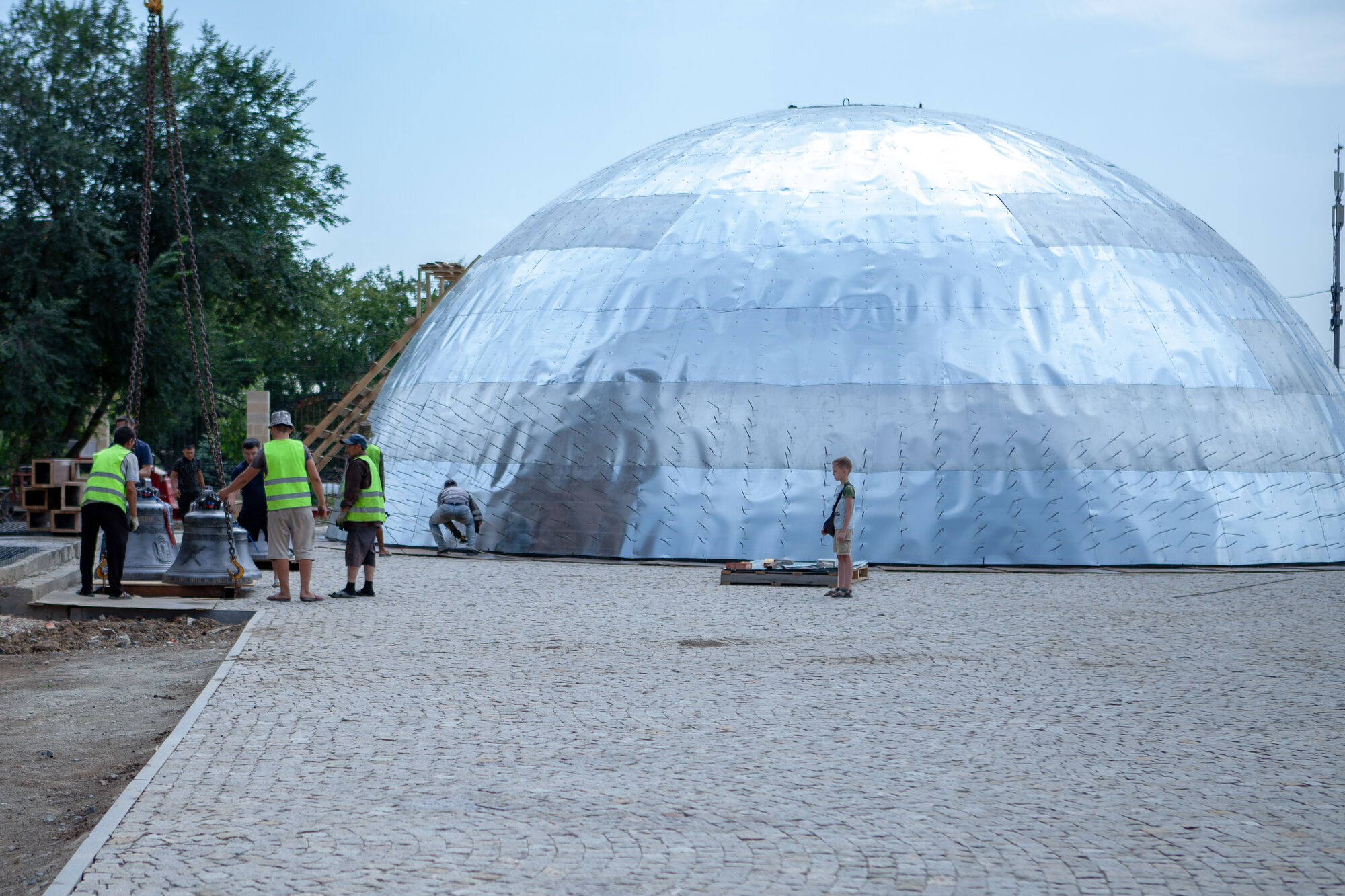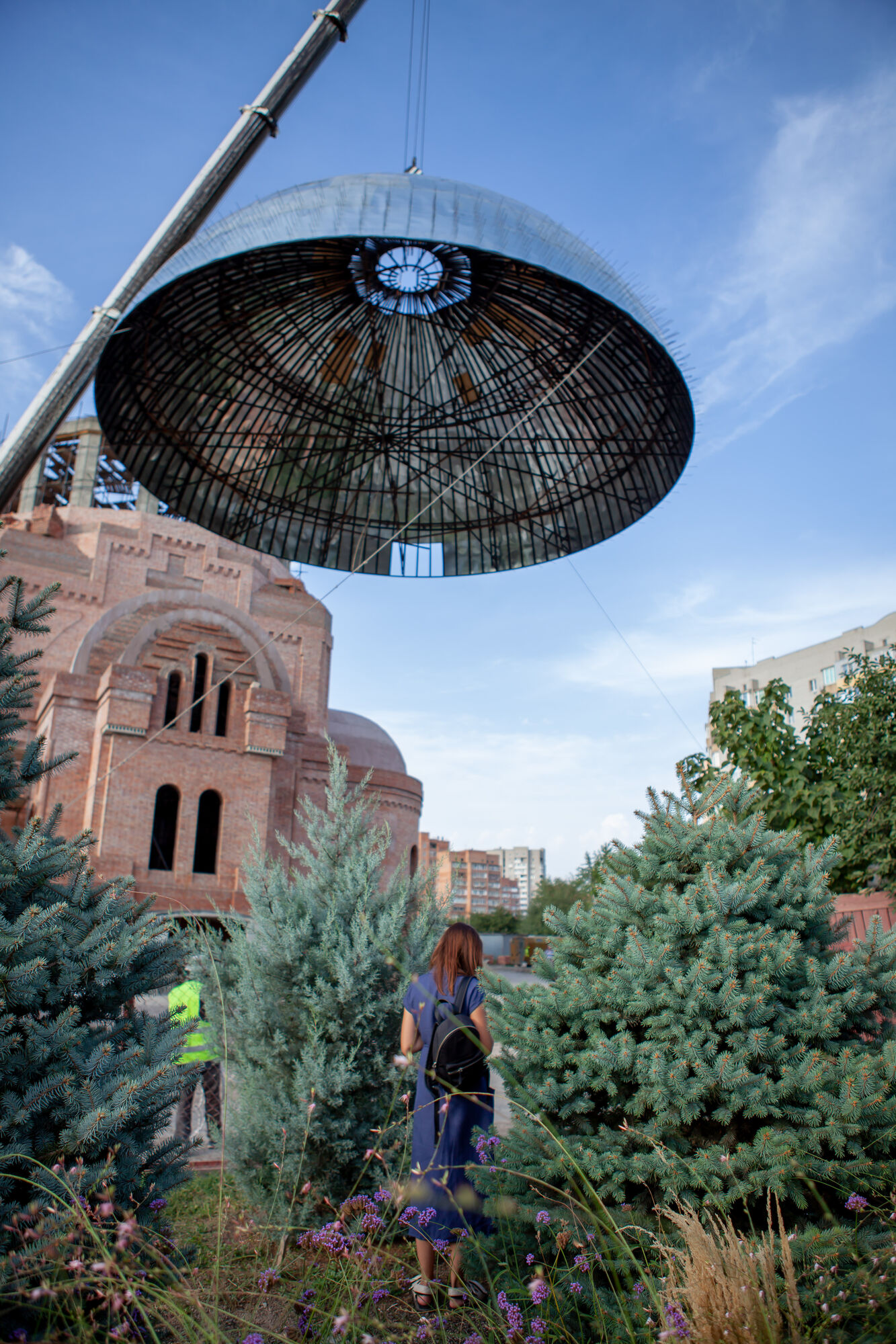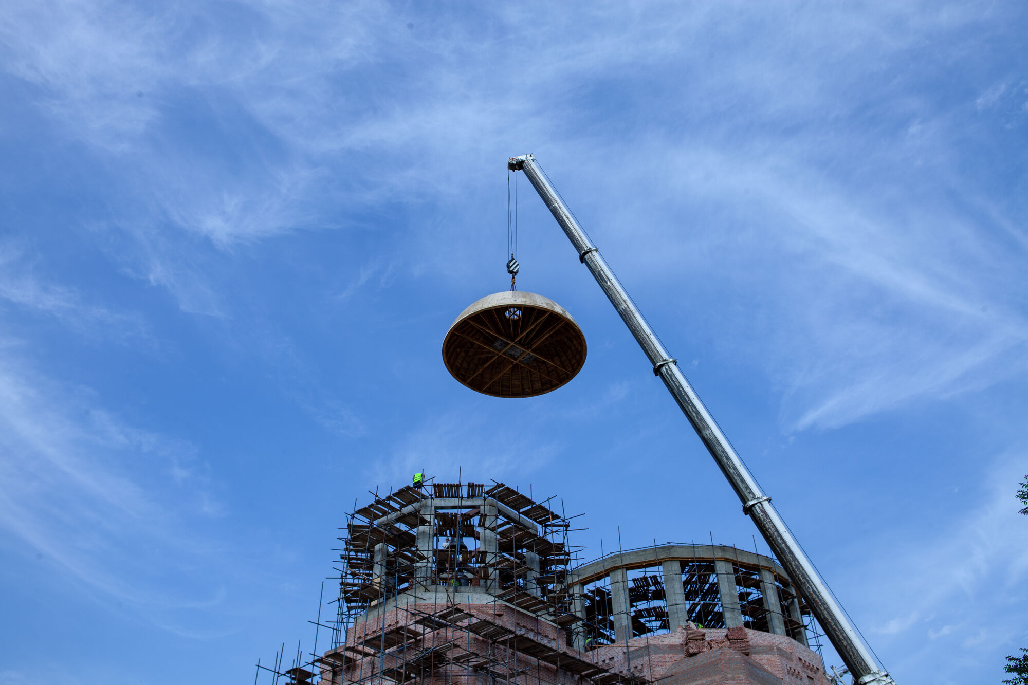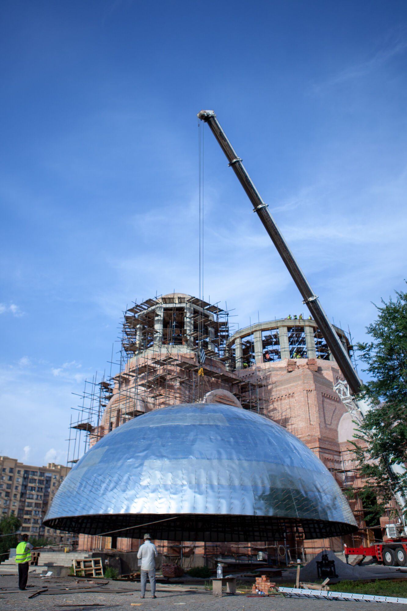 Ранним утром на колокольне строящегося храма заняли свое место 4 колокола, после чего начался подъём 3-тонной опалубки. Следующим сложным и кропотливым этапом работы стал подъём опалубки для основного купола храма весом почти в 15 тонн. Многочисленные прихожане, пришедшие на всенощное бдение праздника Успения Божией Матери, стали непосредственным участниками этого события. Все вместе мы пели молитвы и просили Господа и Пречистую Богородицу помощи в устроительстве нашего храма. Спустя почти 4 часа работа была благополучно завершена.