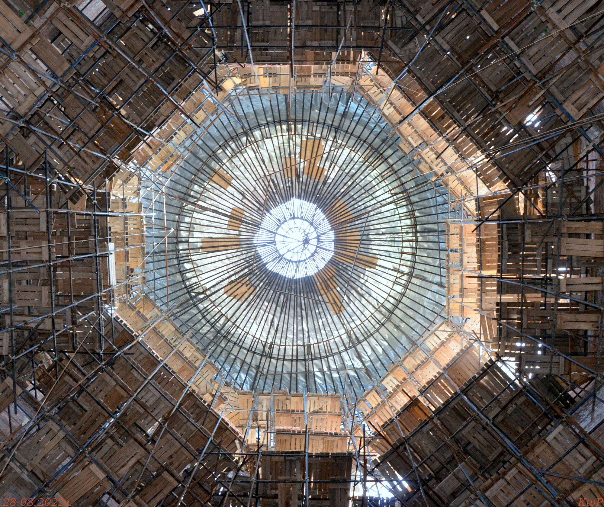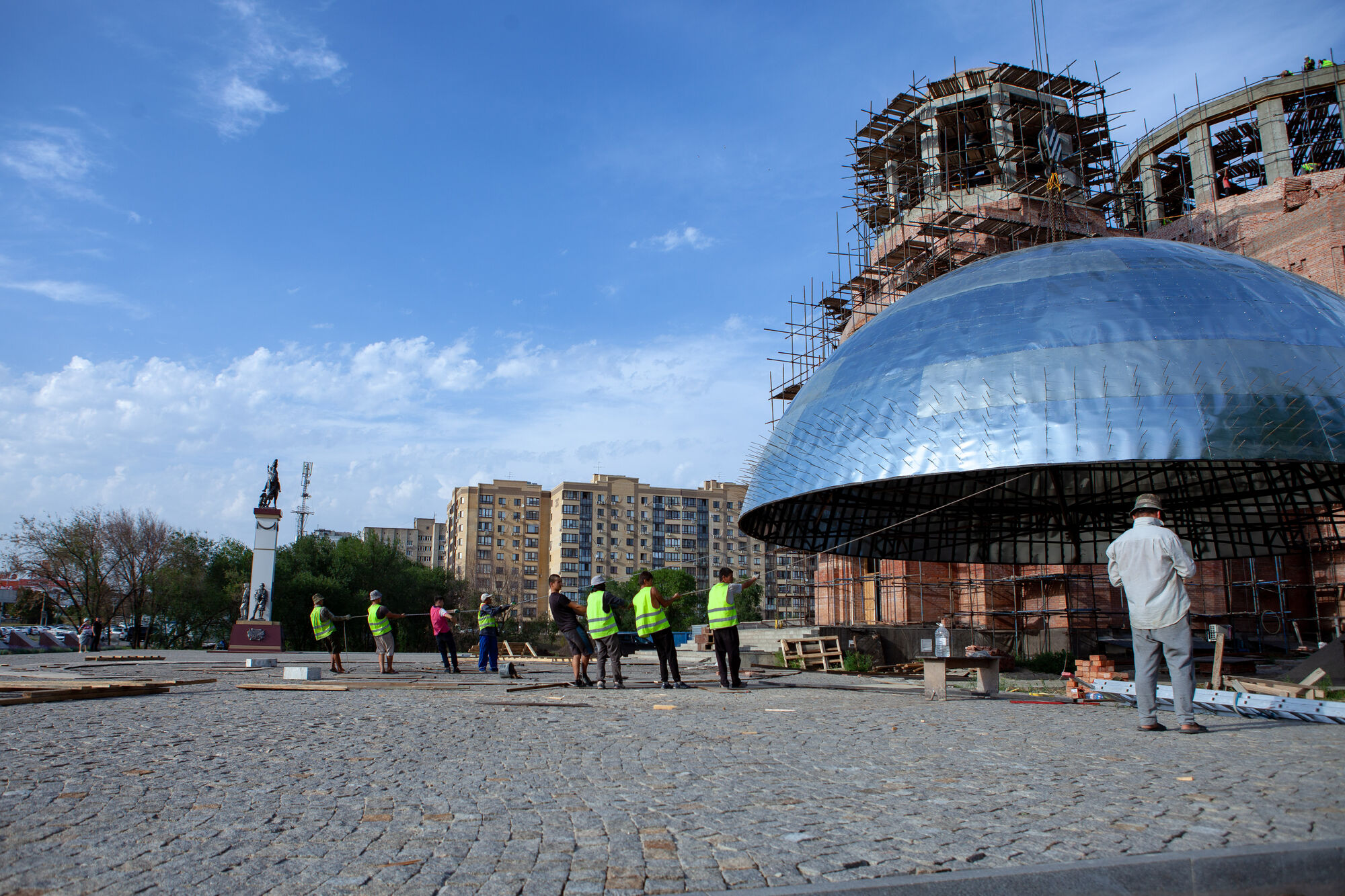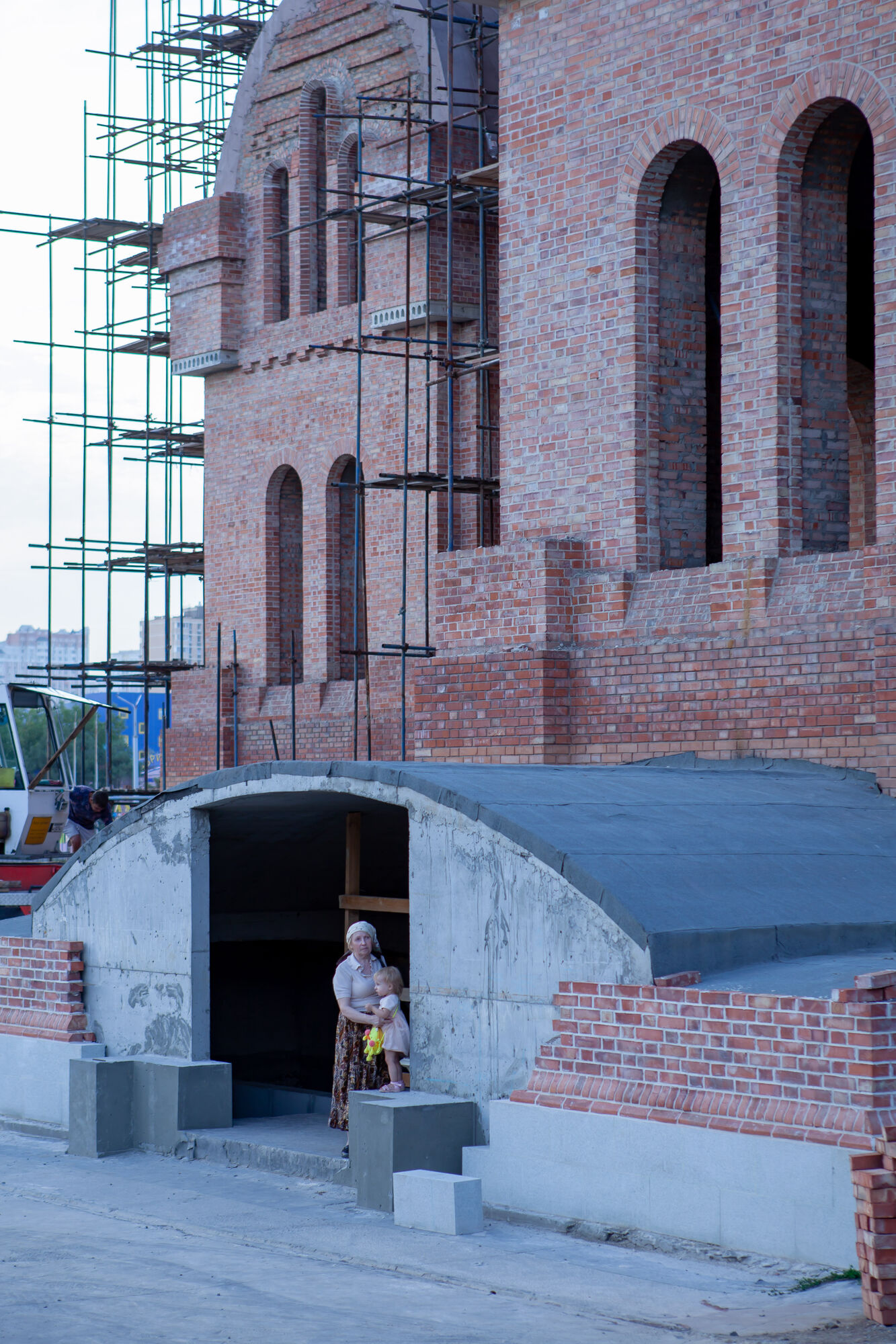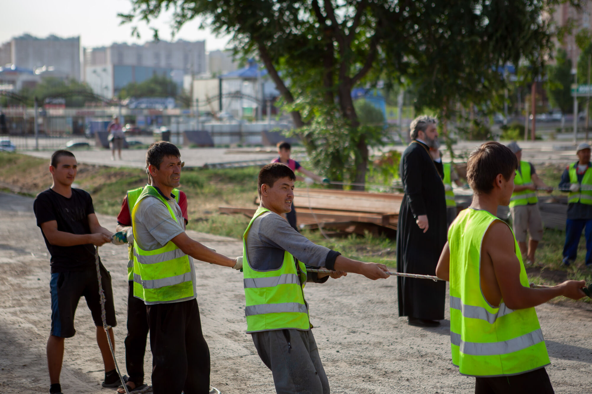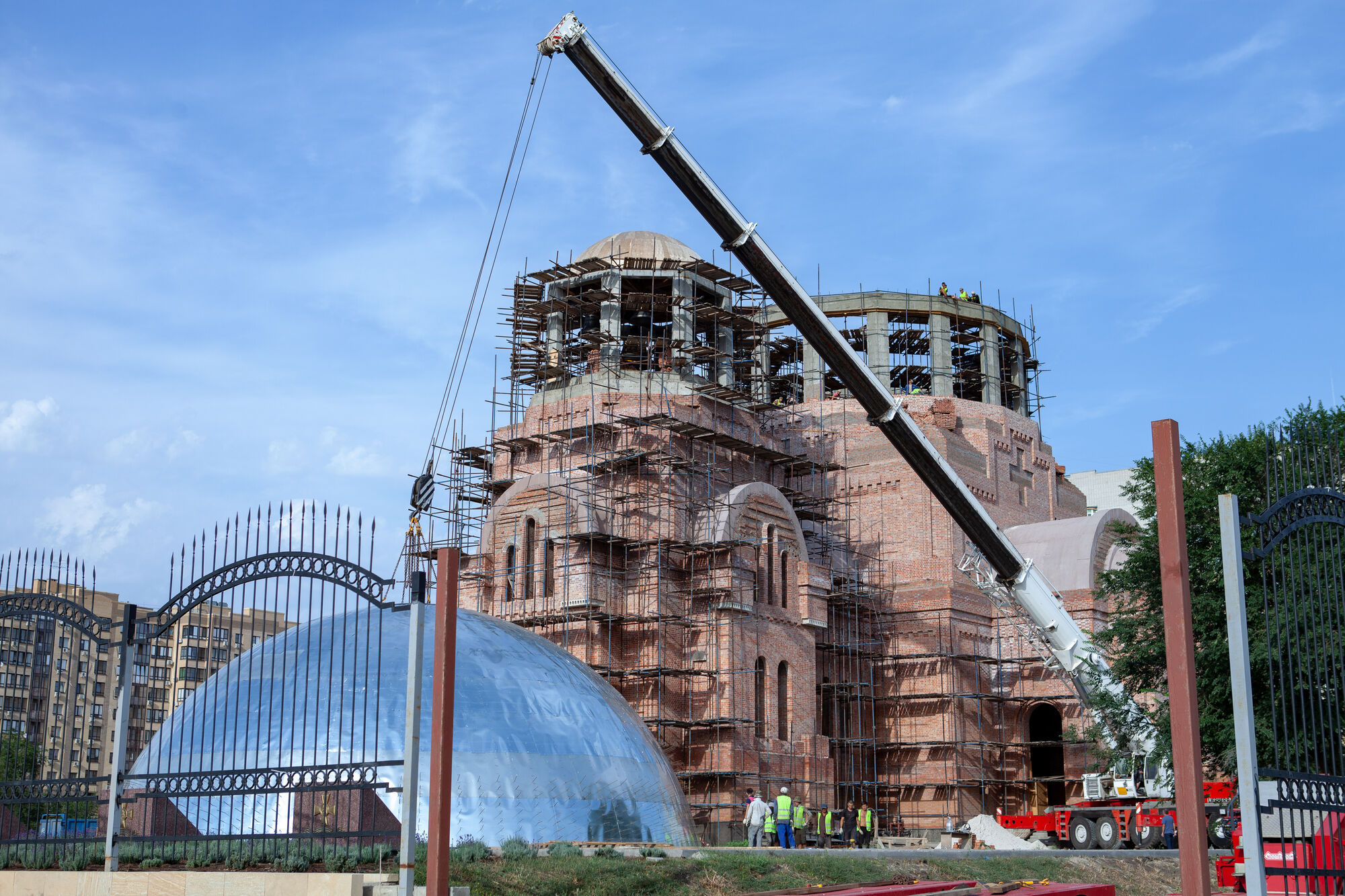 Ранним утром на колокольне строящегося храма заняли свое место 4 колокола, после чего начался подъём 3-тонной опалубки. Следующим сложным и кропотливым этапом работы стал подъём опалубки для основного купола храма весом почти в 15 тонн. Многочисленные прихожане, пришедшие на всенощное бдение праздника Успения Божией Матери, стали непосредственным участниками этого события. Все вместе мы пели молитвы и просили Господа и Пречистую Богородицу помощи в устроительстве нашего храма. Спустя почти 4 часа работа была благополучно завершена.