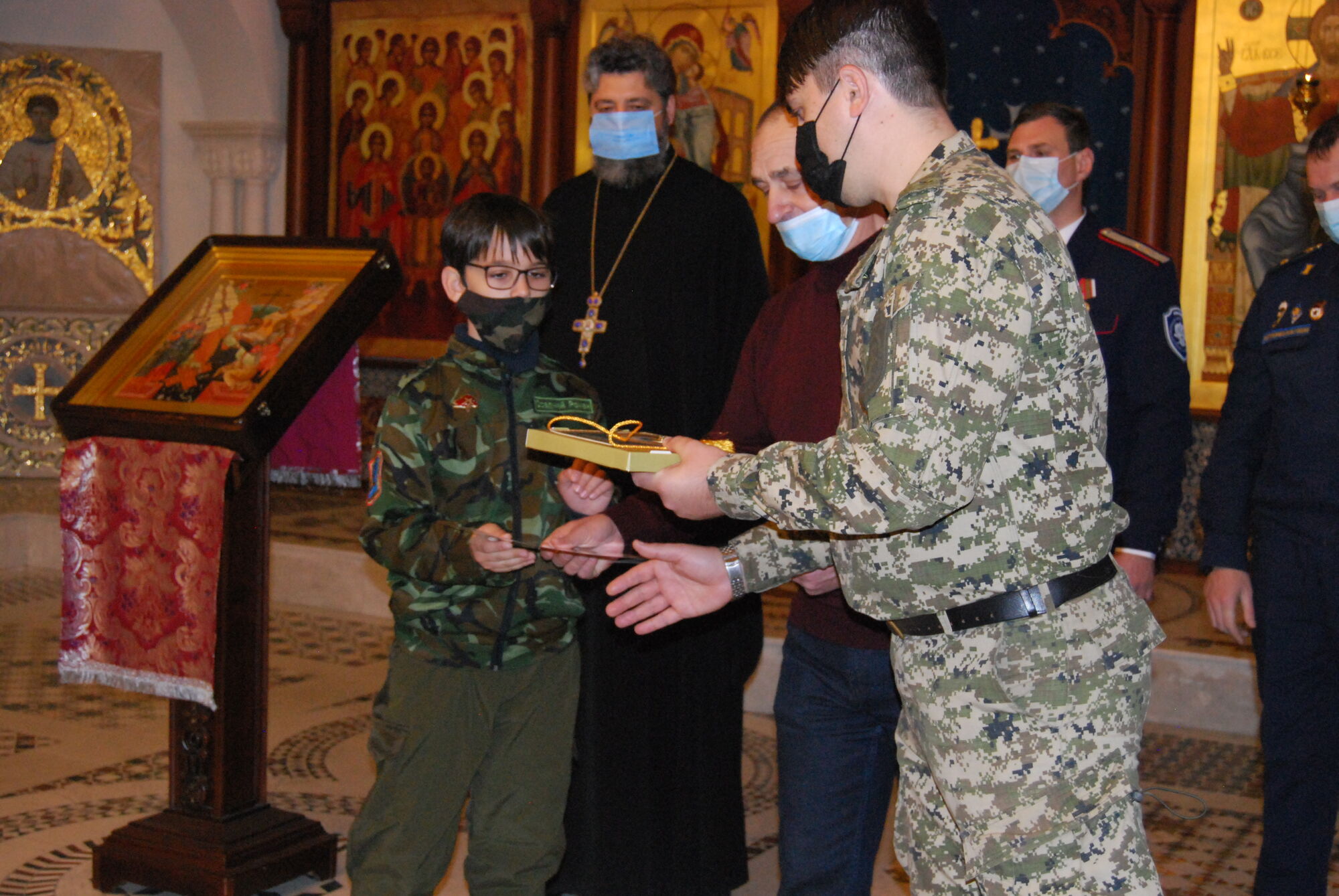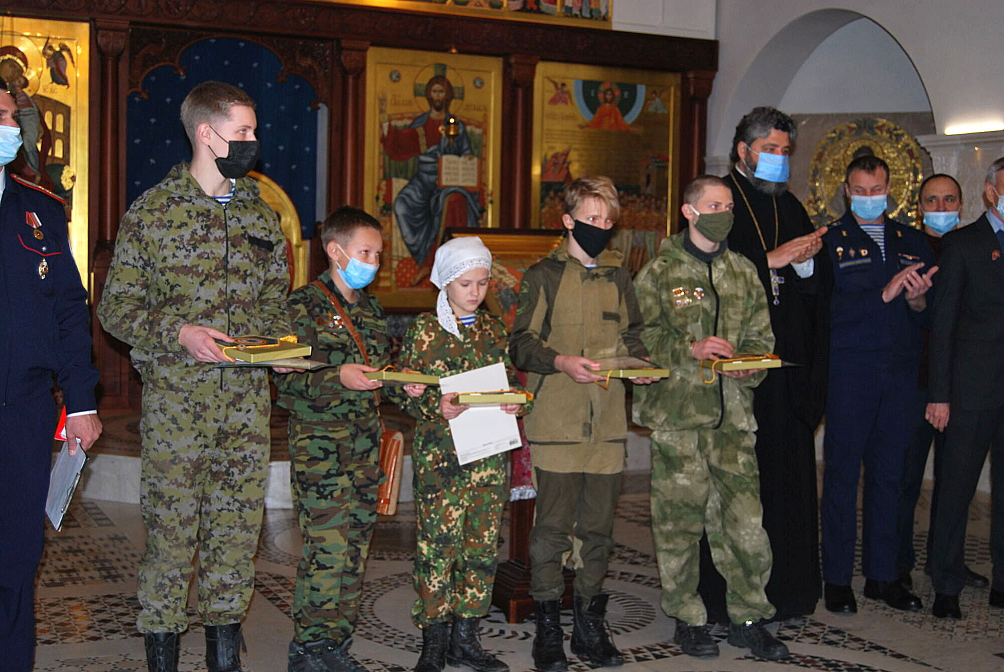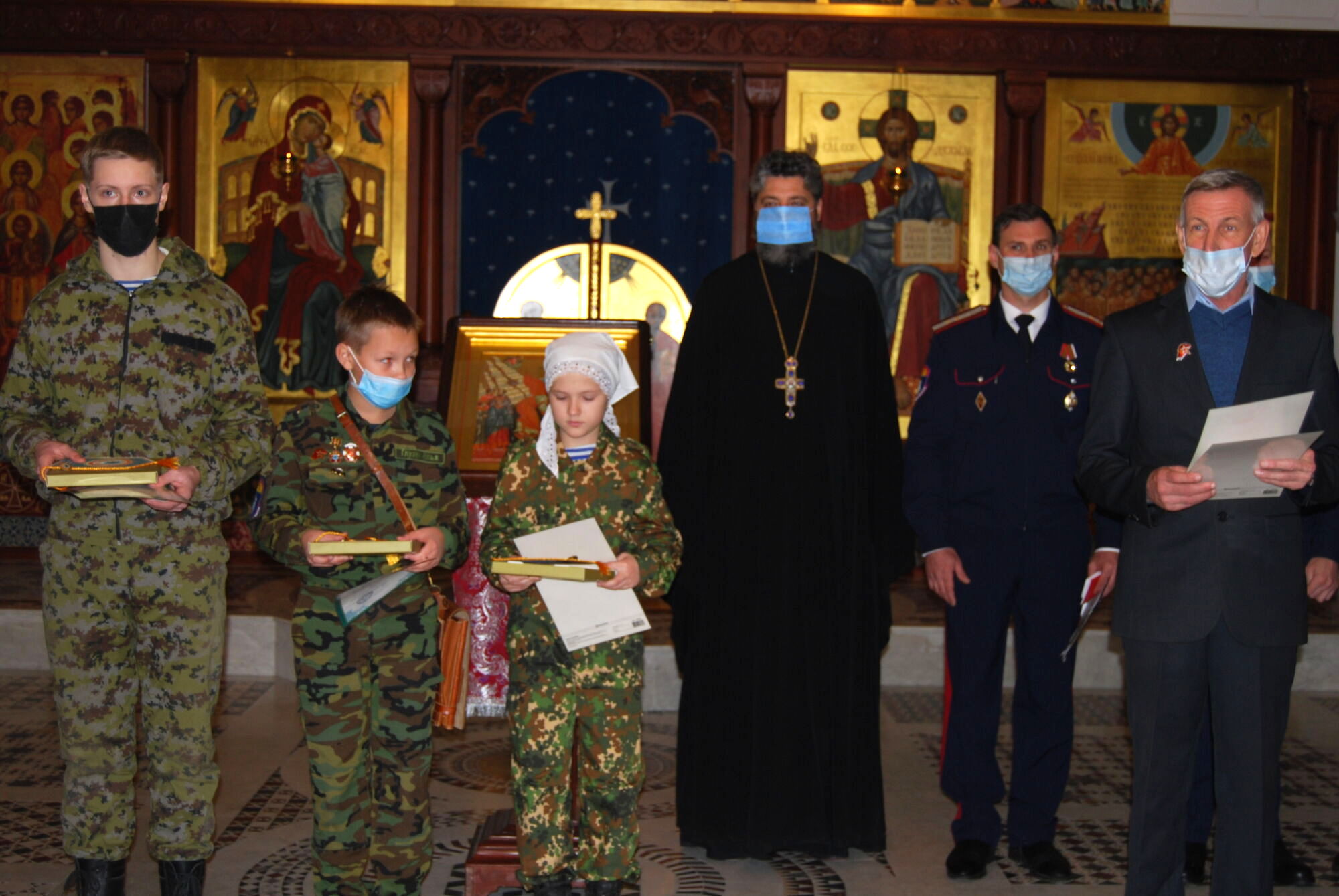 27 декабря 2020 года учащиеся приходской воскресной школы, занимающиеся по программе «Уроки мужества», и их родители приняли участие в совместном воскресном Богослужении и Причастии в храме 40 Севастийских мучеников. По окончании утренней службы по благословению настоятеля прихода Святого Георгия Победоносца протоиерея Валерия Волощука было организовано торжественное построение, посвященное подведению итогов окончания календарного учебного года по программе «Начальная военная подготовка к службе в Российской армии».