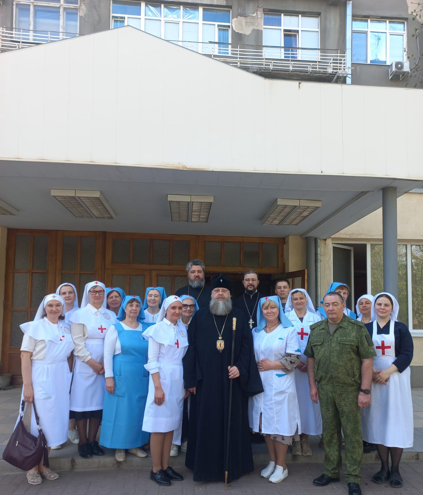 Митрополит Ростовский и Новочеркасский Меркурий и епископ Таганрогский Артемий посетили Окружной военный госпиталь, где поздравили военнослужащих с Пасхой Христовой. Наш настоятель отец Валерий Волощук принял участие в поздравлении. Солдатам передали пасхальные угощения. Во всех отделениях звучало пасхальное приветствие "Христос воскресе!". Хоры Кафедрального собора Рождества Пресвятой Богородицы и Донской духовной семинарии радовали пациентов праздничными песнопениями.