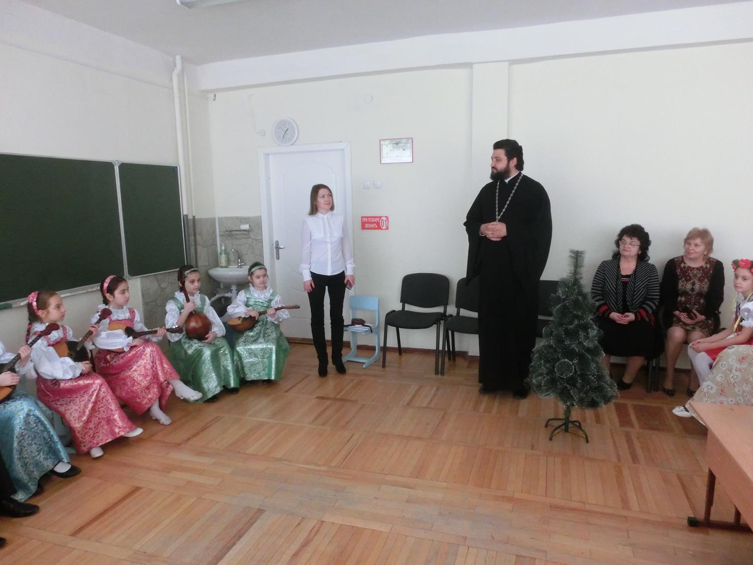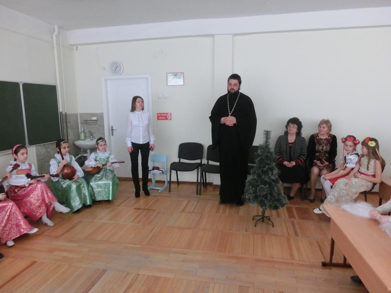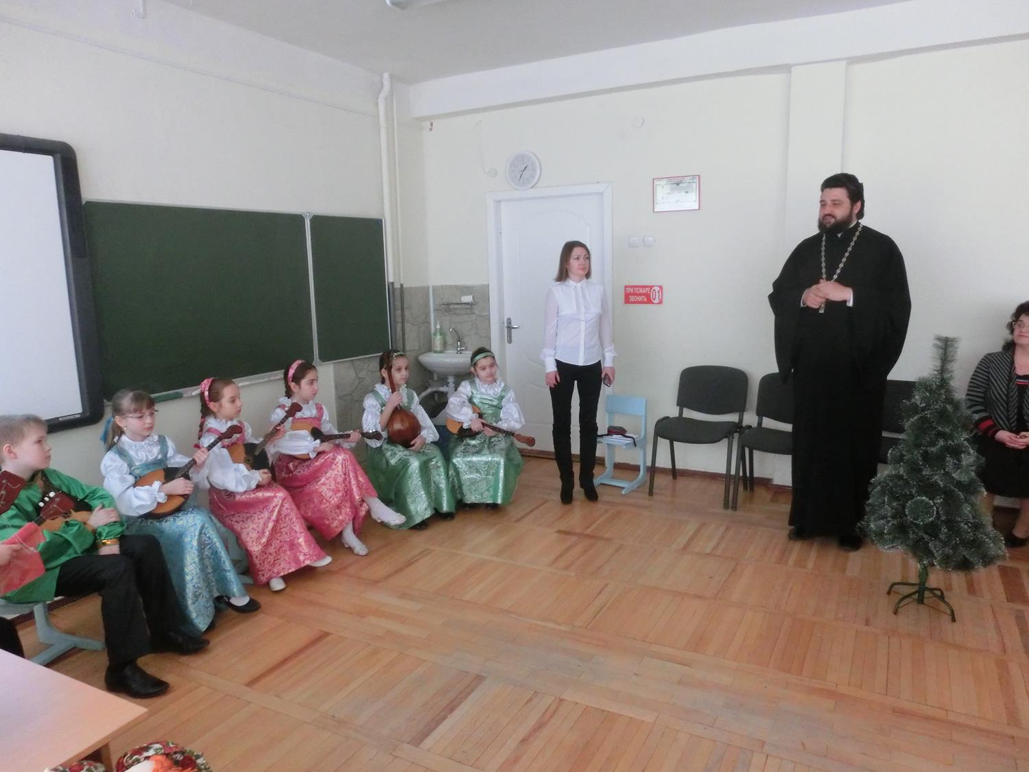 Мероприятие началось с показа праздничного утренника посвященного празднованию масленицы. Детки 3«Д» подготовили выступление, в котором рассказали о празднике и традиции его проведения. Рассказывали стихи, пели частушки и показали несколько сценок. Особенно поразило музыкальное выступление ребят на балалайках и домбрах. К детям с благодарностью обратились директор школы и отец Валерий. Батюшка рассказал о нашем храме, пригласил в гости, а так же пожелал хорошей учебы, прекрасной весны, крепости сил, радости и Божией помощи.
