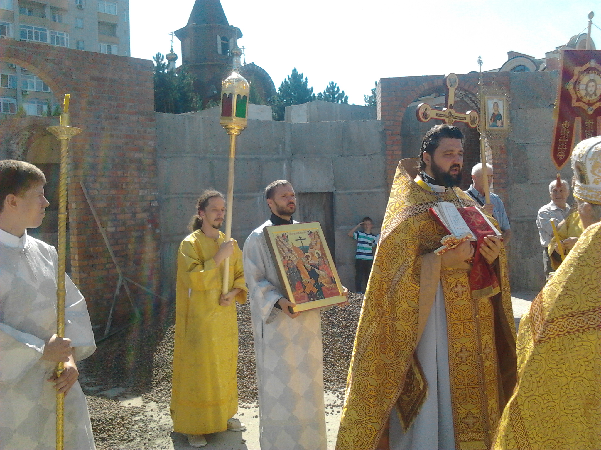 По завершении литургии, молящиеся и духовенство храма прошли Крестным ходом по территории прихода. Отрадно было видеть, как возводимый храм наполняется молебным прославлением Равноапостольного князя Владимира, а стилобатная плита - место, где будет располагаться трапезный храм в честь сорока Севайстийских мучеников, - заполнялся множеством прихожан.
