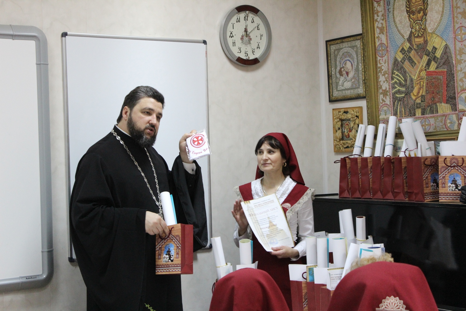Выражаем большую благодарность руководителю епархиального отдела по социальному служению О. Евгению Осяку, который лично приехал поздравить и вручить благодарственные письма нашему Сестричеству. По окончании Божественной литургии было устроено чаепитие. О. Валерий вручил гостям и сестрам Милосердия Храма Иоанна Воина памятные подарки: нарядные белые платочки с логотипом прихода Георгия Победоносца, наборы свечей, календари нашего Храма.