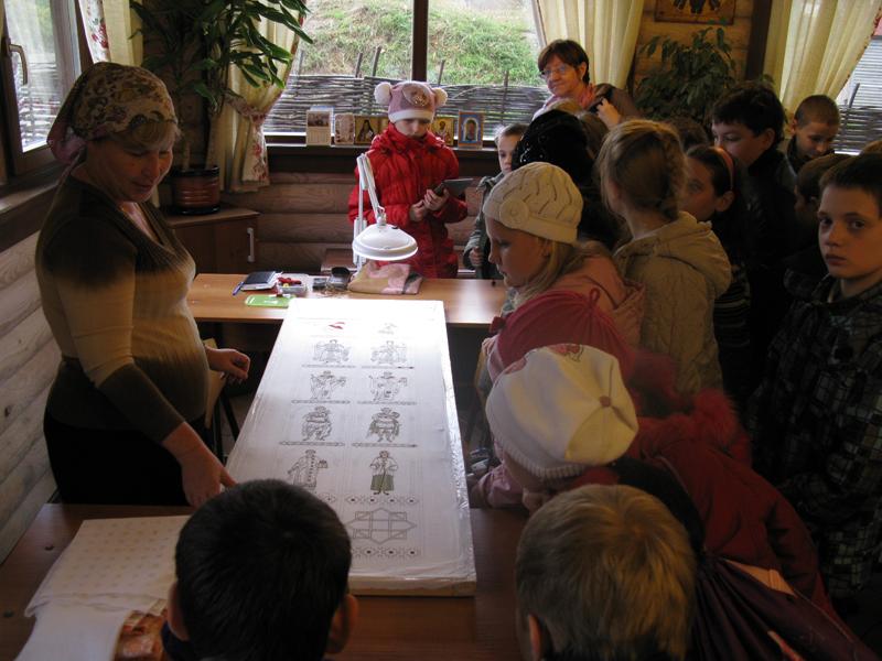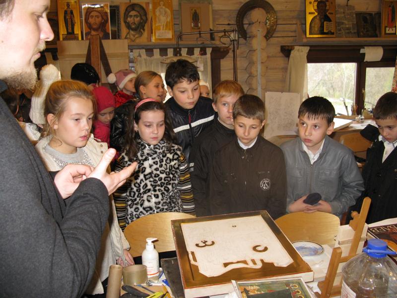 Священник Роман Зимин рассказал ребятам об особенностях внутреннего устройства храма, познакомил с работой иконописной мастерской, рассказал о традиционных методах изготовления икон, материалах. Руководитель приходской золотошвейной мастерской Елена Жилинская рассказала о техниках и материалах, используемых в золотном шитье, показала выполненные приходскими мастерами изделия.
