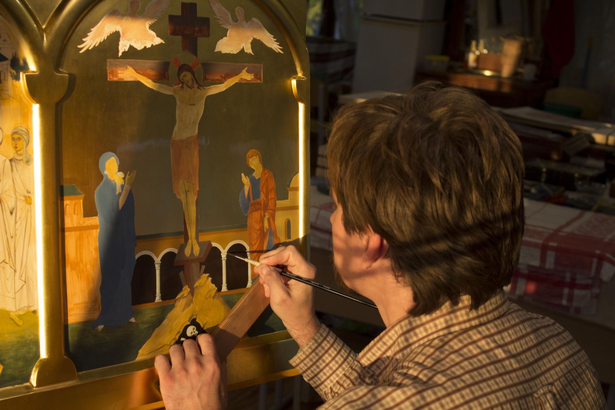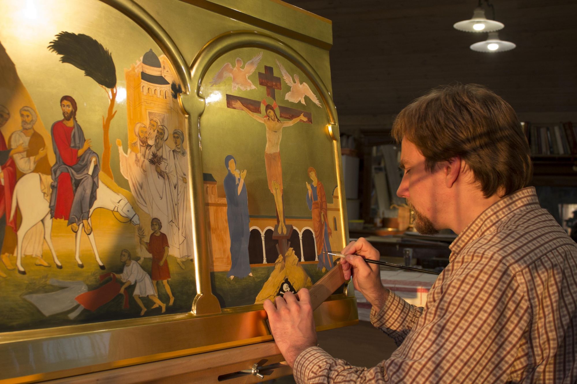 Иконописец Дмитрий Александрович продолжает писать иконы в праздничный ряд иконостаса 40 Севастийских мучеников. До этого было, много эскизов, прориси, золочения и наконец-то, можно писать! Просит молитв.