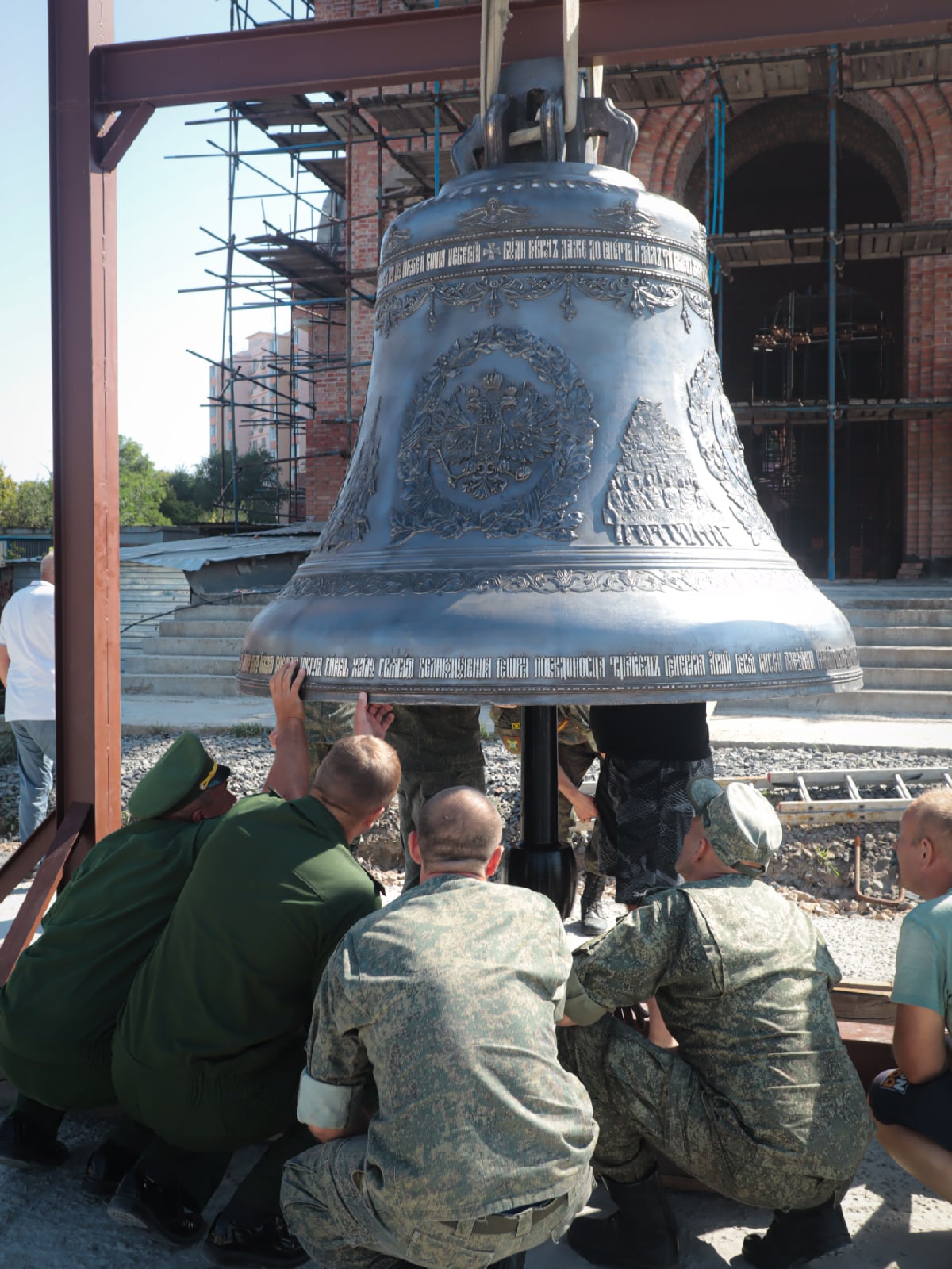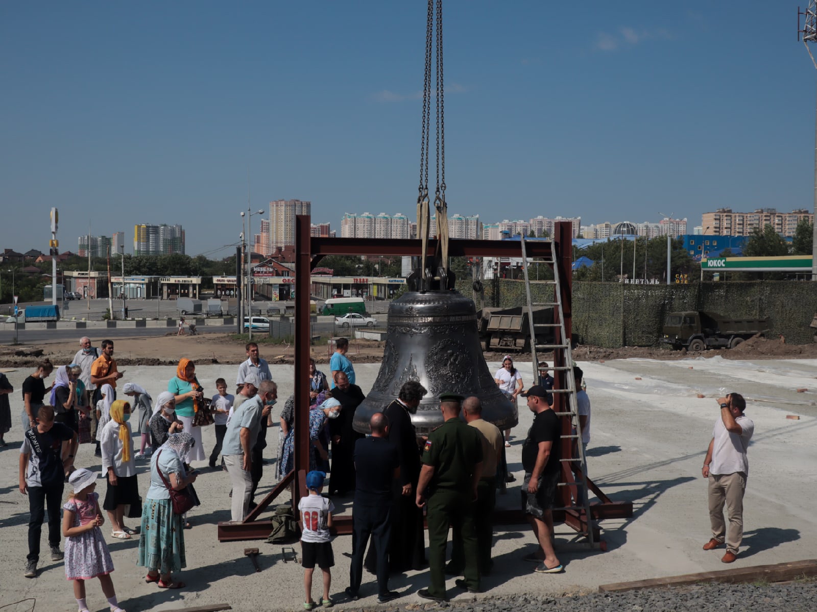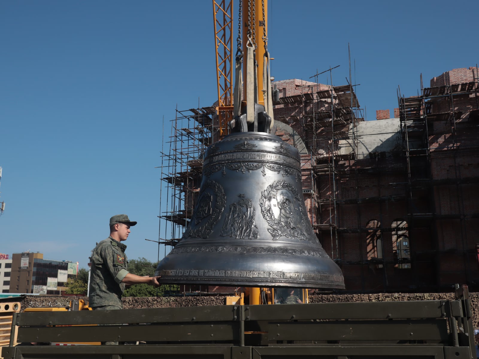 Воскресное утро 29 августа началось со встречи Благовестника для колокольни храма святого Георгия Победоносца — главного православного храма Южного военного округа. Колокол весом 4.5 тонны временно установлен у входа в строящийся храм святого Георгия.