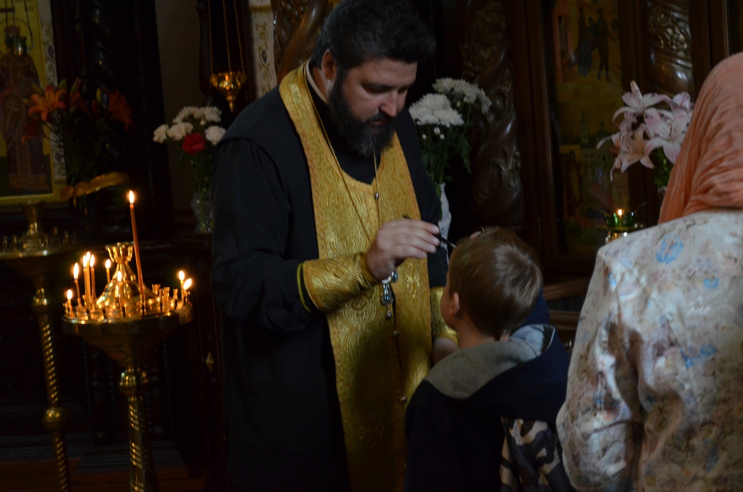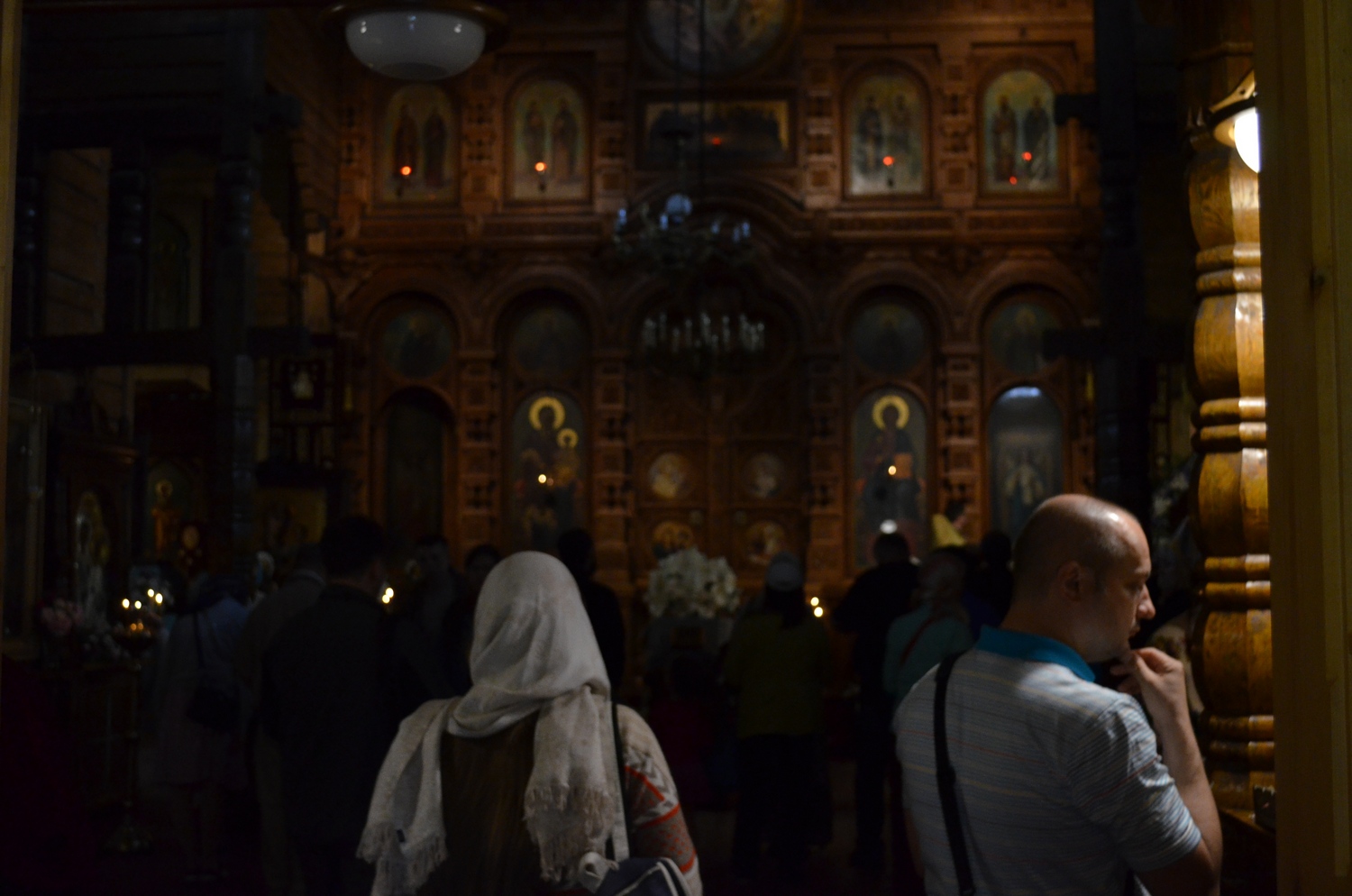 Вечером в день прибытия наши паломники приняли участие в вечерне в Спасо-Преображенском соборе монастыря, которая длилась с 19 до 23 часов. На следующее утро в день Памяти святых отцов шести Вселенских Соборов состоялась Божественная Литургия, в которой вместе с Валаамским духовенством служили и священники нашего прихода. Богослужение возглавил игумен Валаамского монастыря епископ Троицкий Панкратий в сослужении митрополита Алавердского Давида (Грузинская Православная Церковь) и игумена Великой Лавры архимандрита Продрома (Святая Гора Афон). В эти дни на Валааме проходил Первый Валаамский фестиваль православного пения «Просветитель», посвященный 1000-летию преставления святого равноапостольного великого князя Владимира, и в монастырь приехали священство и хоры из 23 стран мира – Грузии, Сербии, Греции, Украины, России, Беларуси и др., поэтому на богослужении присутствовали представители духовенства Православных Церквей и паломники из разных стран. Верхний храм Спасо-Преображенского собора, который вмещает более трех тысяч человек, был переполнен: люди молились в притворе и на ступенях храма.