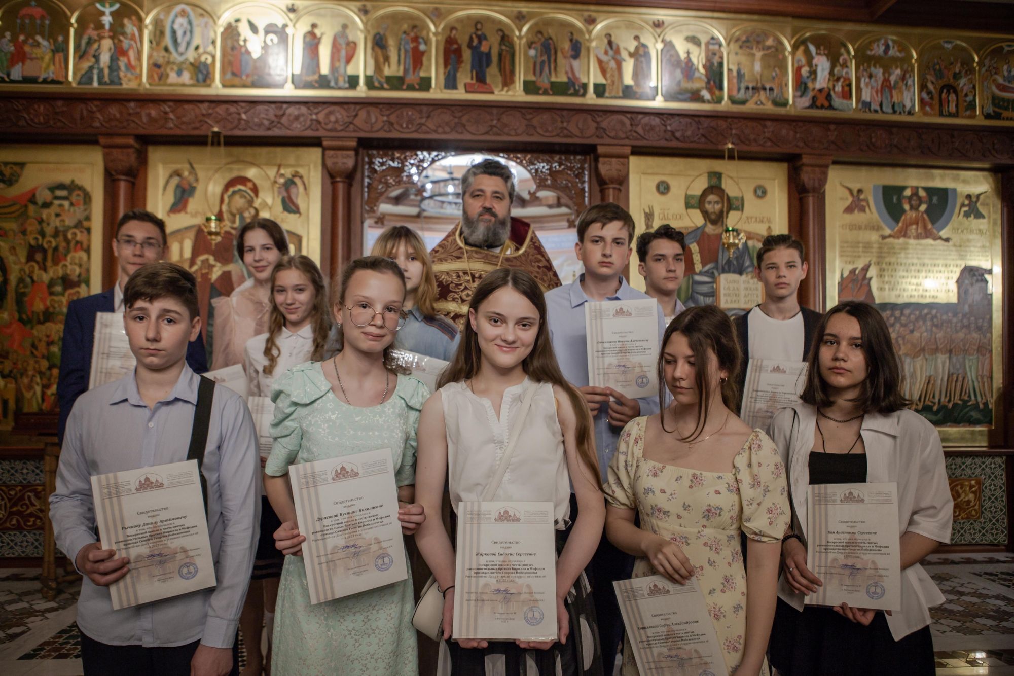 29 июня 2022 года в нашей Воскресной школе прошел праздник, приуроченный ко Дню славянской письменности и культуры и окончанию учебного года. Важным событием дня стало чествование выпускников. По окончании Божественной литургии настоятель прихода протоиерей Валерий Волощук вручил 13 выпускникам свидетельства об окончании Воскресной школы и напутствовал их в дальнейшем пути.