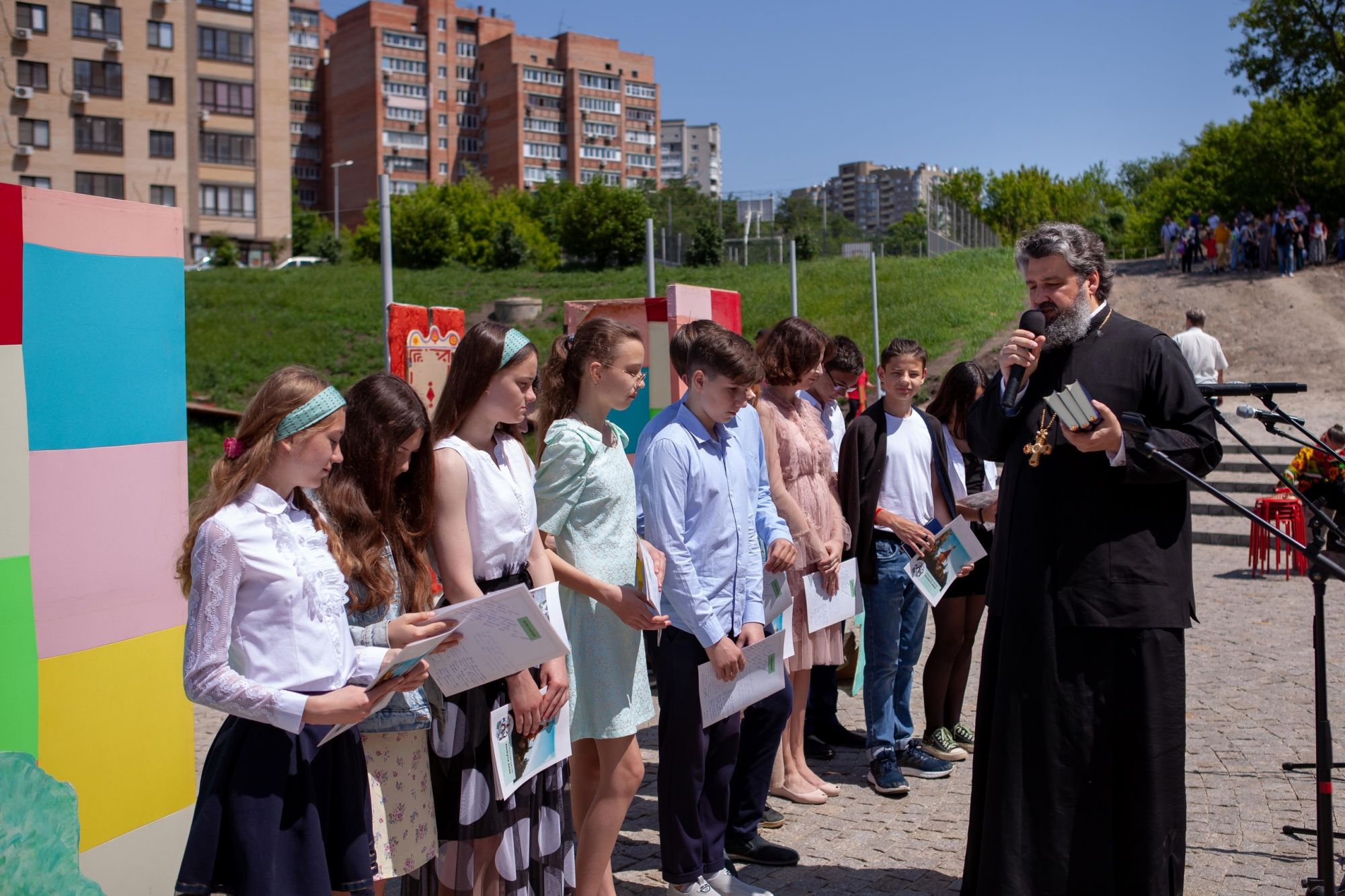 Праздник продолжился в новом амфитеатре приходского Георгиевского парка в балке Рябинина, где выпускников торжественно приняли в ряды молодежного движения прихода «Восход». После началась праздничная программа, в которой приняли участие творческие коллективы прихода, Дворца творчества детей и молодежи г. Ростова-на-Дону, Народный артист России Геннадий Верхогляд, солист хора Музыкального театра Дмитрий Останин. Затем гости увидели премьеру спектакля «Поющий колодец» приходского театра «Преображение» под руководством Александра Рыбина. Это история о том, как важны в жизни христианские ценности и настоящая дружба.
