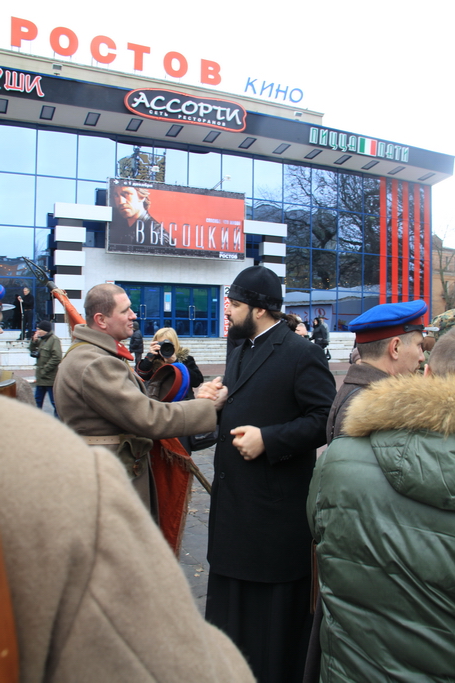 Возле кинотеатра «Ростов» в 13:00 состоялся торжественный митинг, посвященный праздничной дате. Руководитель епархиального отдела по взаимоотношениям Церкви и общества, настоятель Ростовского прихода святого Георгия Победоносца, протоиерей Валерий Волощук поздравил собравшихся и поблагодарил донских реконструкторов за их труды и заботу об увековечивании памяти защитников Отечества. -