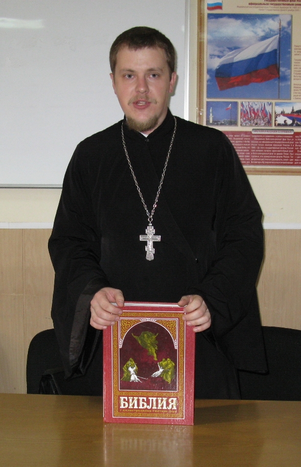 Священник поздравил сотрудников учреждения с их профессиональным праздником и передал подарок от прихода - иллюстрированную Библию для библиотеки отдела.