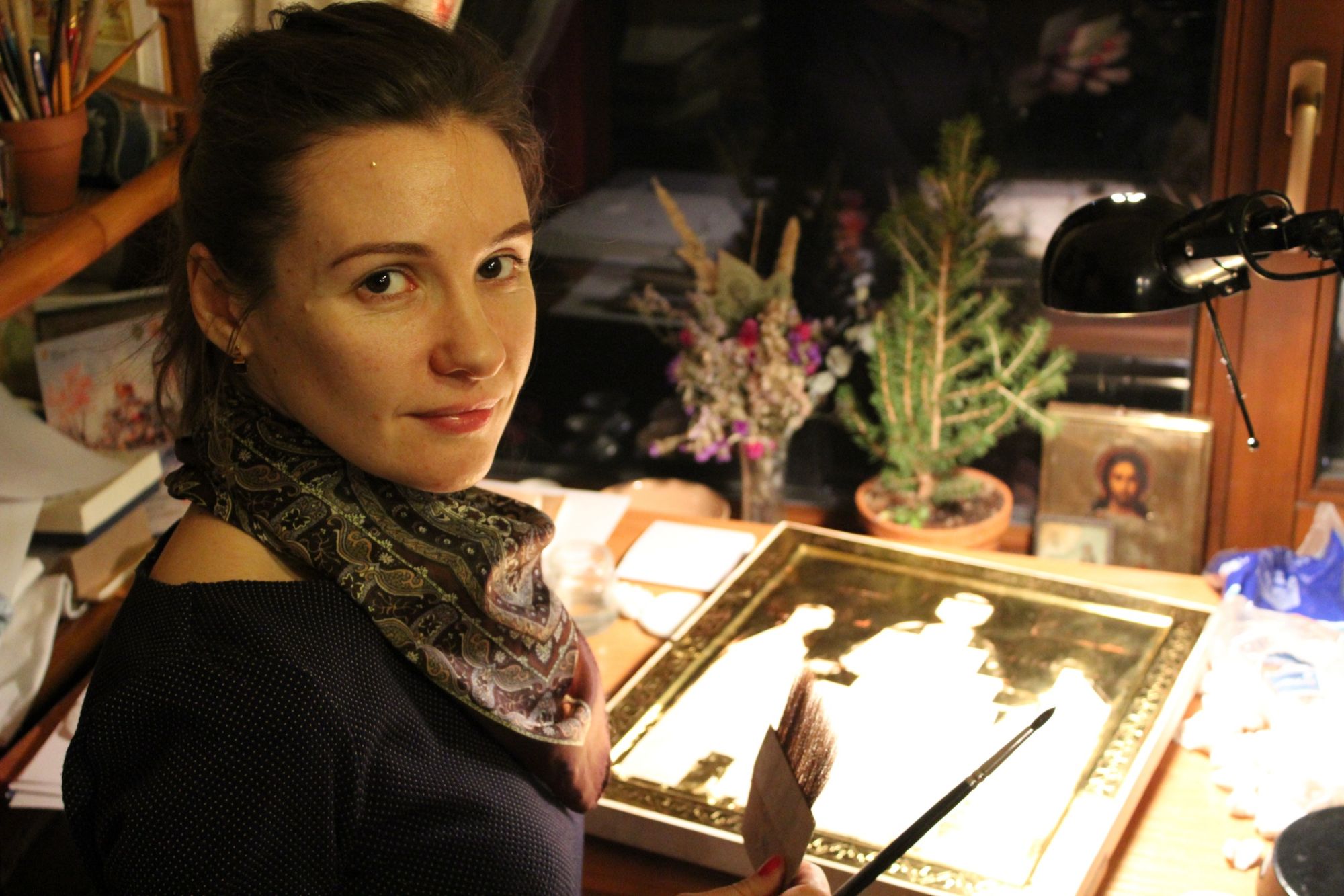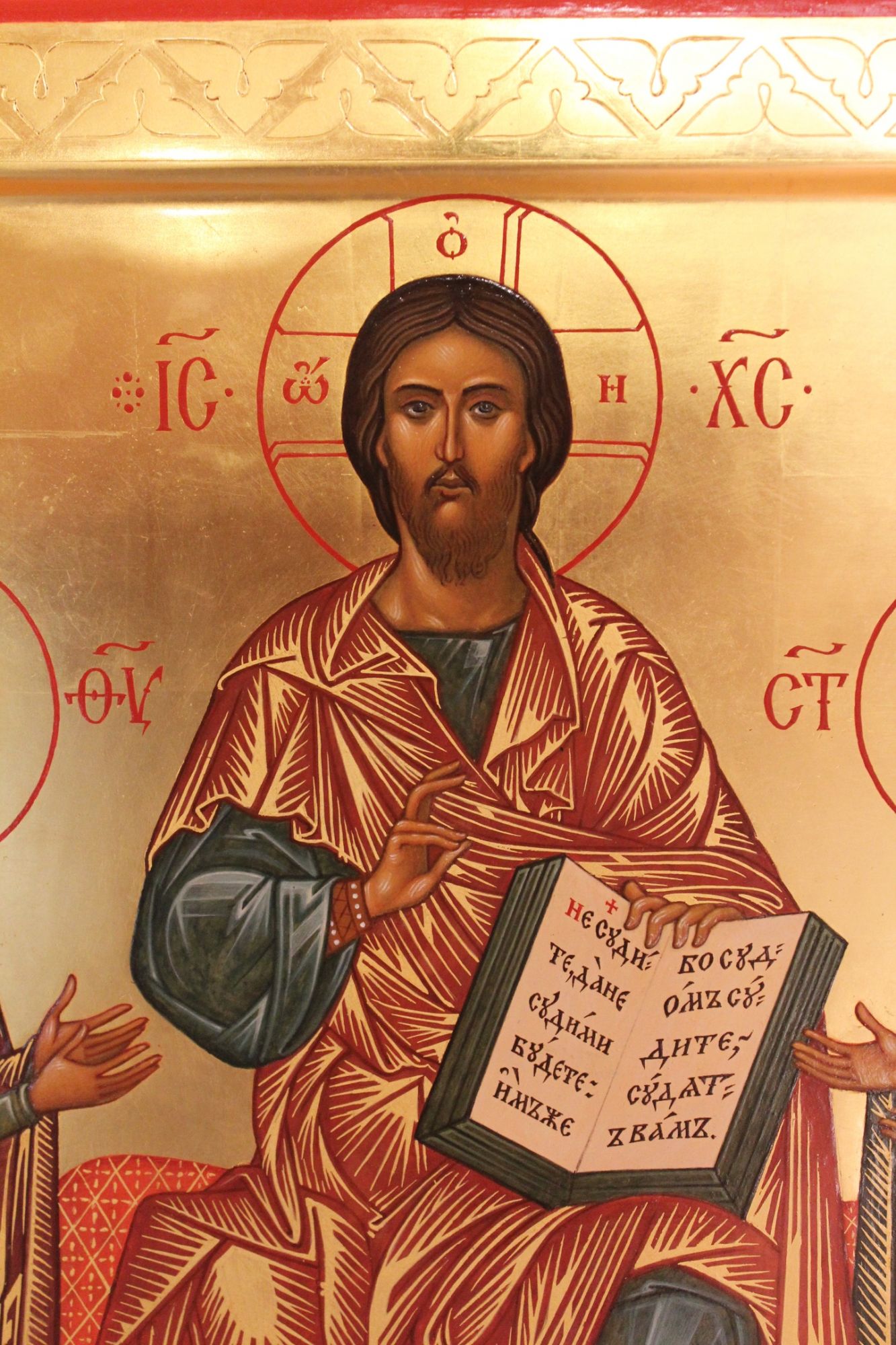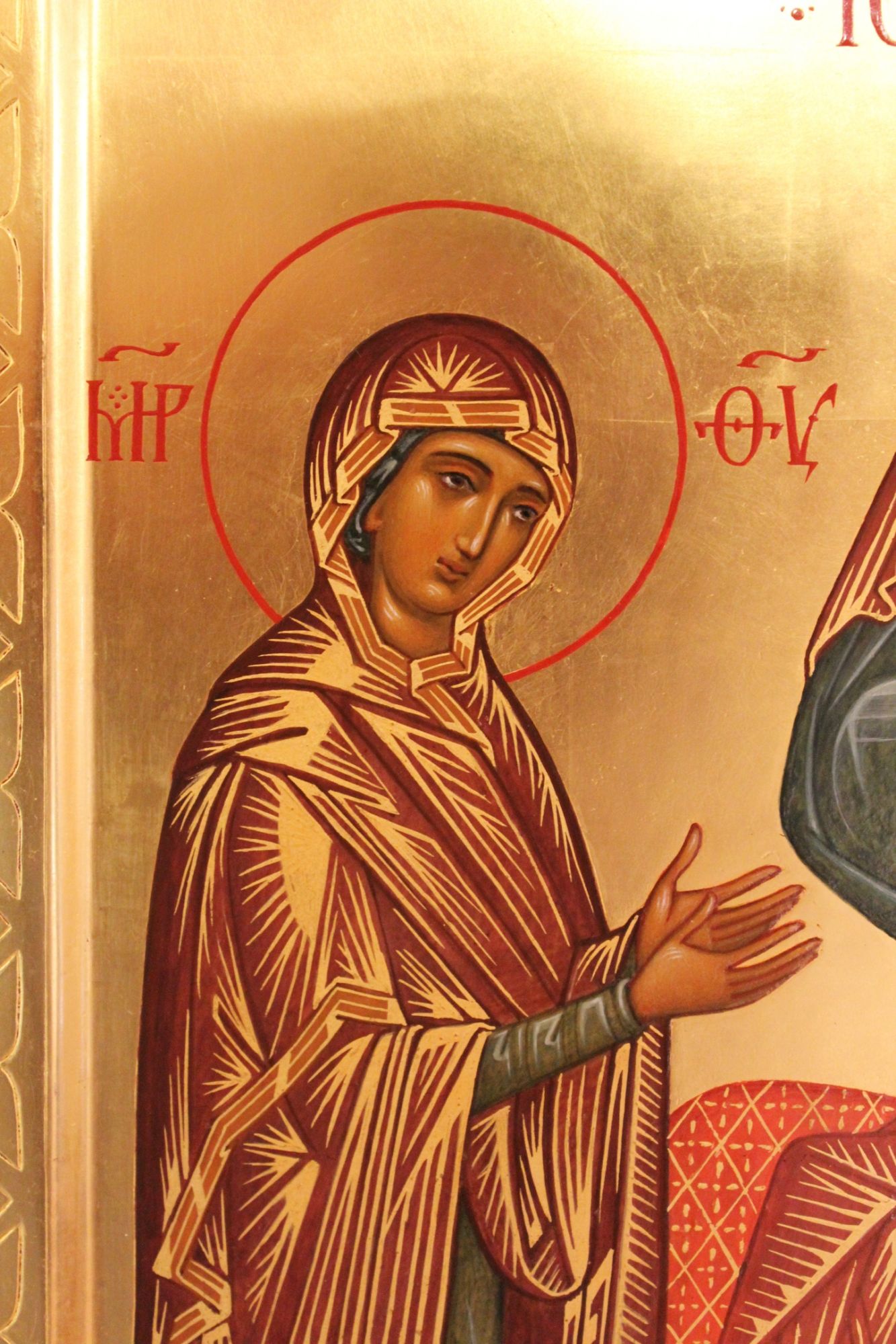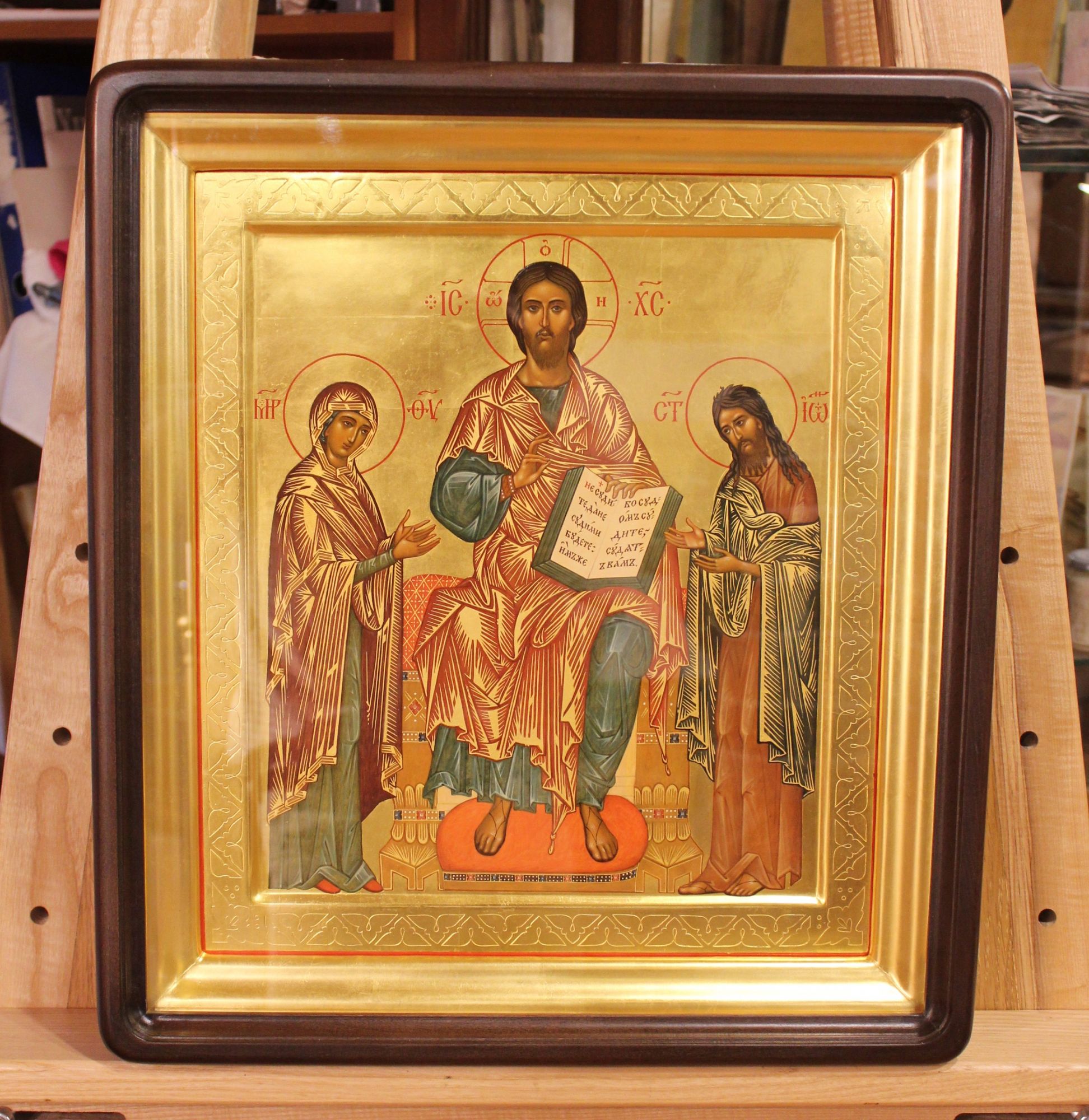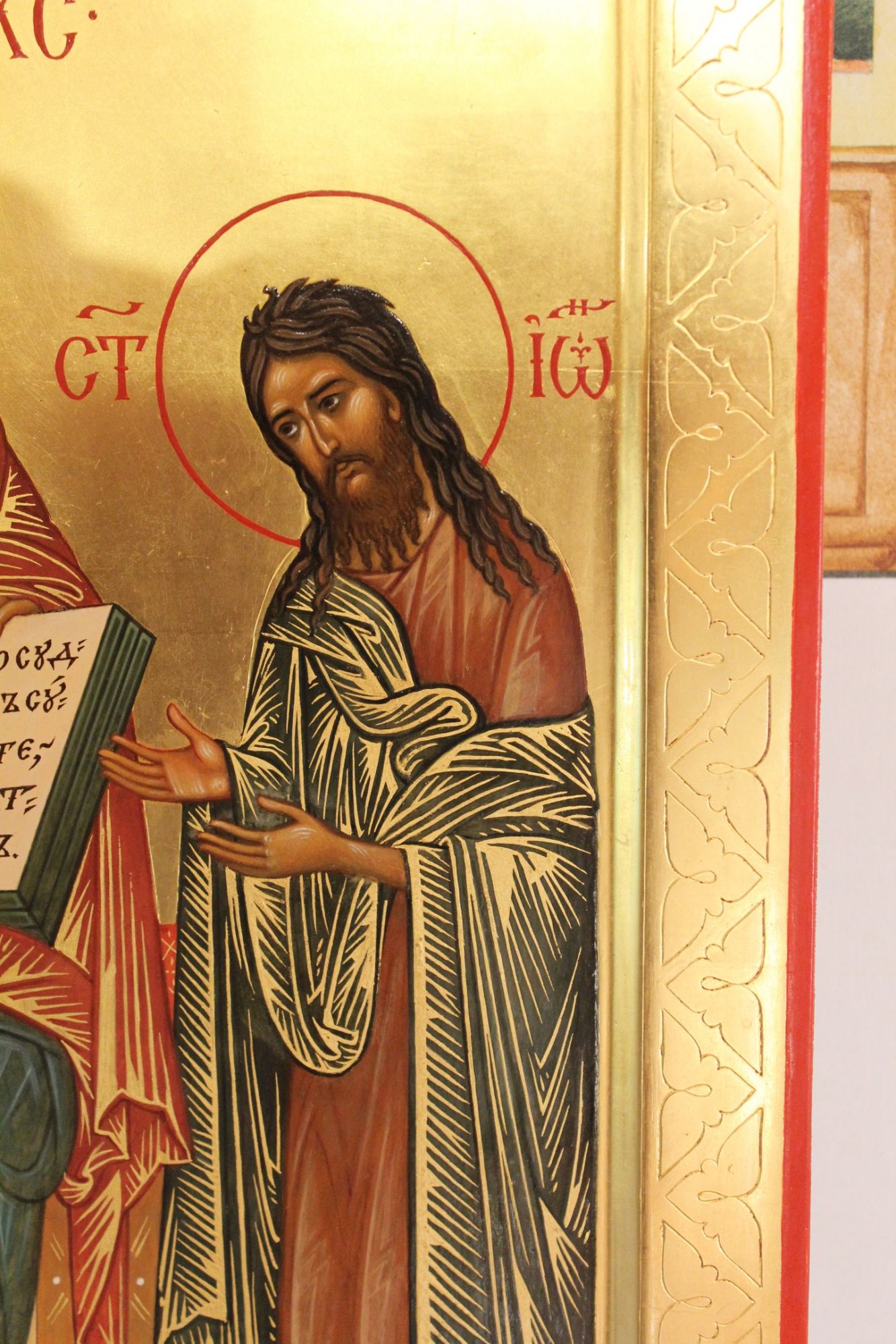 В нашей мастерской Ксения Юрьевна написала новую икону. Икона Деисусный чин, Господь восседает на троне, и ему предстоит в молитве Пресвятая Богородица и Иоанн Креститель. Иконописец Дмитрий Александрович сделал золотой асист на одеждах.