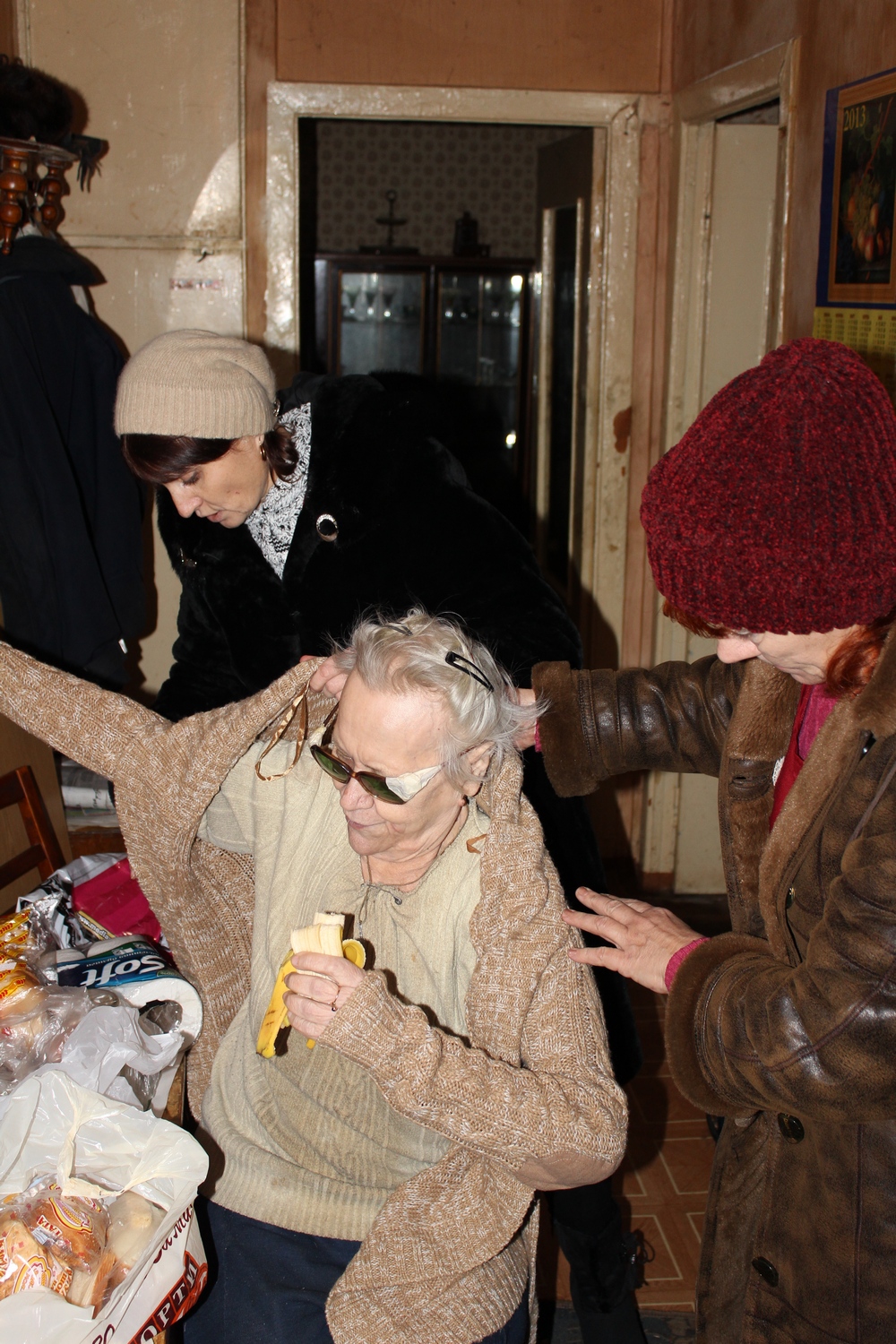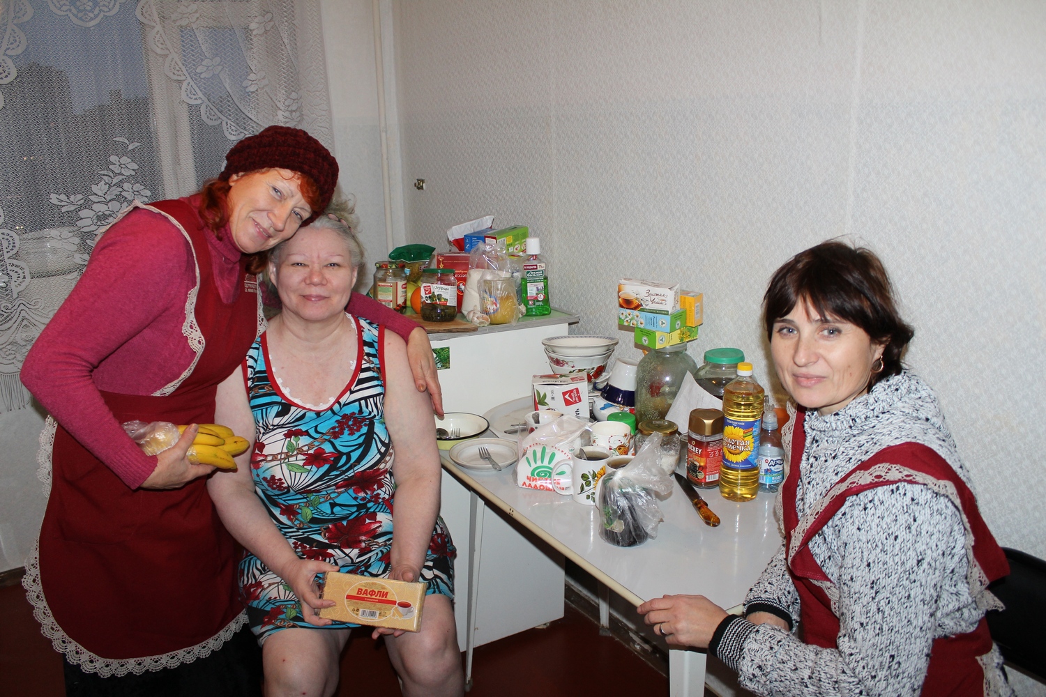 3 декабря 2014 года по благословению настоятеля протоиерея Валерия Волощука сестры милосердия посетили эти семьи. Мы привезли им продуктовые наборы, теплые вещи (свитера, шерстяные носки), храмовые памятки, иконы. Слава Богу, что Господь дает им силы, терпение и мужество! Храни их всех Господь!