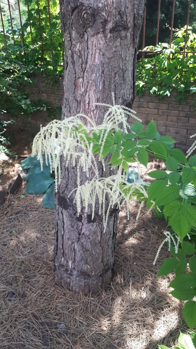 - Волжанка двудомная (козлиная борода). От пушистых метелок исходит терпкий запах мёда. У нас на приходе женский экземпляр с ажурными соцветиями.