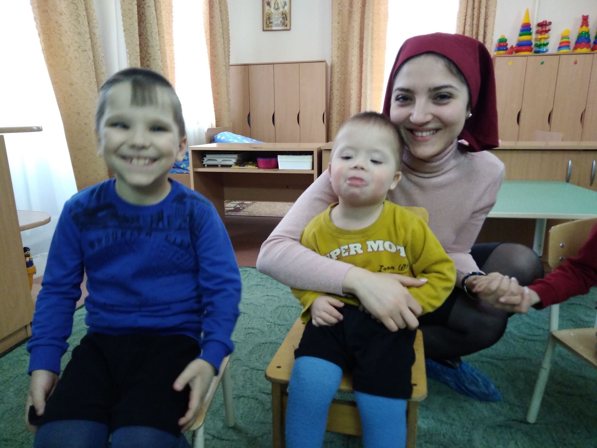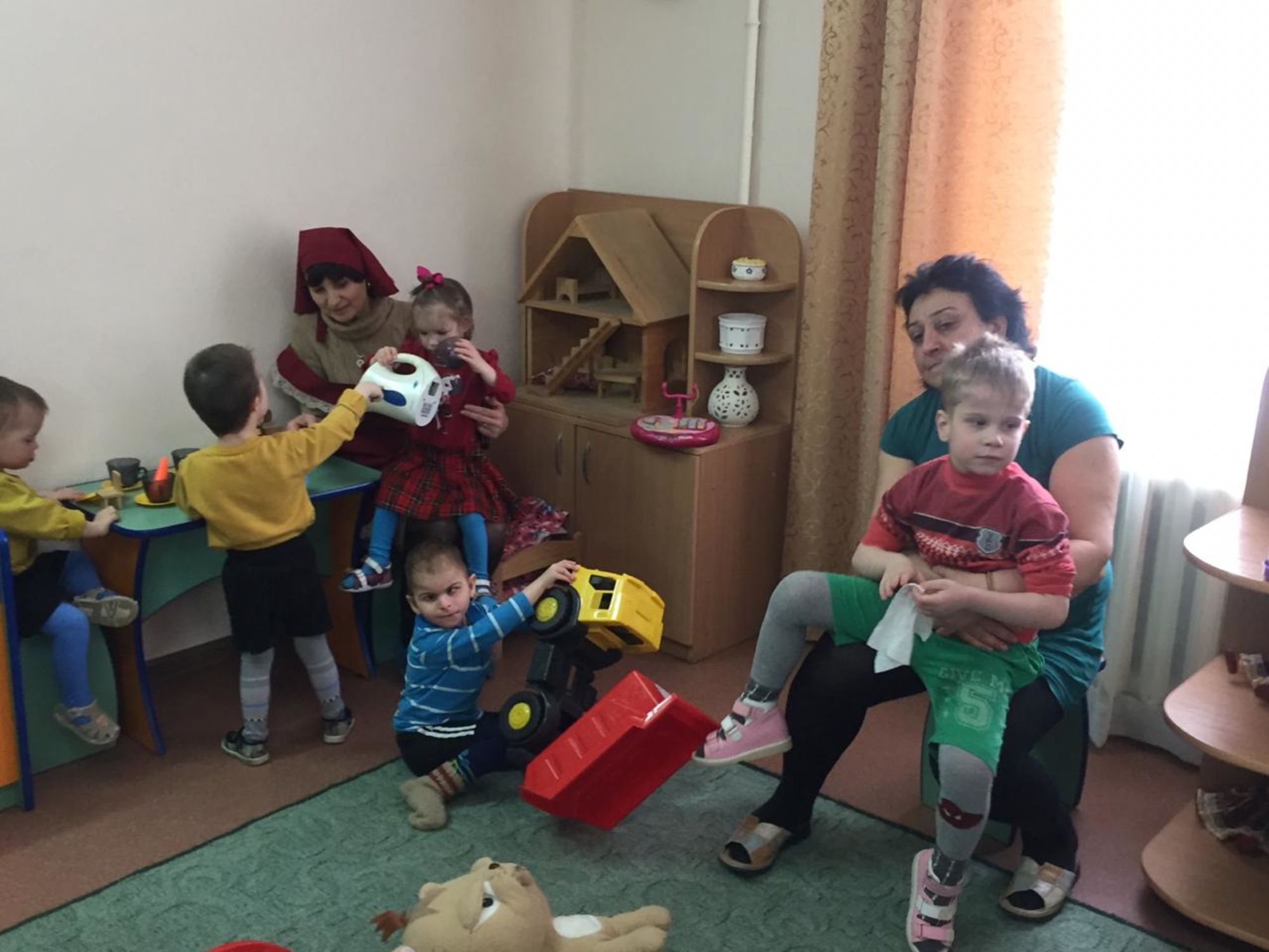 Дети-инвалиды в детском доме, куда мы ходим, очень близки к Богу. Телесно они скованы, ограничены, но душа у них открывается в другой, духовный мир. В своем слове О.Роман сказал деткам, что они должны благодарить и любить Бога. После причастия сестры милосердия играли с детками, читали им книжки. Каждому ребенку были привезены соки, сладости, фрукты. Для ограждения клумб на территории детского дома был куплен яркий желтый заборчик и стенды со словами «Добро пожаловать!»