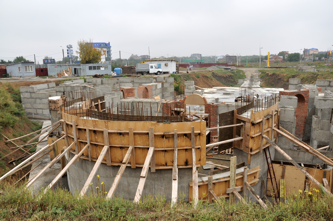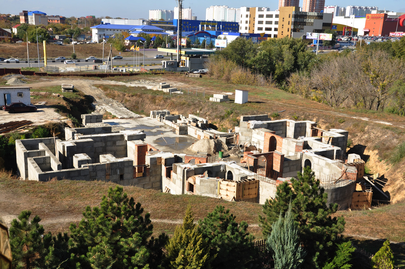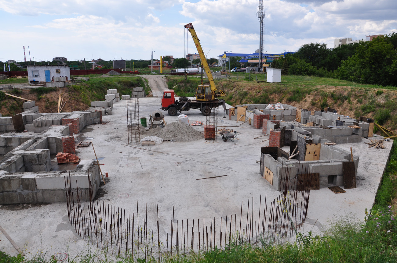 Начался монтаж стен притвора. Ведутся работы по устройству гидроизоляции стен подвала. Закончена прокладка канализационной сети. Одновременно на нашей территории ведется строительство лавки церковной утвари, литературы и помещения охраны. Сейчас заканчивается монтаж кровли, а внутри начались сантехнические работы. Нужно приложить все силы для того чтобы до наступления холодов закончить монтаж кровли лавки и достроить цокольный этаж храма.
