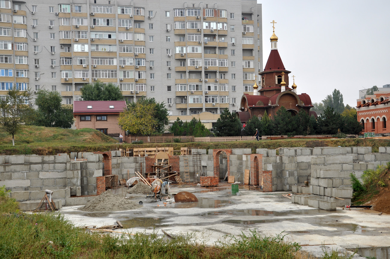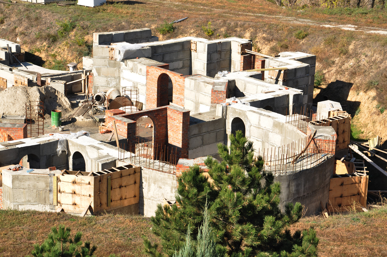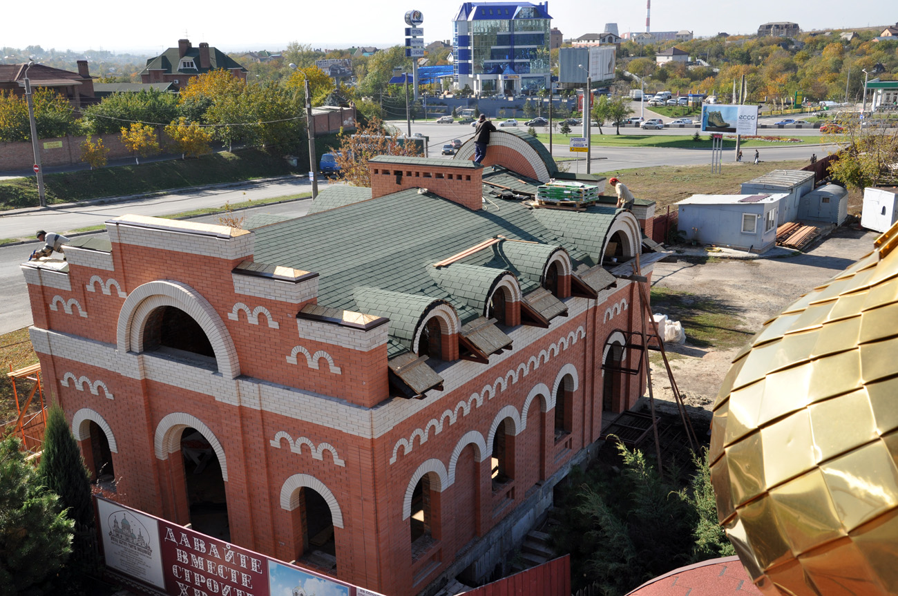 Начался монтаж стен притвора. Ведутся работы по устройству гидроизоляции стен подвала. Закончена прокладка канализационной сети. Одновременно на нашей территории ведется строительство лавки церковной утвари, литературы и помещения охраны. Сейчас заканчивается монтаж кровли, а внутри начались сантехнические работы. Нужно приложить все силы для того чтобы до наступления холодов закончить монтаж кровли лавки и достроить цокольный этаж храма.