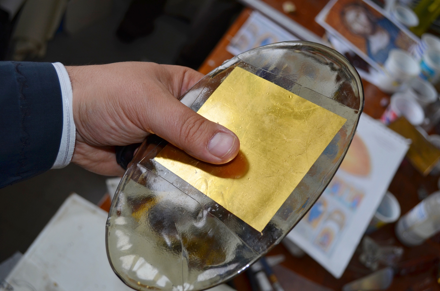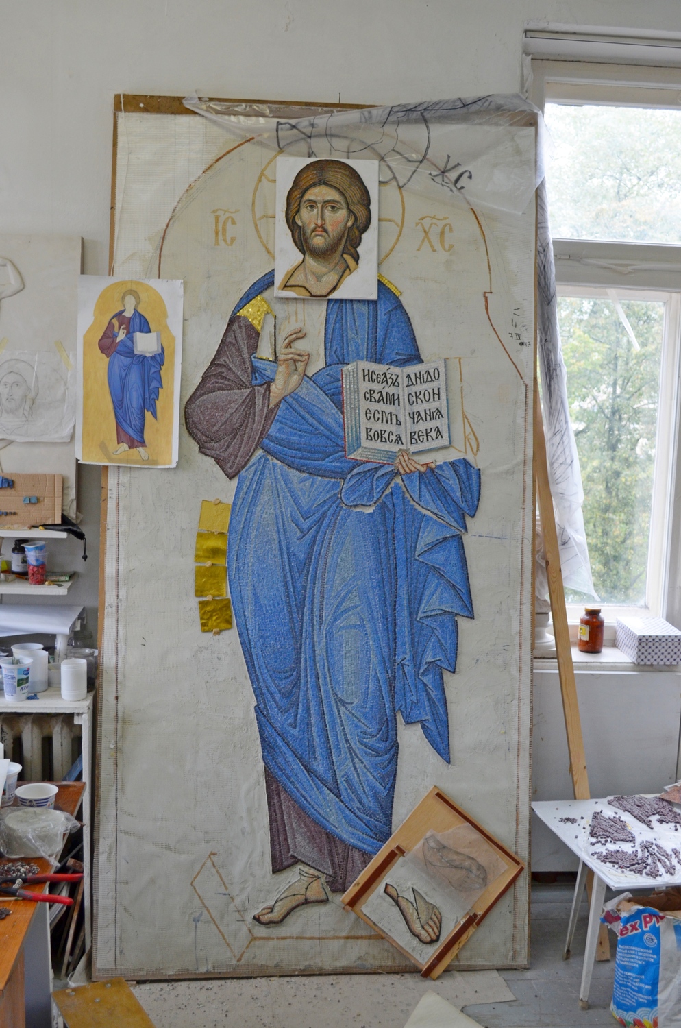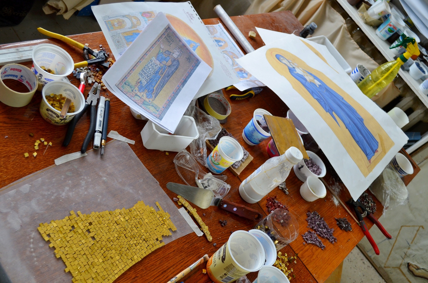 Каждый нюанс важен при изготовлении мозаичных икон. Очень трудно найти смальту подходящего оттенка. Несмотря на то, что ее варят в мастерских петербурга и италии, среди мастеров ценится мозаика, сваренная в советское время. Тяжело изготавливать золотую смальту, покрытую тончайшим слоем стекла. Львовские мастера делают это лучше всех. Золотая смальта изготавливается ручным способом по древней технологии. Производство начинается с выдувания сосудов из очень тонкого прозрачного стекла толщиной 0,1 – 0,5 мм. Это стекло режется на квадратики размером примерно 10 x 10 см - кантарели. На них укладываются золотые листы тонкой фольги. На кантарель с фольгой затем выливается горячая масса из более толстого стекла. Таким образом оба стеклянных слоя плотно соединяются и образуют золотой «блин». После этого золотые «блины» отправляются в обжиговую печь для закалки. После отжига блин режется стеклорезом и разламывается вручную.