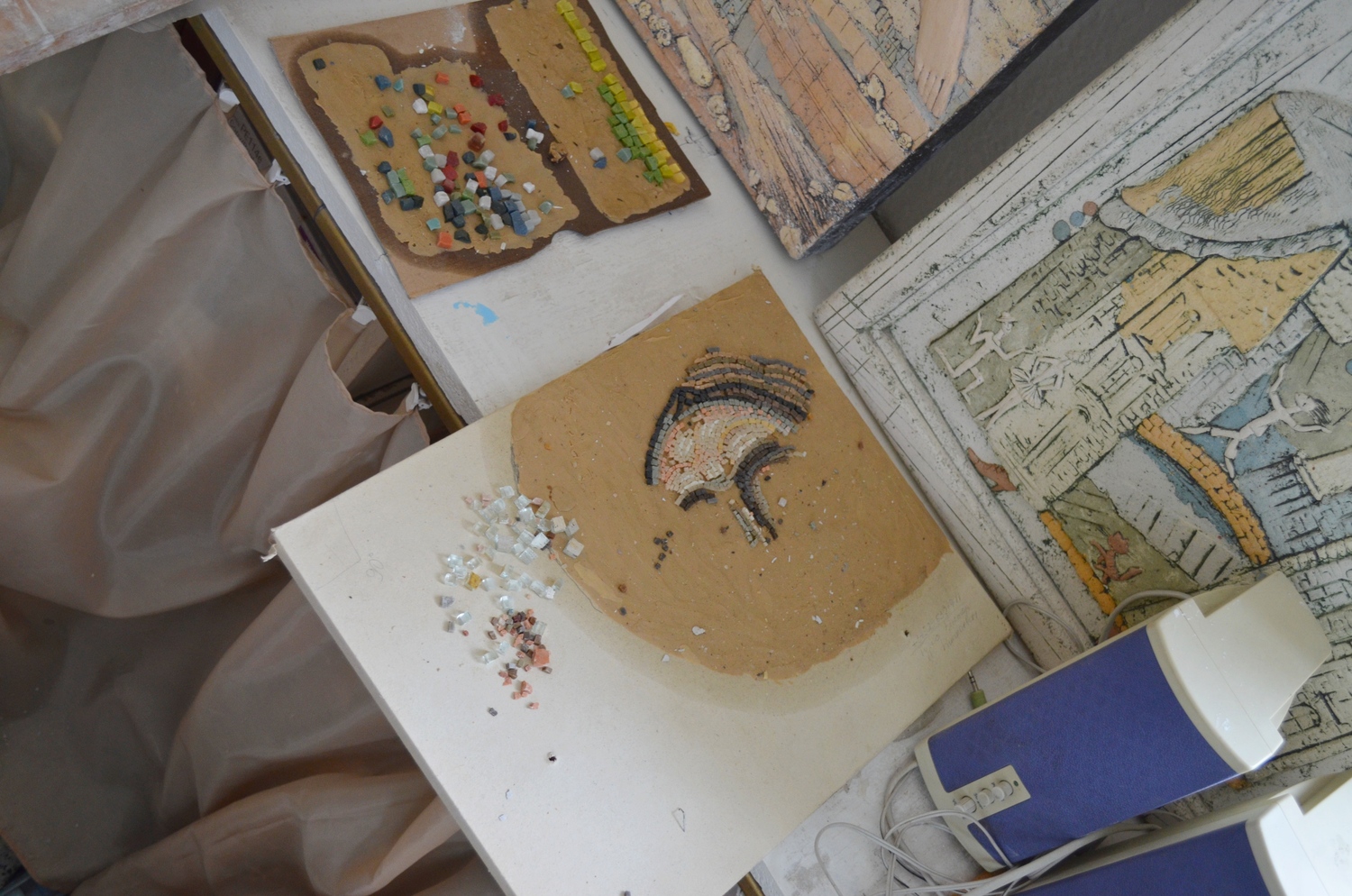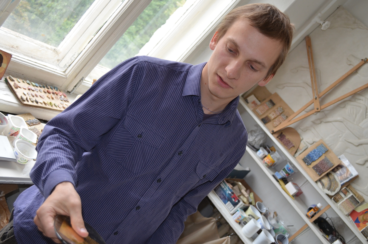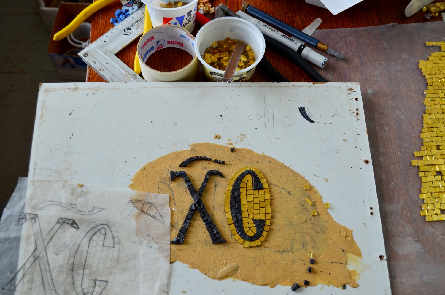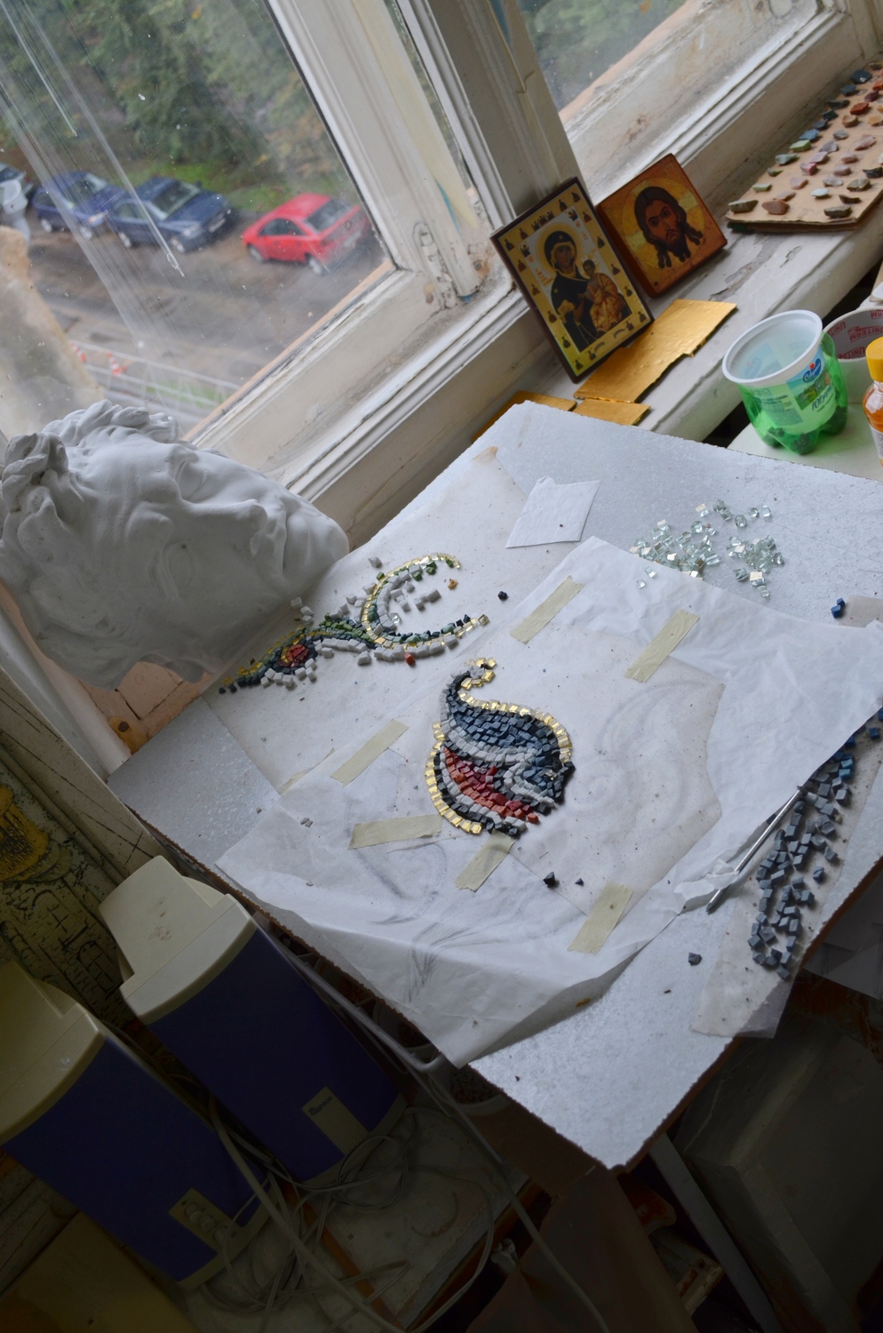 Каждый нюанс важен при изготовлении мозаичных икон. Очень трудно найти смальту подходящего оттенка. Несмотря на то, что ее варят в мастерских петербурга и италии, среди мастеров ценится мозаика, сваренная в советское время. Тяжело изготавливать золотую смальту, покрытую тончайшим слоем стекла. Львовские мастера делают это лучше всех. Золотая смальта изготавливается ручным способом по древней технологии. Производство начинается с выдувания сосудов из очень тонкого прозрачного стекла толщиной 0,1 – 0,5 мм. Это стекло режется на квадратики размером примерно 10 x 10 см - кантарели. На них укладываются золотые листы тонкой фольги. На кантарель с фольгой затем выливается горячая масса из более толстого стекла. Таким образом оба стеклянных слоя плотно соединяются и образуют золотой «блин». После этого золотые «блины» отправляются в обжиговую печь для закалки. После отжига блин режется стеклорезом и разламывается вручную.