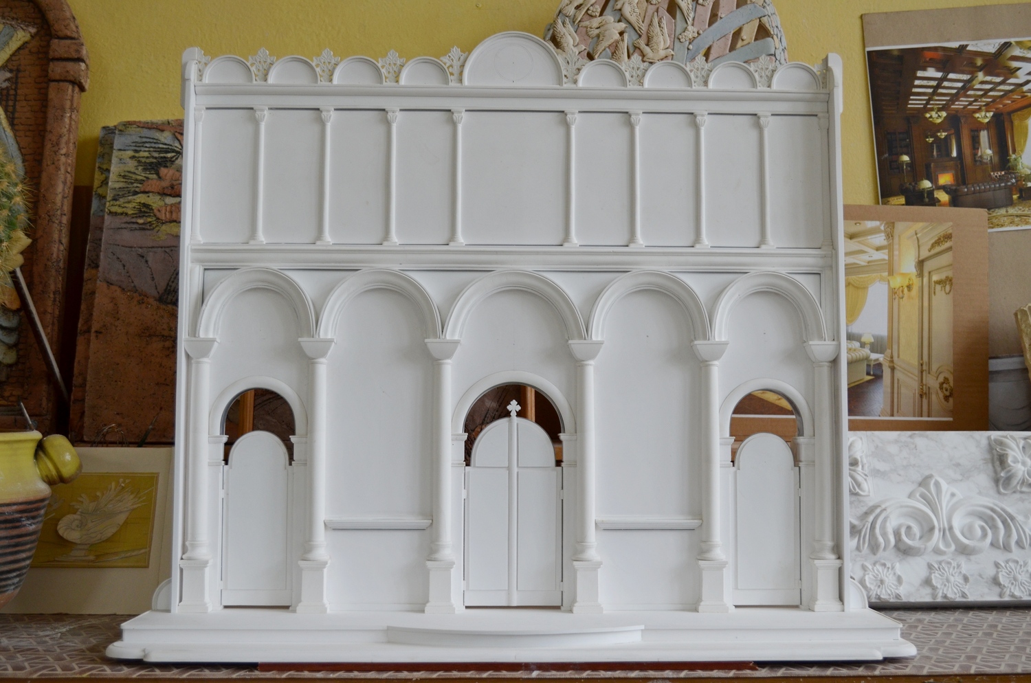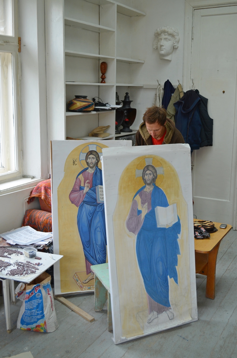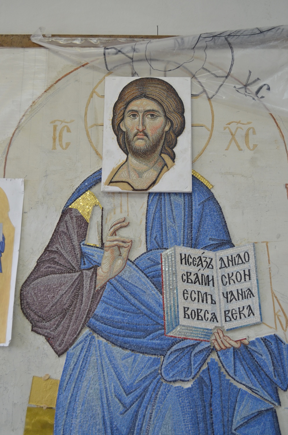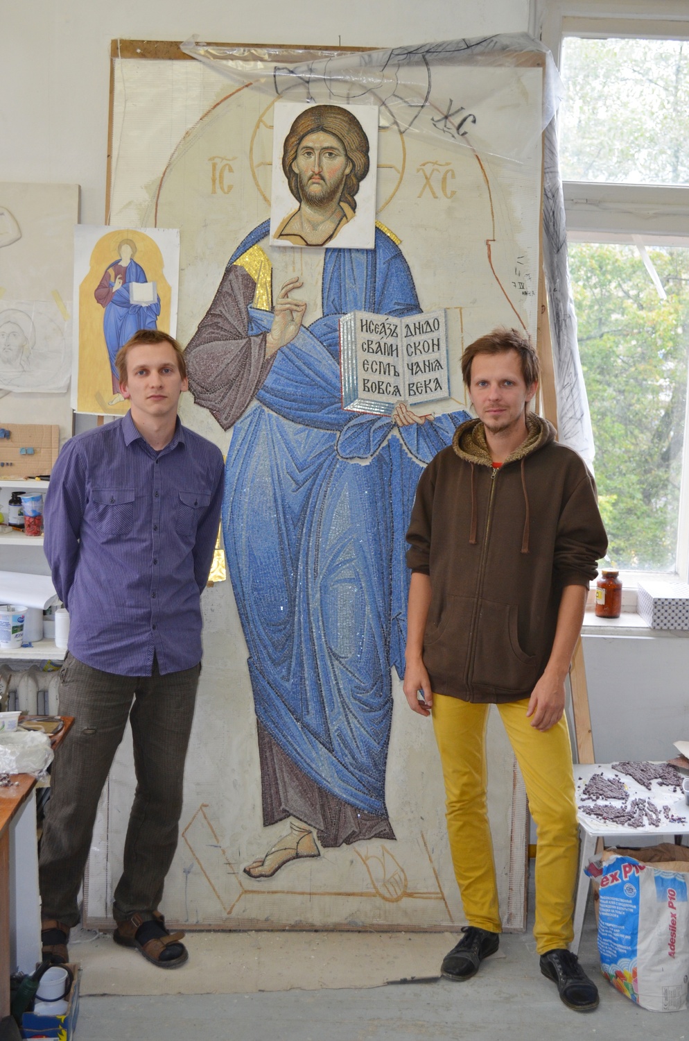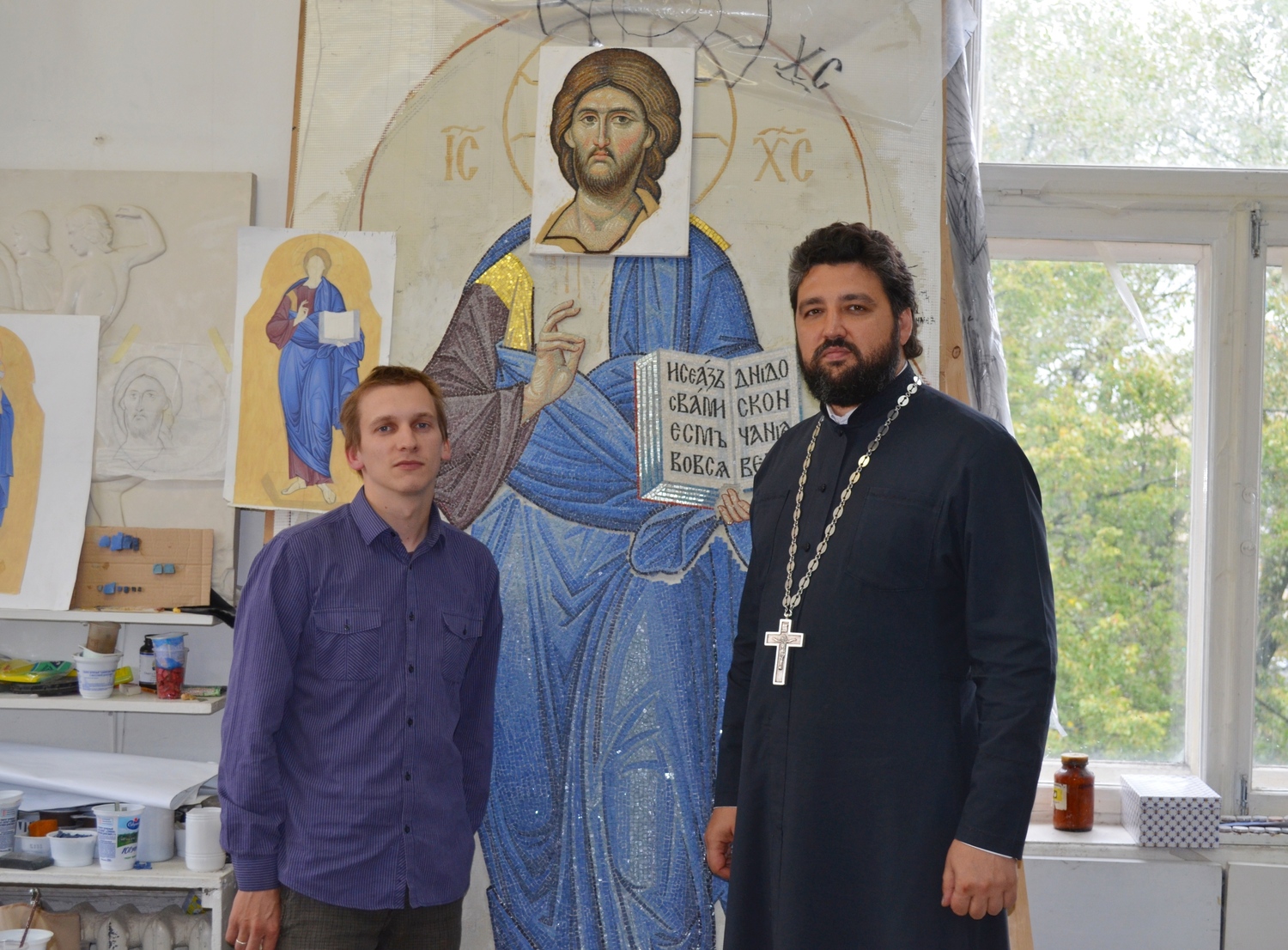 Продолжается работа над мозаичными иконами и макетом иконостаса. В дни успенского поста настоятель прихода протоиерей Валерий Волощук встретился с мастерами-мозаичистами в Беларуси. Тема встречи - завершение первой иконы в иконостасе главного храма комплекса в честь святого Георгия Победоносца - образа нашего Спасителя Иисуса Христа. Мастера работали над ним очень долго. Уникальность работы в том, что иконостасы редко исполняются полностью в мозаике, тем более очень мелкомодульной. Автор проекта - руководитель Центра храмового искусства имени прп. Андрея Рублева, советник патриарха Александр Солдатов - лично изготовил основу для иконостаса. За образец былы взяты мозаики монастыря Хора Константинополя (XIV век). Сохранившиеся до наших дней они считаются лучшими в мире. Выкладывает мозаики ученик школы Минского Елизаветинского монастыря мастер Александр Ясюкайть.