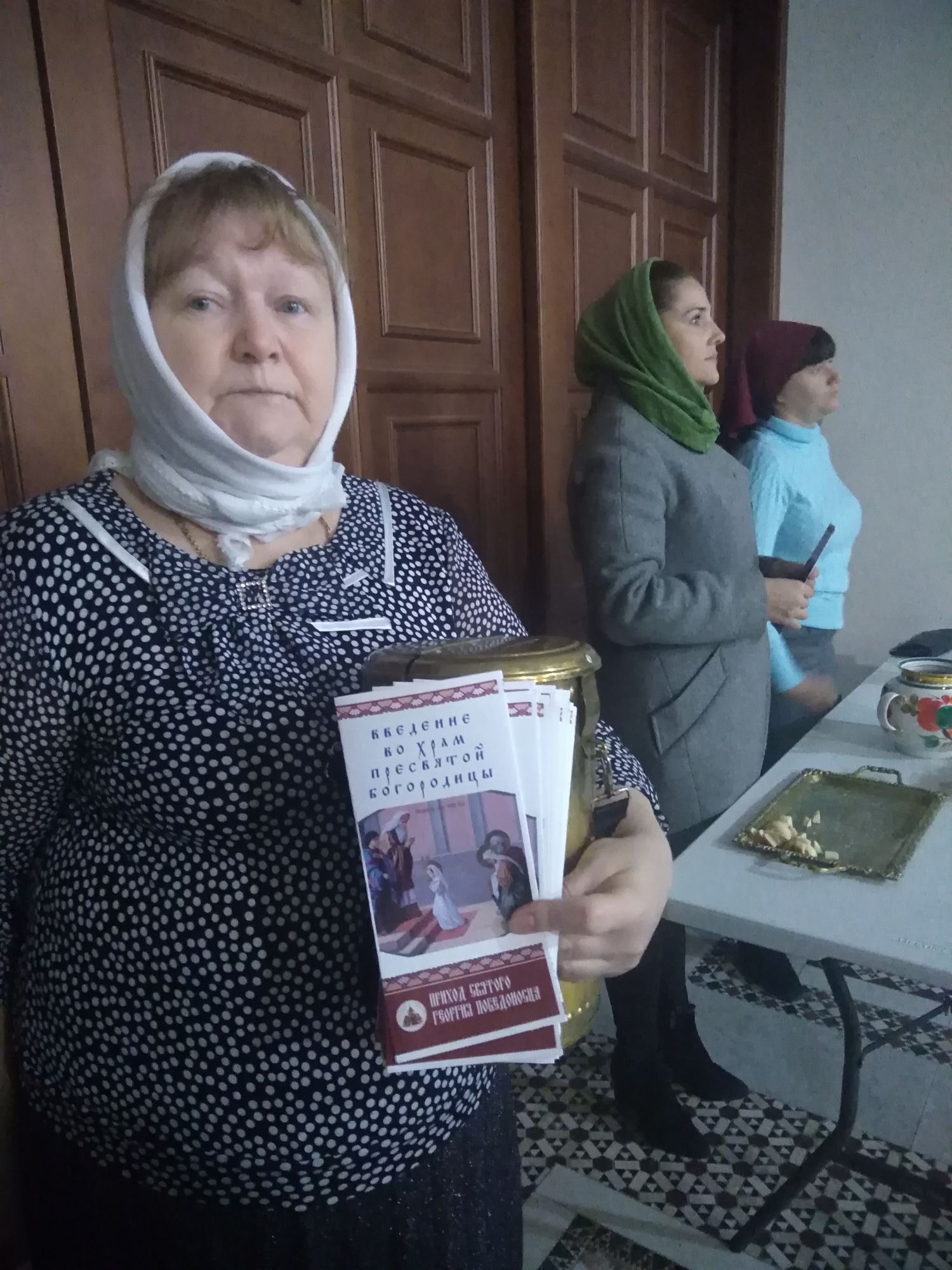 Сестры милосердия храма Иоанна Воина несут не только послушания социального характера, но и занимаются катехизаторскою деятельностью. После богослужения раздают приходские памятки, рассказывают прихожанам о праздниках и о святых. Наши сестры по благословению настоятеля храма несут послушание в свечной лавке, на трапезной, дежурят на подсвечниках, на раздаче просфор и запивки. После окончания литургии сестры сделали общую фотографию со своим духовником протоиереем Валерием Волощуком. Настоятель подарил всем памятные браслеты с изображением святого Георгия Победоносца.