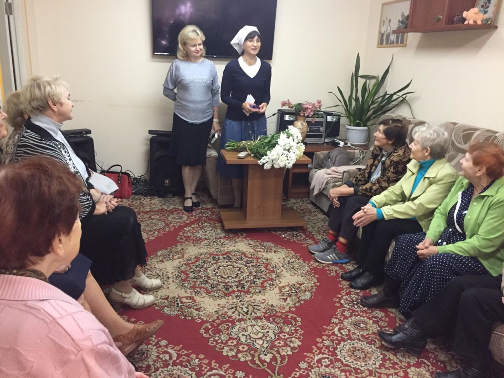 Также сестры милосердия посетили пенсионеров из Центра социального обслуживания граждан пожилого возраста и инвалидов Советского района г.Ростова-на-Дону. В отделении дневного пребывания пенсионеров Валентина Кижикина рассказала об истории праздника. Каждому был вручен букет из осенних цветов.