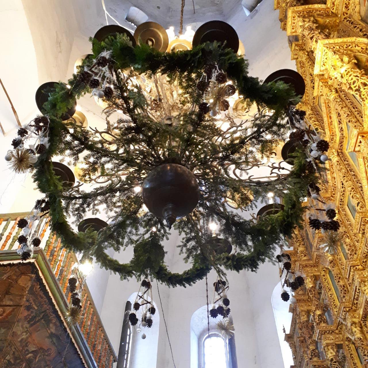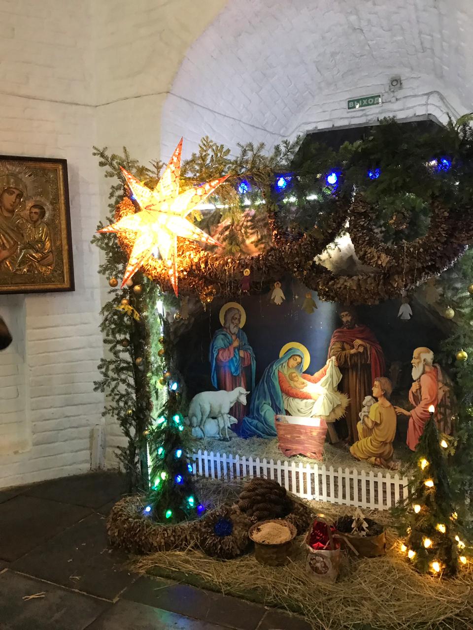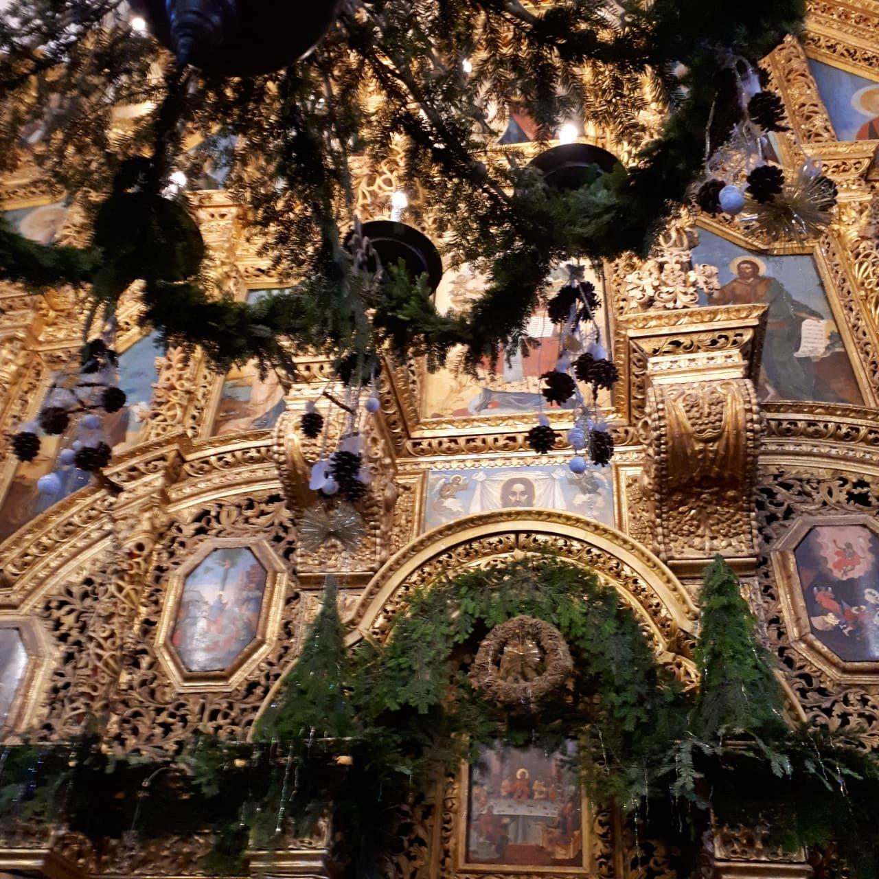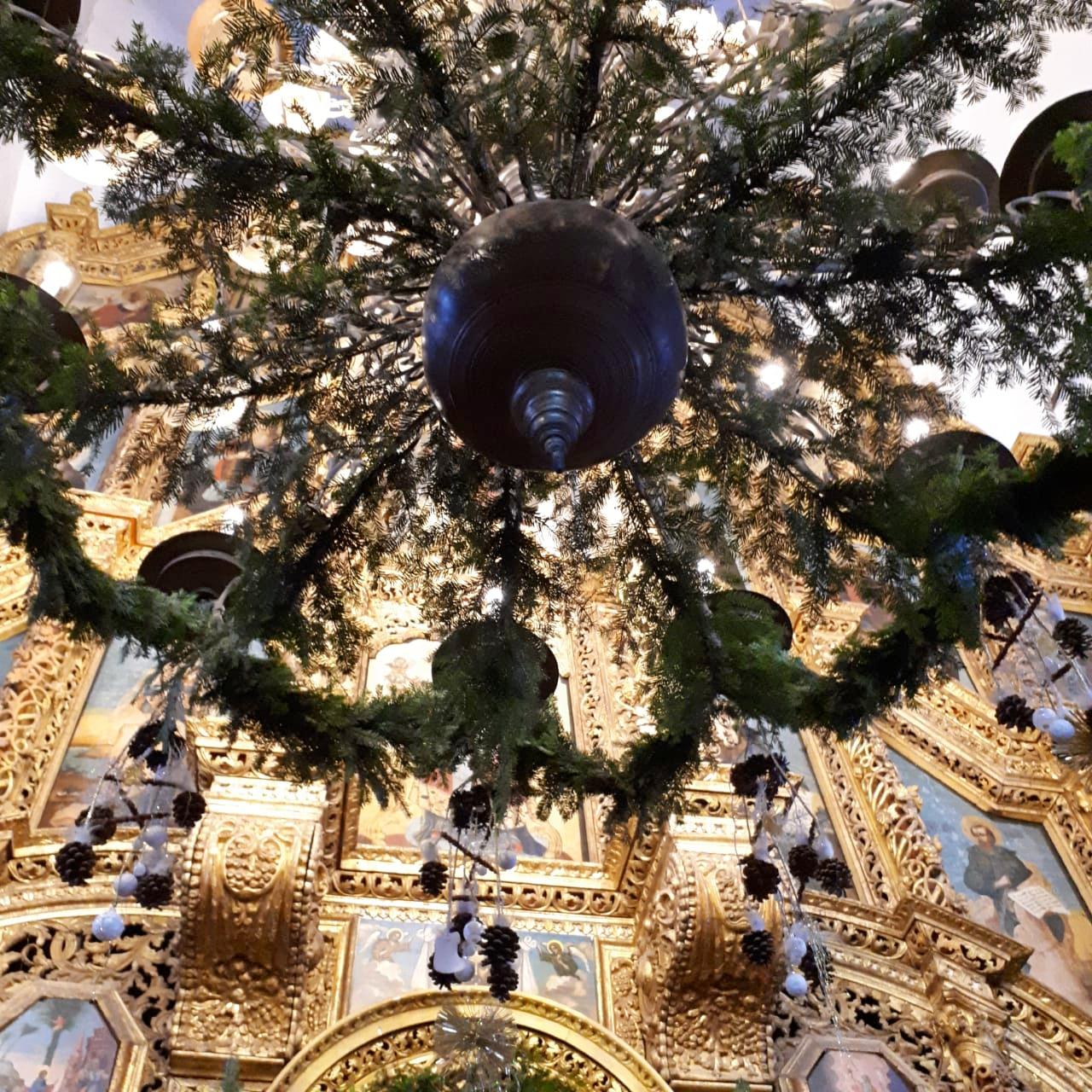 Работники флористической мастерской и наши прихожане украсили Воскресенский войсковой собор к празднику Рождества Христова. Использовались только натуральные природные материалы. В северном пределе был установлен вертеп, украшенный еловыми ветвями, гирляндами из листьев, фонариками и игрушками.