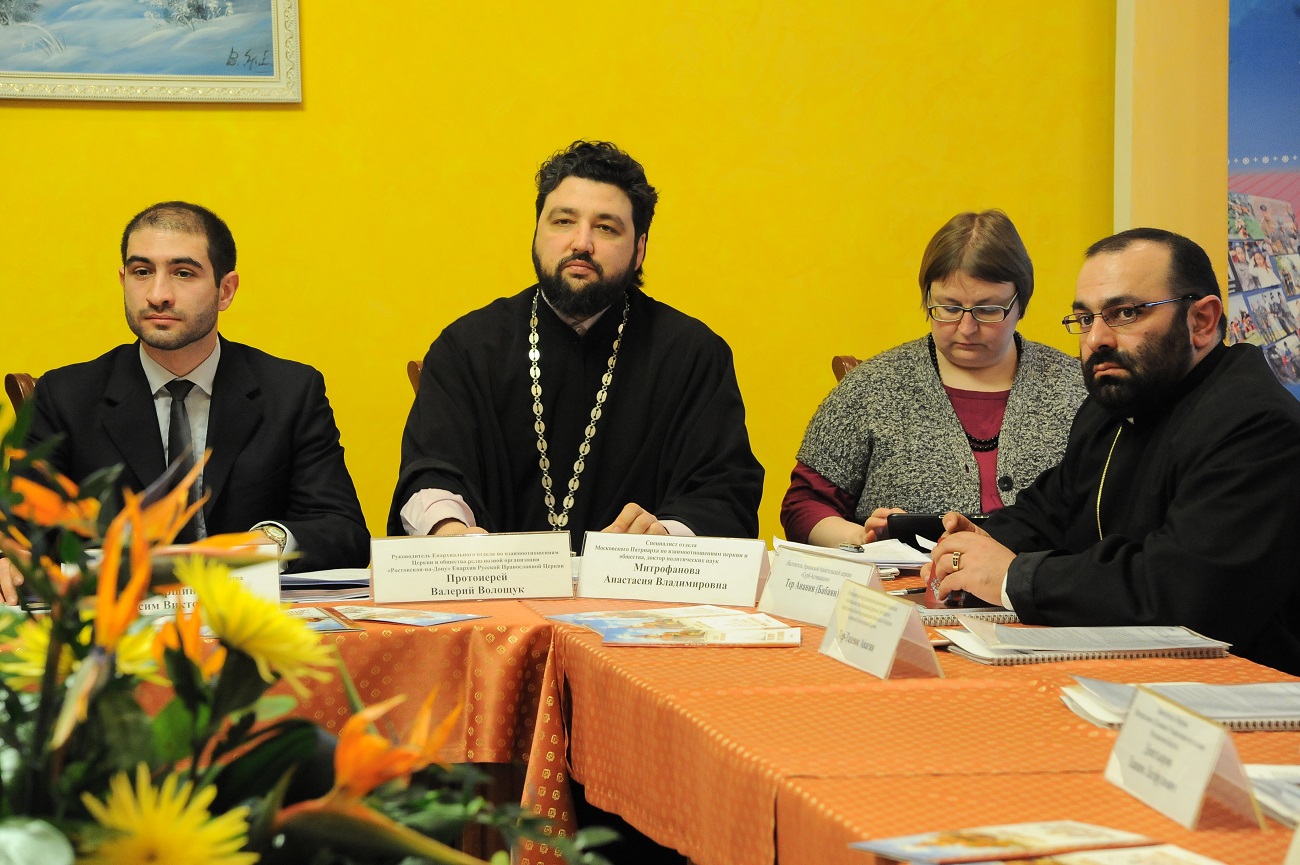 На совещании рассматривались вопросы совместной работы Отдела по взаимоотношениям Церкви и общества епархий Донской митрополии и УФМС в сфере социально-культурной адаптации мигрантов, а также создания курсов русского языка для приезжих.