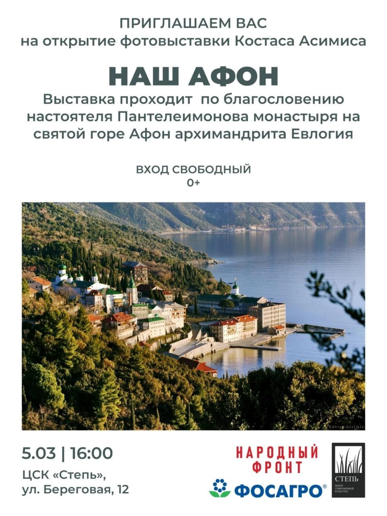 5 марта 2024 года в ЦСК «Степь» состоялось открытие фотовыставки Костаса Асимиса «Наш Афон». В открытии фотовыставки приняли участие юнармейцы казачьей разведгруппы «Георгиевцы» — воспитанники приходской воскресной школы храма Святого Георгия Победоносца (Главного храма Южного военного округа МО РФ), занимающиеся по программе «Уроки мужества» (Начальная военная подготовка к службе в Российской армии), их родители и инструкторы-наставники.