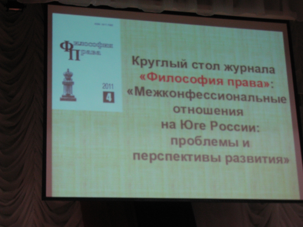5 октября 2011 г. по инициативе редакции научно-теоретического журнала «Философия права» (главный редактор — начальник Ростовского Юридического Института МВД России, кандидат исторических наук, доцент Барковский Геннадий Францевич), в здании РЮИ для курсантов и преподавателей института был организован Круглый стол «Межконфессиональные отношения на Юге России: проблемы и перспективы развития». Председательствовал заместитель редактора журнала Верещагин Виктор Юрьевич.