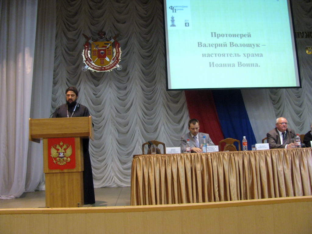 Представитель Ростовского Духовно-патриотического центра святого Георгия Победоносца, начальник кафедры истории государства и права РЮИ МВД России, доктор юридических наук, профессор Овчинников Алексей Игоревич выступил с докладом о юридических аспектах межконфессиональных отношений.
