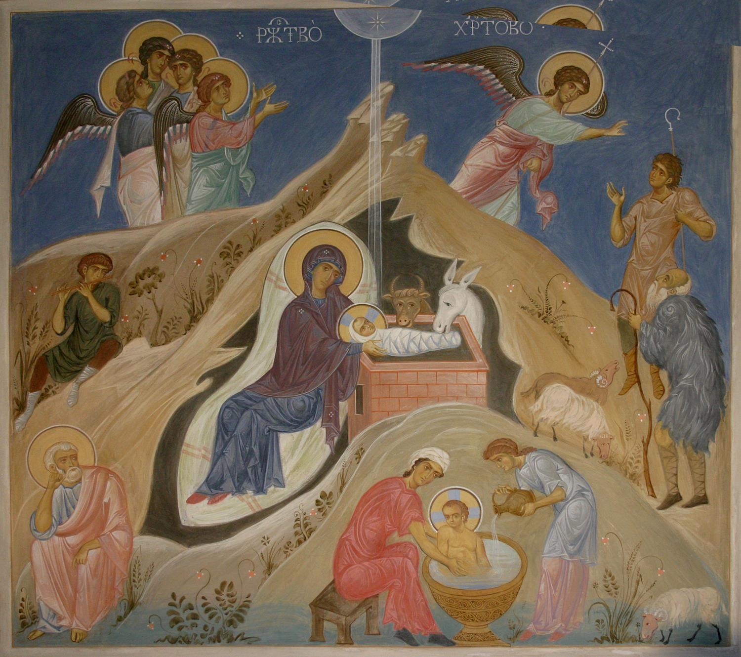 За основу композиции была взята икона Рождества Христова из росписей храма в городе Нерехта, автором которых является известный иконописец Анатолий Алёшин. Что бы получить композицию хорошего качества настоятель прихода, протоиерей Валерий Волощук, связался с автором и получил оцифрованную икону. На ее основе и был выполнен проект. И как это обычно бывает, благое дело не обходится без искушений. В предпраздничной суете забыли распечатать одну из частей композиции. На выручку пришли мастера из иконописной мастерской, недостающие части были дописаны Владимиром Мирошниченко. Завершили композицию украшением из елей и организацией подсветки всего вертепа наши хорошие друзья, флористы из салона цветов «Флорин». Так же в создании вертепа приняли участие несколько приходских семей.