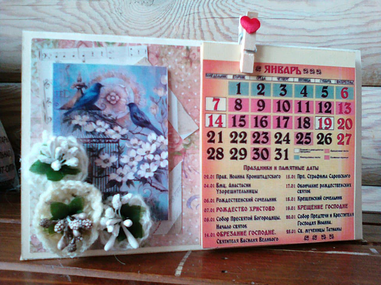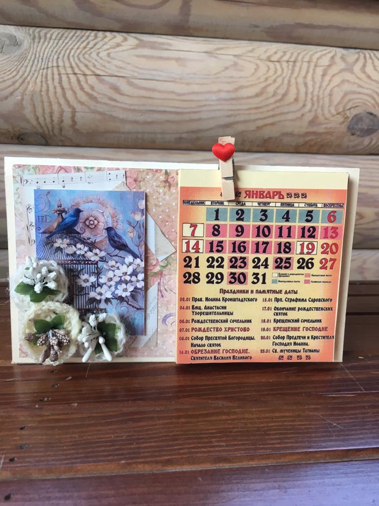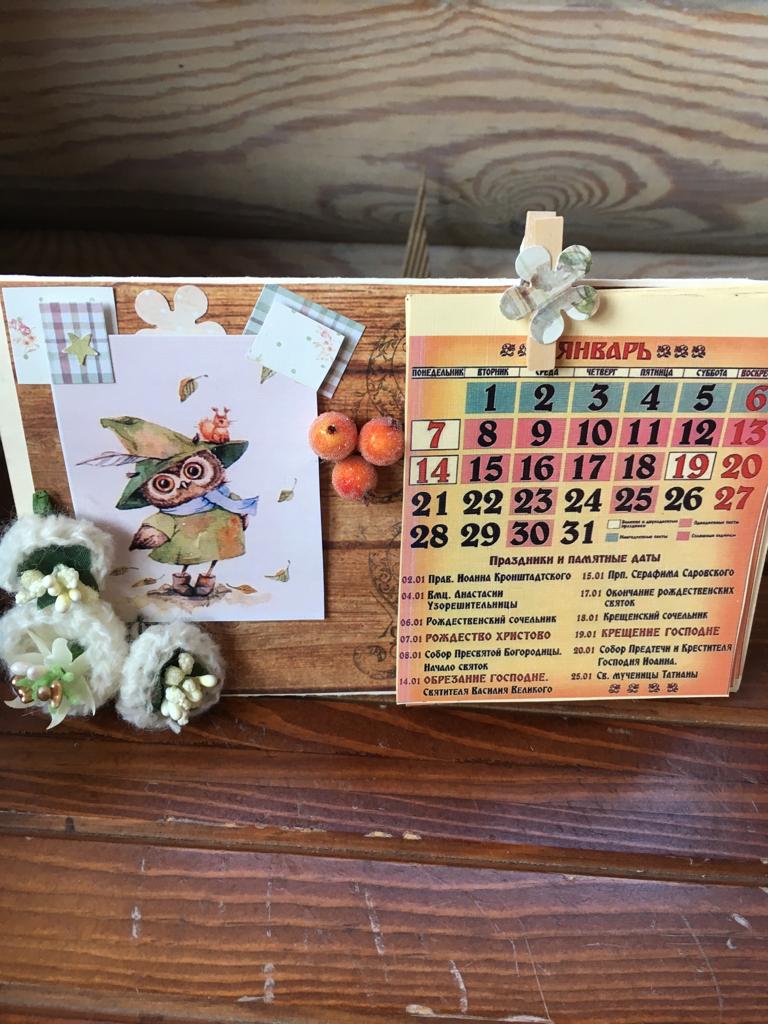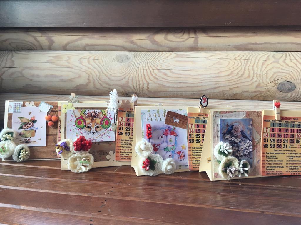 5 января 2019 года на нашем приходе прошёл мастер класс по созданию настольного откидного календаря. В календаре отмечены все православные праздники и посты, есть место для важных заметок. Украсили его забавными картинками, авторскими цветами ручной работы, ягодками и тесемочками. Все работы получились интересными и неповторимыми! Ждем вас на наших творческих встречах!