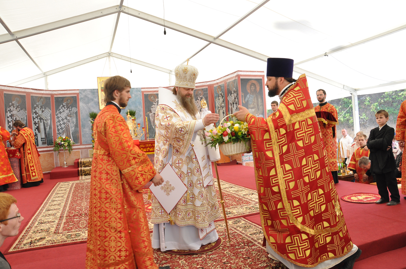 По окончании литургии настоятель прихода протоиерей Валерий Волощук горячо поблагодарил архиерея за совершение совместного праздничного богослужения и преподнес в подарок крест, вырезанный из дерева мастерами прихода. Митрополит Меркурий обратился к присутствующим с архипастырьским словом: "Сегодняшняя литургия, которую мы совершили на стилобатной части строящегося храма открывает новую жизнь этому святому месту. Мы стоим на этом месте, которое освящено под место селения славы Божией уже несколько лет тому назад. Огромная работа сделана по укреплению почвы, по заливке фундаментной плиты, по сплочению прихода... Но как мы чаем в сердце своем увидеть воздвигнутыми и завершенными в строительстве стены дома Божия, как мы чаем вознести в нем молитвы... Я абсолютно уверен в том, что нашу сегодняшнюю общую молитву слышал Господь, видел наше усердие, видел наш труд, видел нашу надежду на то, что вырвется своими стенами храм Божий из земли, дабы словом Божиим, произносимым в его стенах, голосом колокольным, словом пастырским возновлять народ Божий, привлекать его к делам добрым и спасительным, спасительным для души и полезным для Отечества. Я абсолютно уверен в том, что начиная с сегодняшней Литургии и каждый раз, когда мы будем совершать молитву на этом святом месте, вместе с нами будет покровитель этого места – святой великомученик Георгий, – просящий Бога преклонить Свою любовь и милость к нам, даровать нам помощь, вразумление, просветить наши мысли. И я абсолютно уверен в том, что сегодняшняя наша молитва очень и очень многих людей просветит духовно и дарует им ведение и разумение необходимости скорейшего возведения этого Дома Божия".